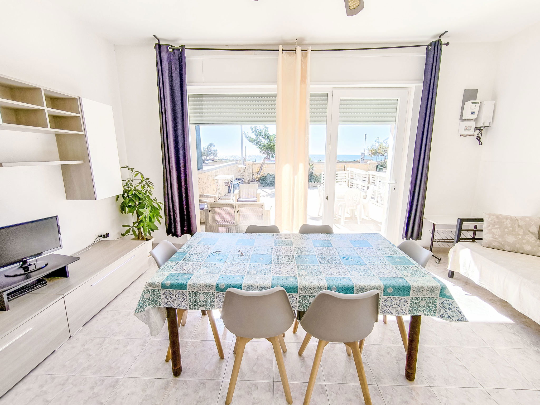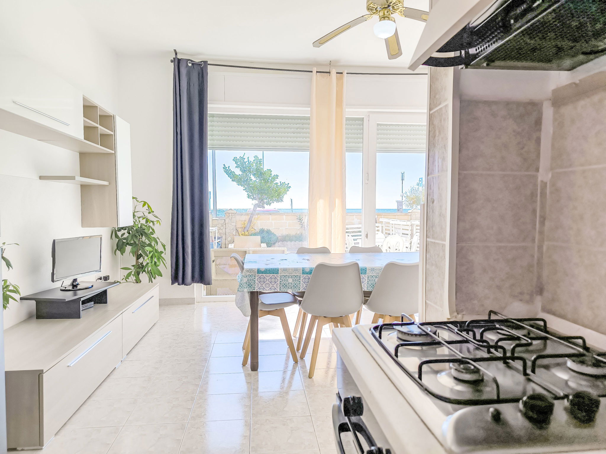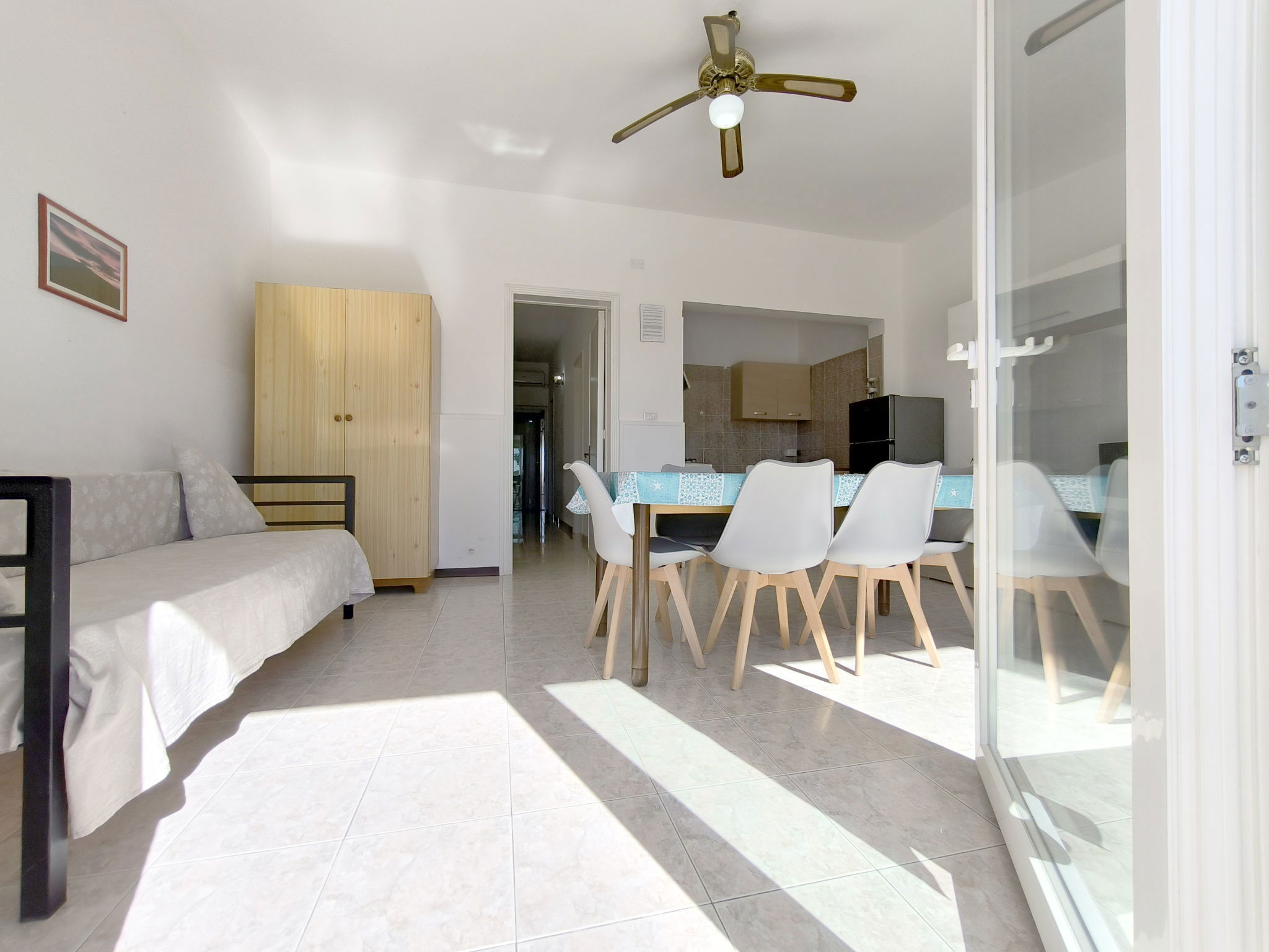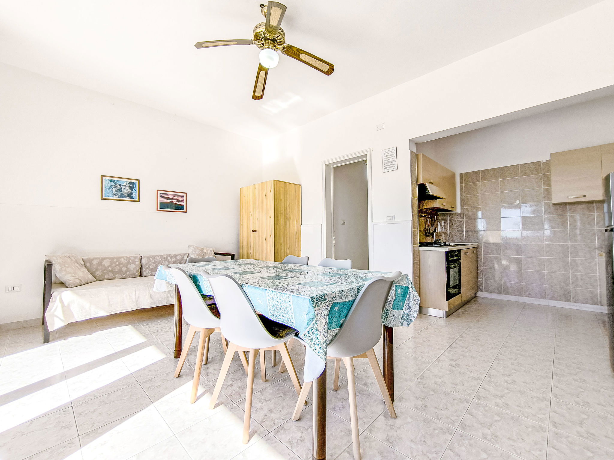 3-room apartment 65 m2, on the ground floor. Practical furnishings: living/sleeping room with 1 sofabed, dining table and fan. Exit to the patio. Walk-through room with air conditioning and forced-air heating. 1 room with 1 double bed and fan. 1 room with 2 beds and fan. Open kitchen (oven, 4 gas rings). Shower/bidet/WC. Heating not available in all rooms. Patio. Terrace furniture. View of the sea. Parking (fenced 1 car) at the house. Please note: maximum 1 pet/ dog allowed. Private entrance. IT075090C200101545