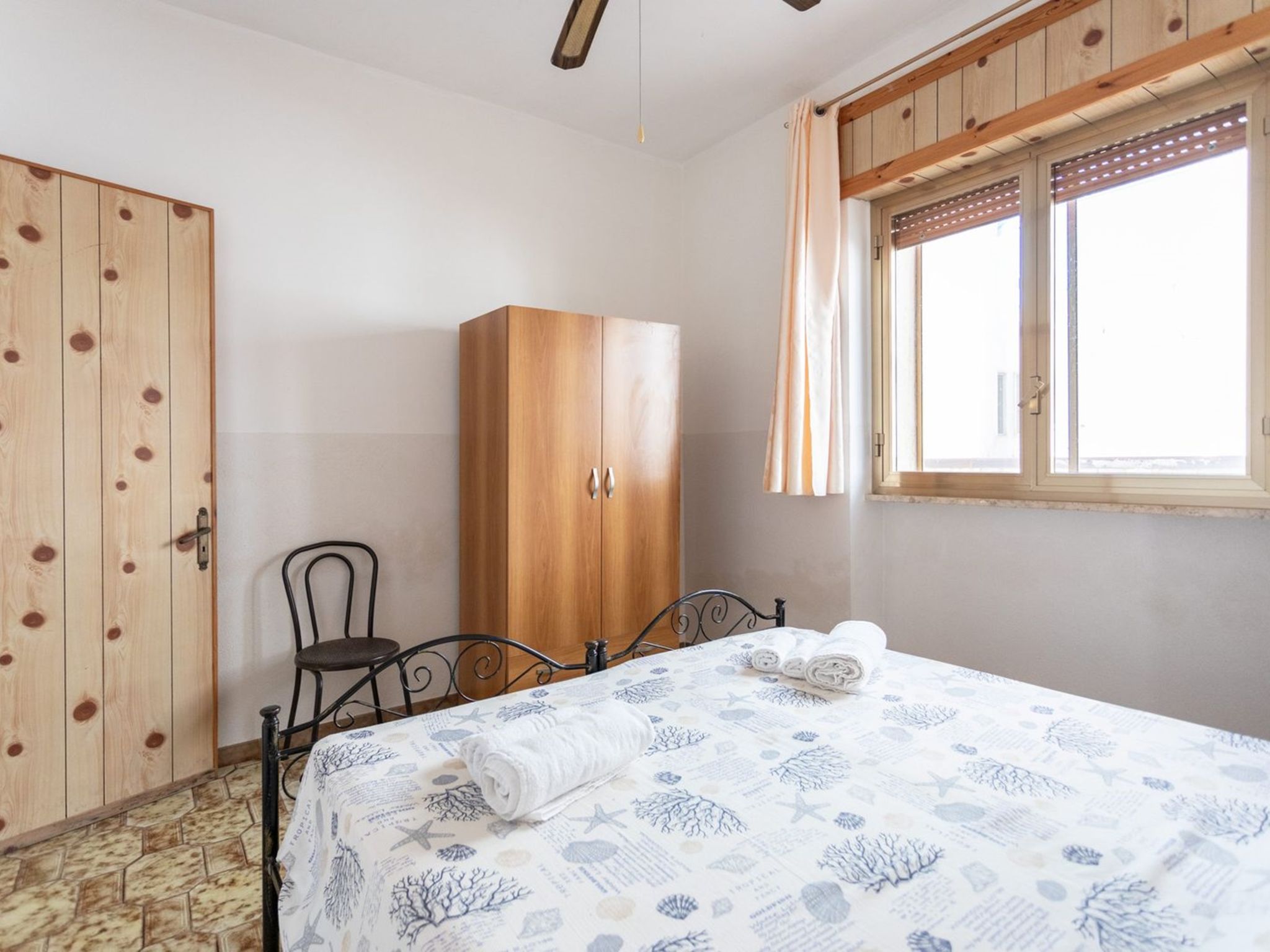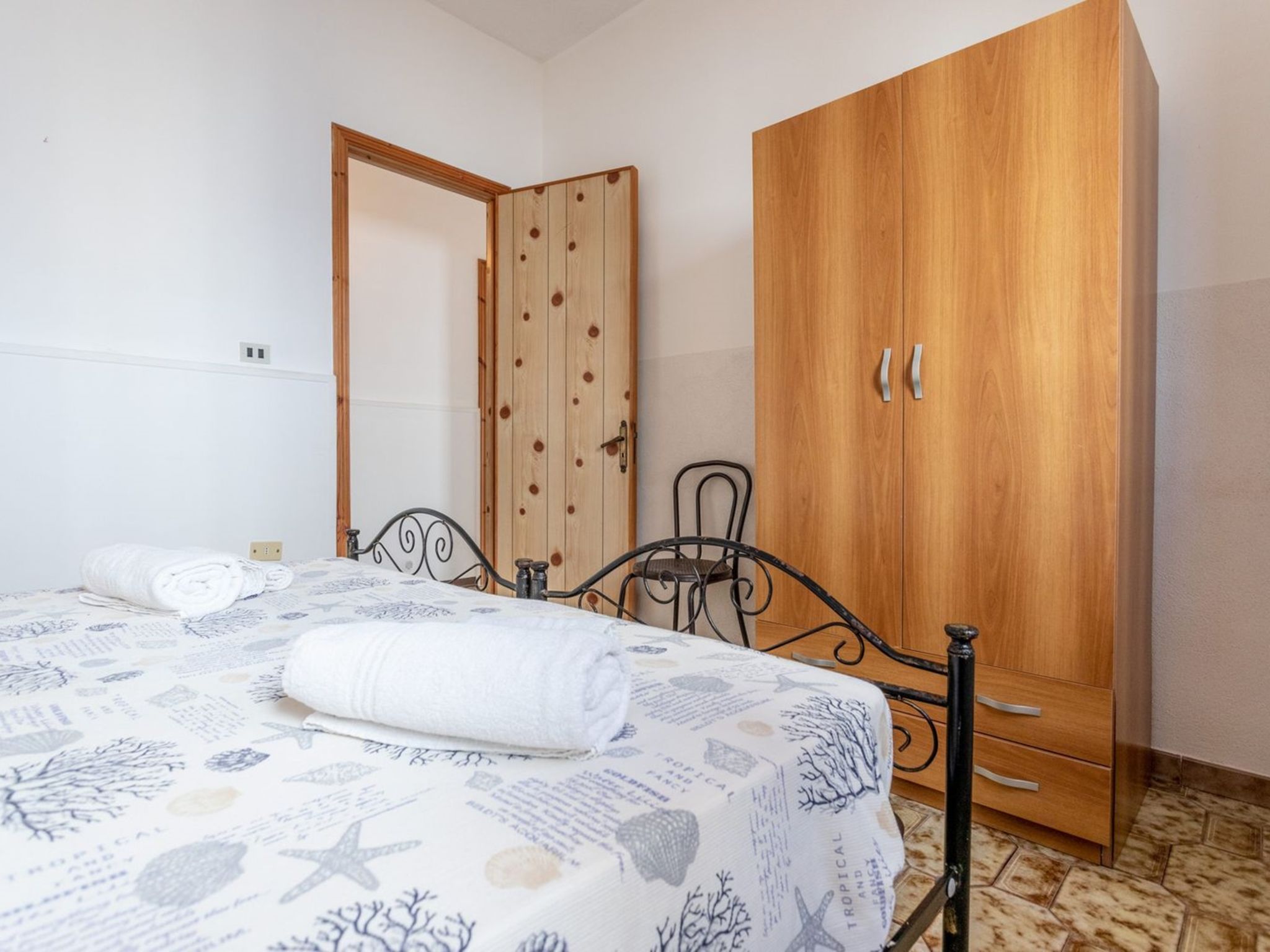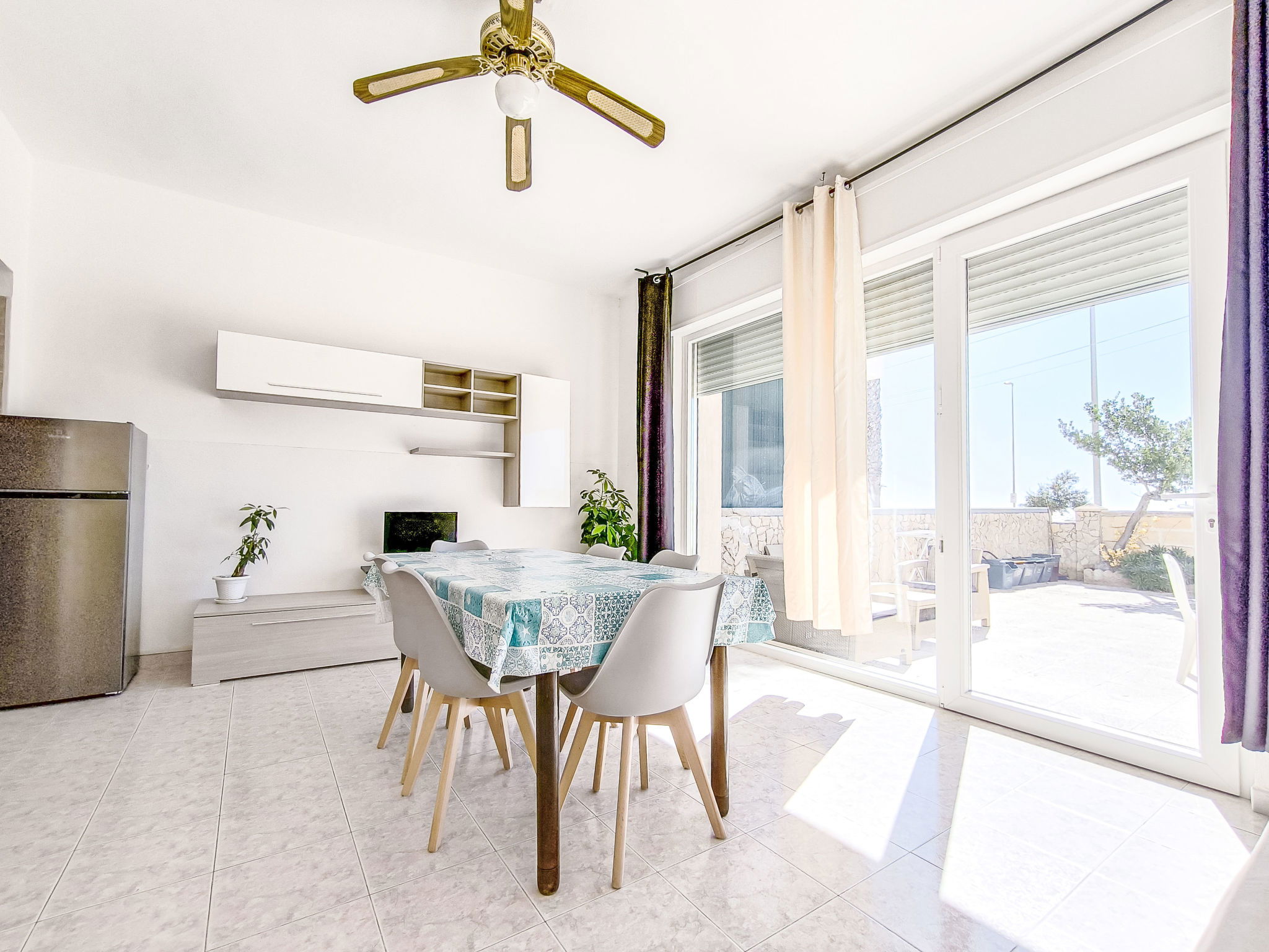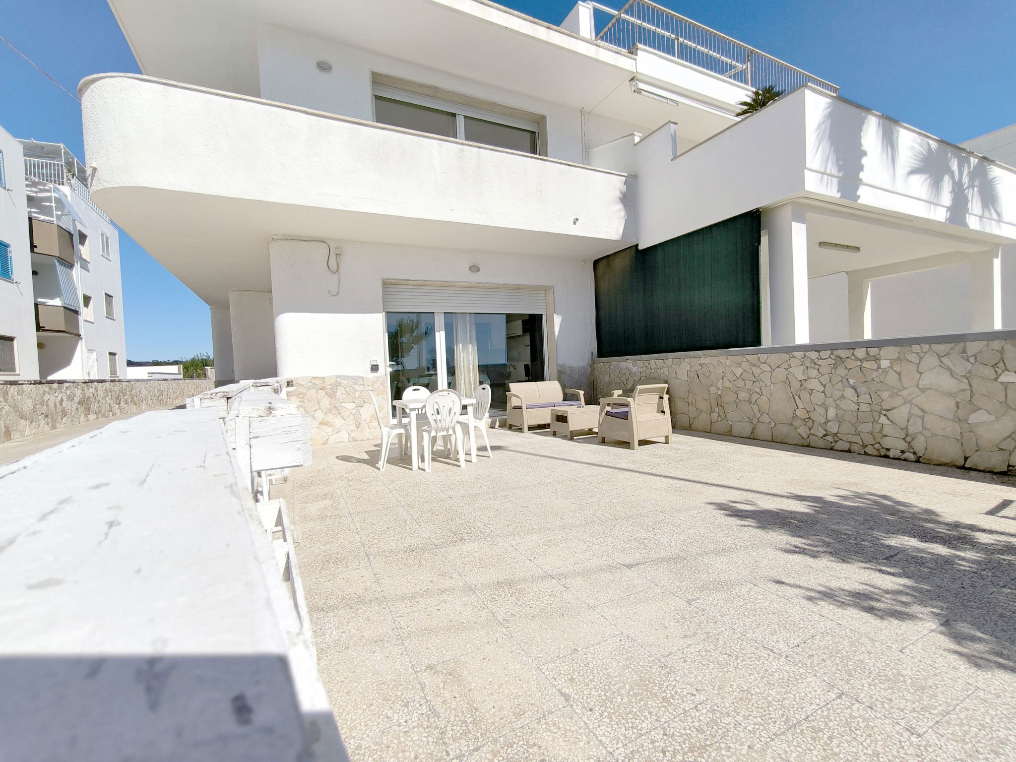 3-room apartment 65 m2, on the ground floor. Practical furnishings: living/sleeping room with 1 sofabed, dining table and fan. Exit to the patio. Walk-through room with air conditioning and forced-air heating. 1 room with 1 double bed and fan. 1 room with 2 beds and fan. Open kitchen (oven, 4 gas rings). Shower/bidet/WC. Heating not available in all rooms. Patio. Terrace furniture. View of the sea. Parking (fenced 1 car) at the house. Please note: maximum 1 pet/ dog allowed. Private entrance. IT075090C200101545