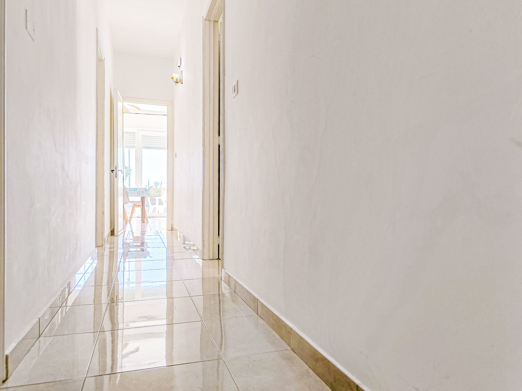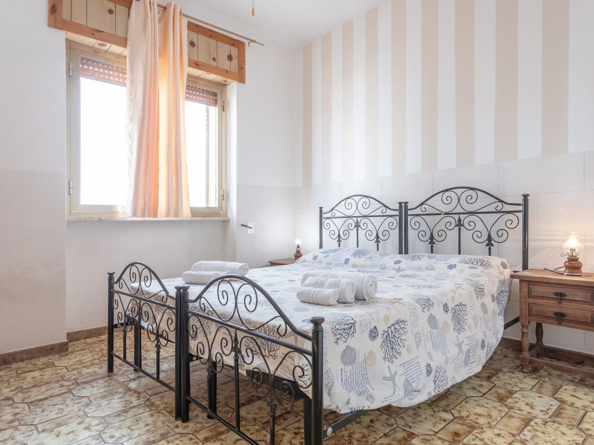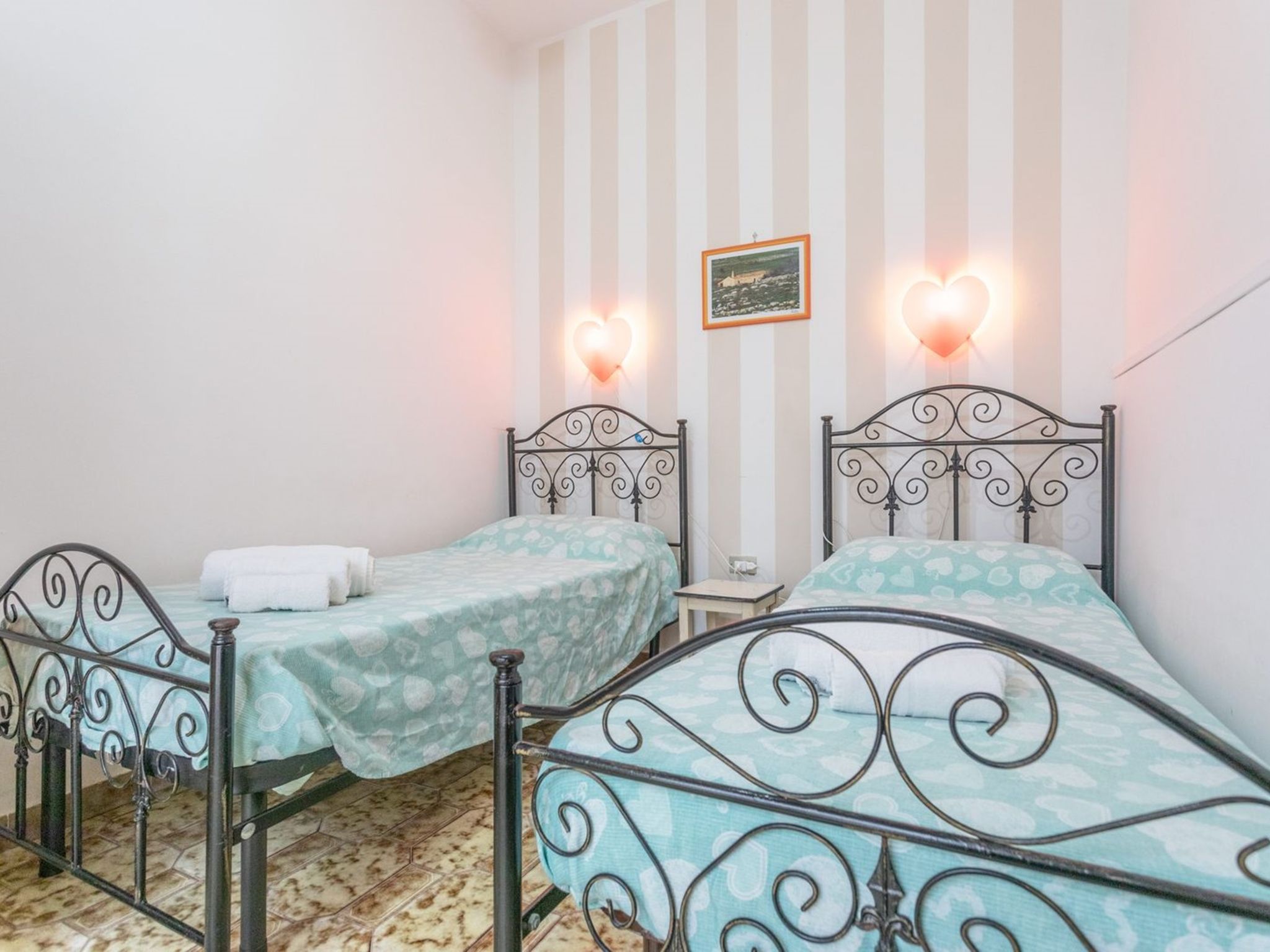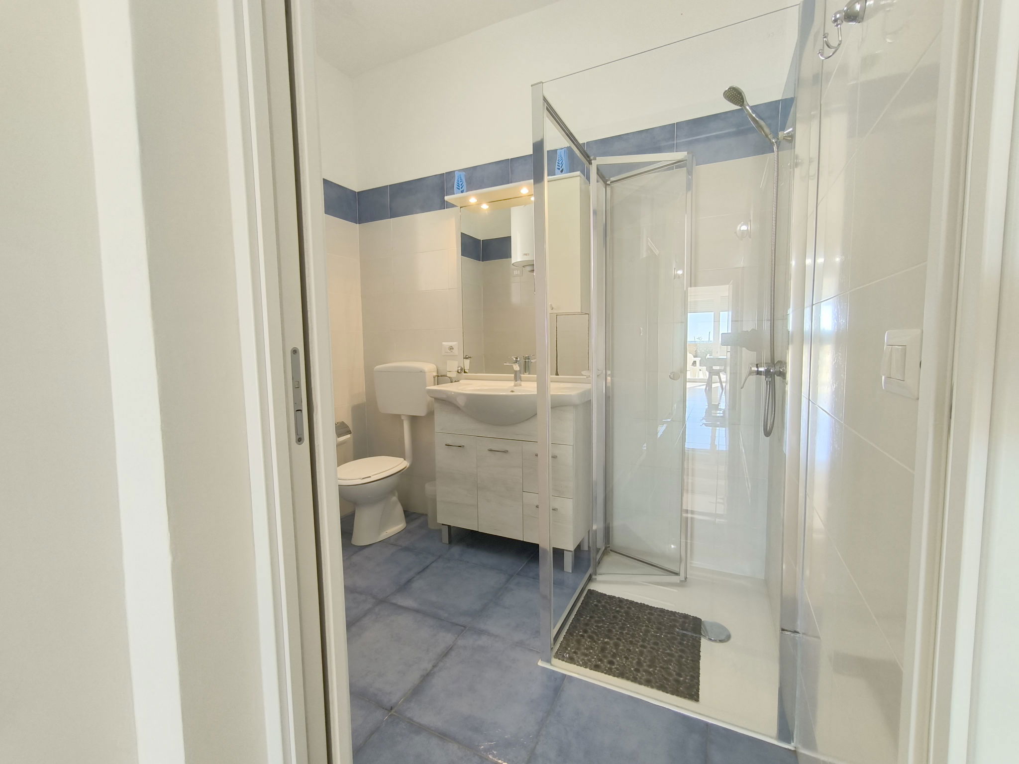 3-room apartment 65 m2, on the ground floor. Practical furnishings: living/sleeping room with 1 sofabed, dining table and fan. Exit to the patio. Walk-through room with air conditioning and forced-air heating. 1 room with 1 double bed and fan. 1 room with 2 beds and fan. Open kitchen (oven, 4 gas rings). Shower/bidet/WC. Heating not available in all rooms. Patio. Terrace furniture. View of the sea. Parking (fenced 1 car) at the house. Please note: maximum 1 pet/ dog allowed. Private entrance. IT075090C200101545
