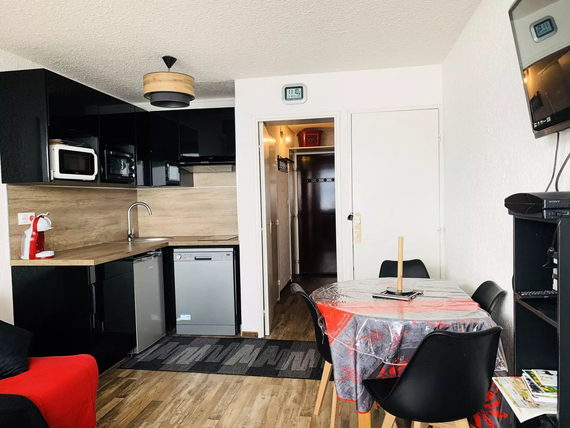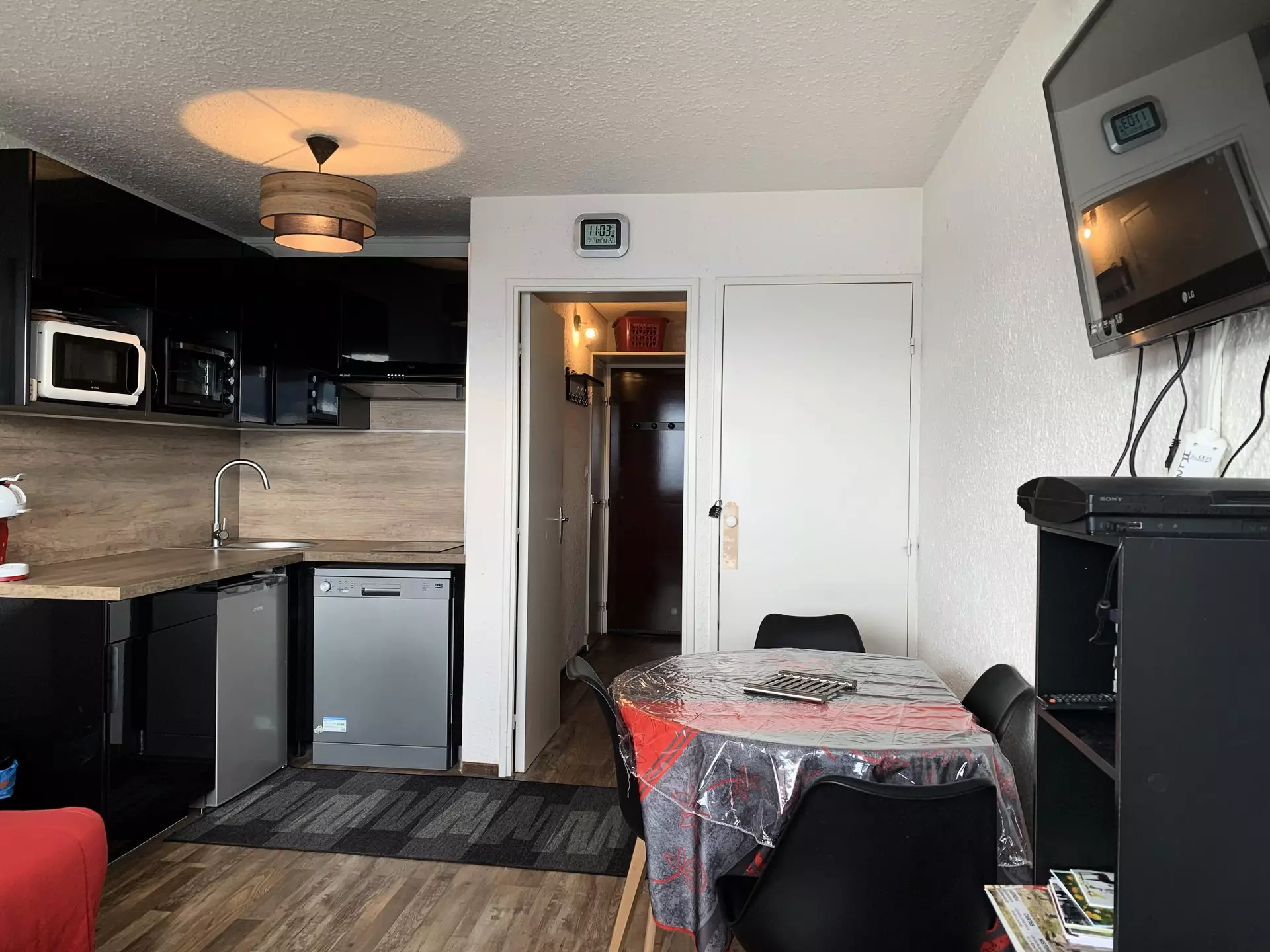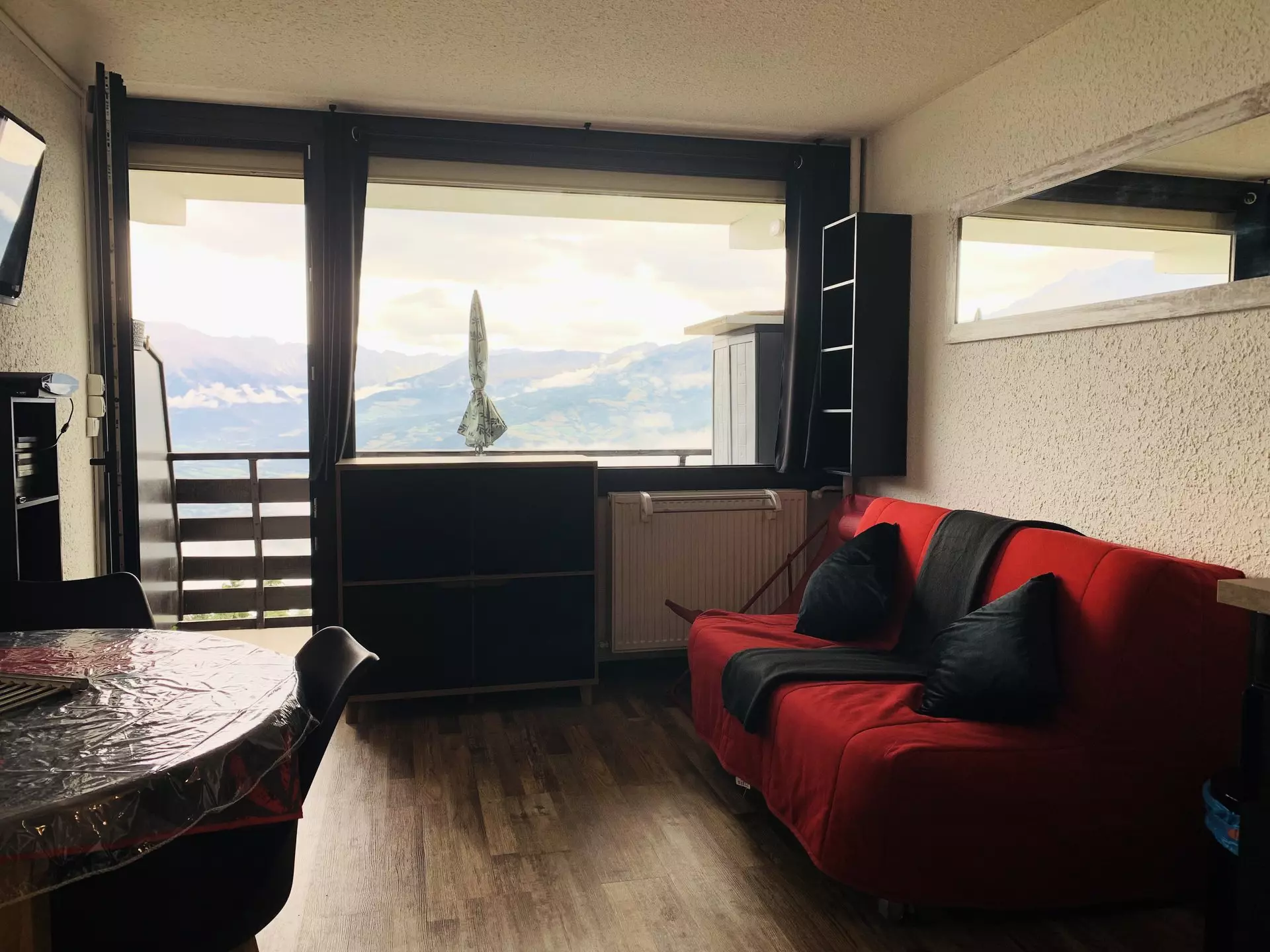 Studio for 4 people, approximately 24m². Located on level -1, entrance side, with elevators. East-facing with balcony and magnificent panoramic views of the Ubaye Valley and the mountains.