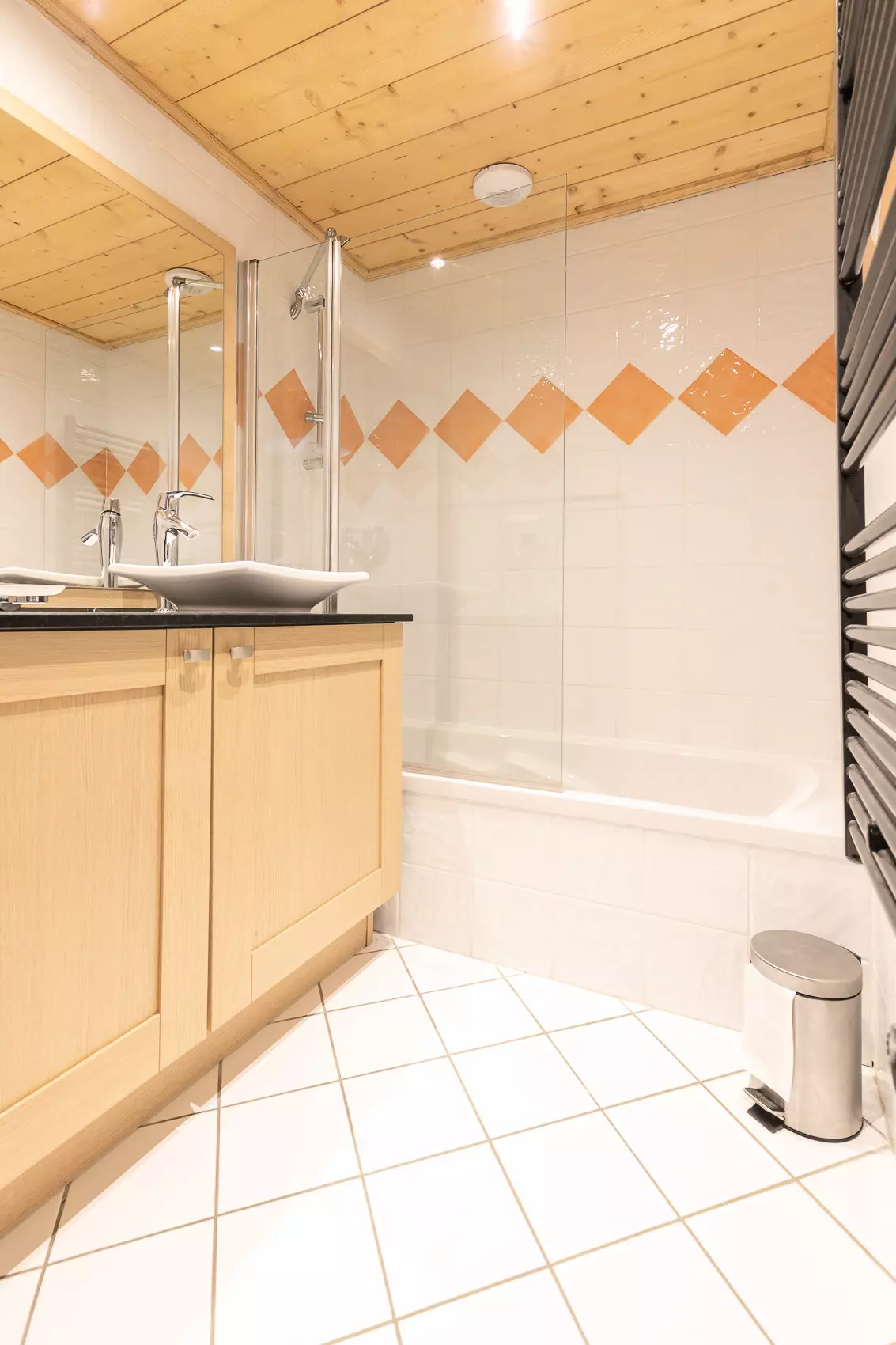 - 1 master bedroom with double bed (180 cm) and adjoining bathroom (bath, shower screen, towel dryer)