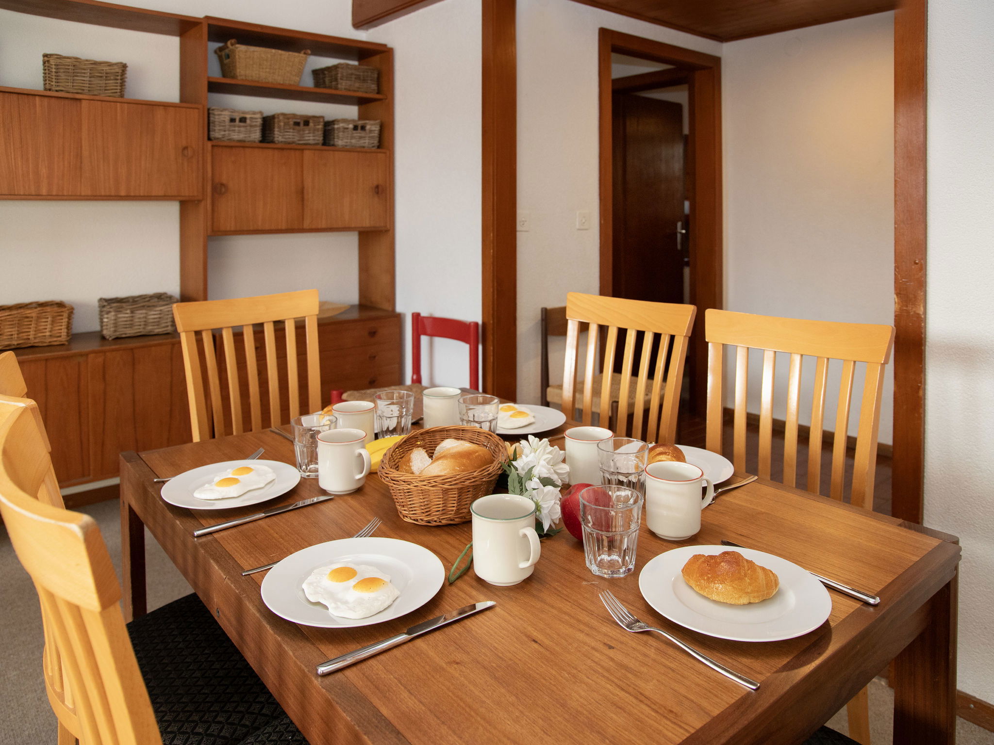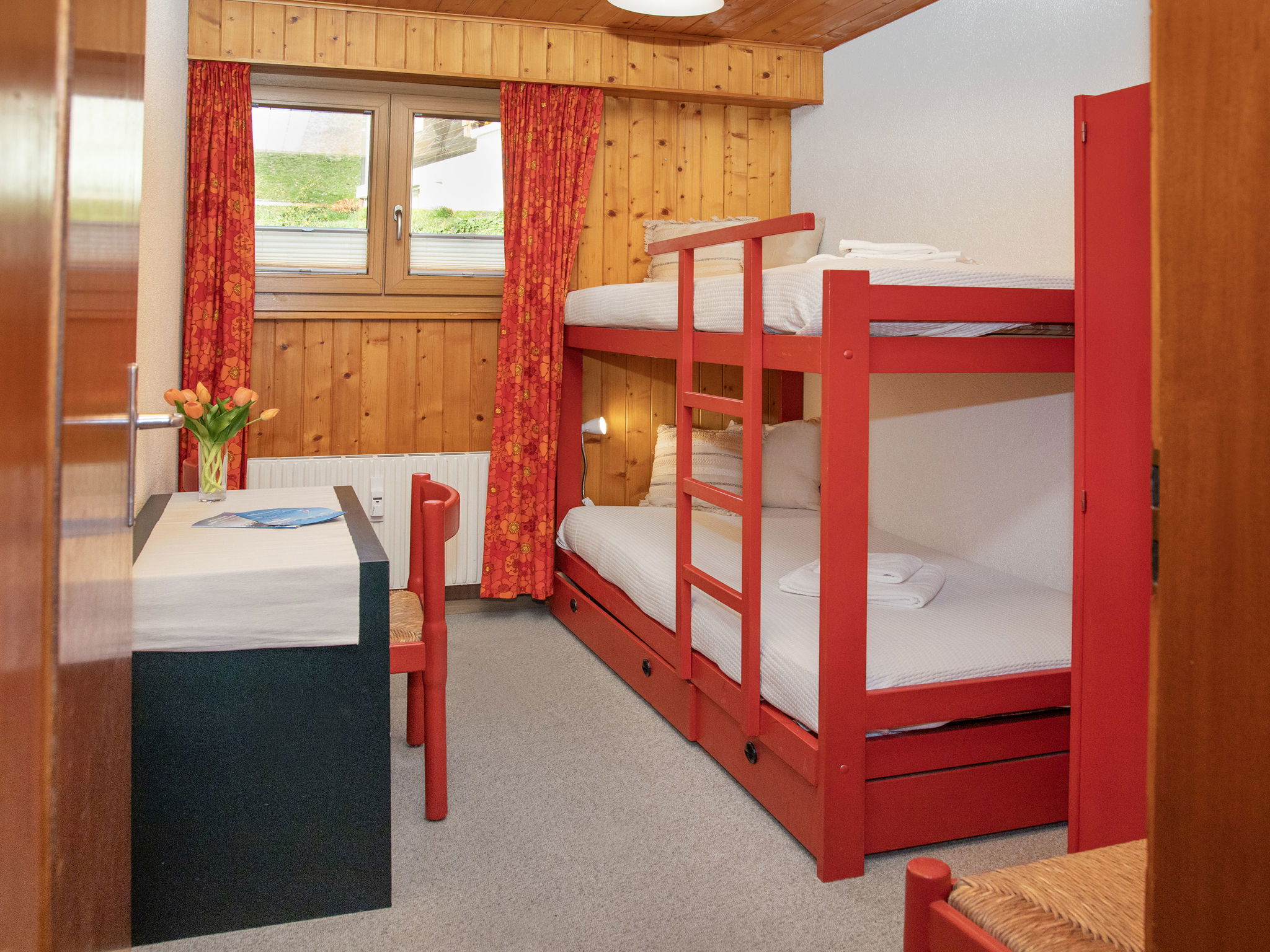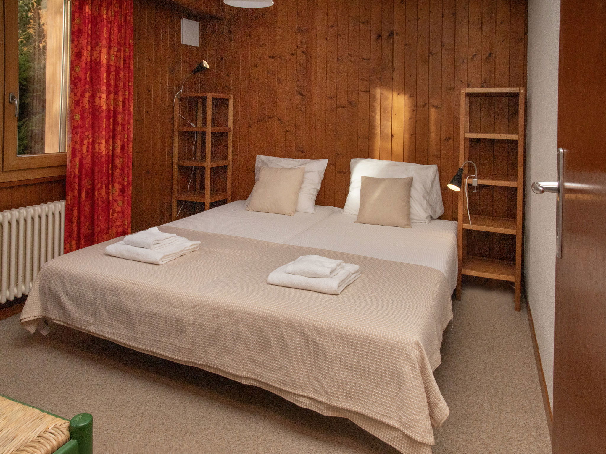 "Porthos 37", 4-room apartment 75 m2 on 2nd floor, south facing position. Practical furnishings: living/dining room with dining table and cable TV. Exit to the balcony, south facing position. 1 room, north facing position with 1 x 2 bunk beds (80 cm, length 190 cm). 1 large room, south facing position with 1 double bed (2 x 90 cm, length 190 cm). 1 small room, west facing position with 1 double bed (2 x 90 cm, length 190 cm). Exit to the balcony, south facing position. Kitchen (3 hot plates, oven, dishwasher, toaster, kettle, microwave, raclette grill, fondue Set (chinoise, cheese)). Bath/WC, sep. WC. Large balcony, south facing position. Balcony furniture, deck chairs (4). Beautiful panoramic view of the mountains and the countryside. Facilities: hair dryer. Internet (WiFi, free). Garage space n 9 at 800 m, height 215 cm. Please note: non-smokers only. Maximum 1 pet/ dog allowed. 143.403.003.10