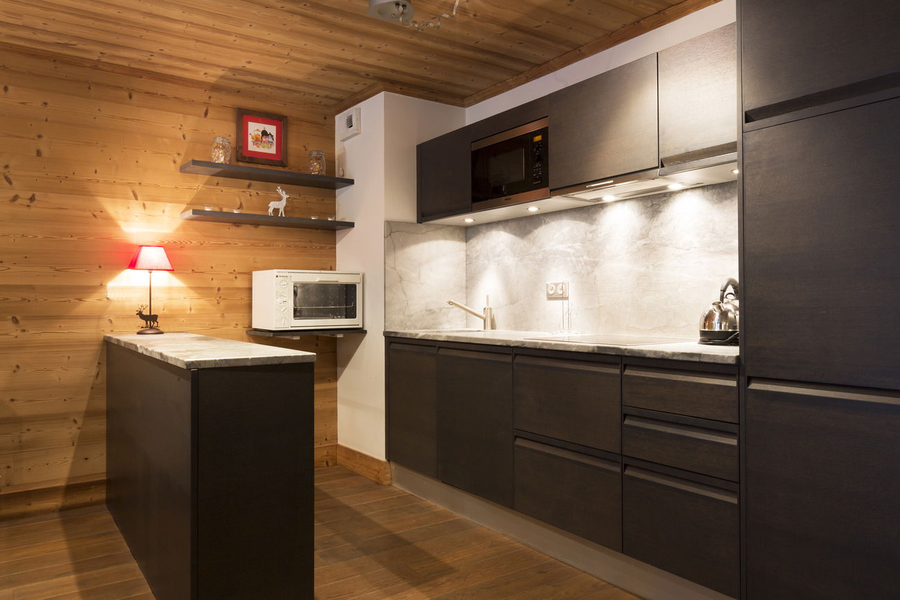 Fully equipped kitchen with microwave, oven, vitroceramic stove, hood, large fridge with freezer and dishwasher