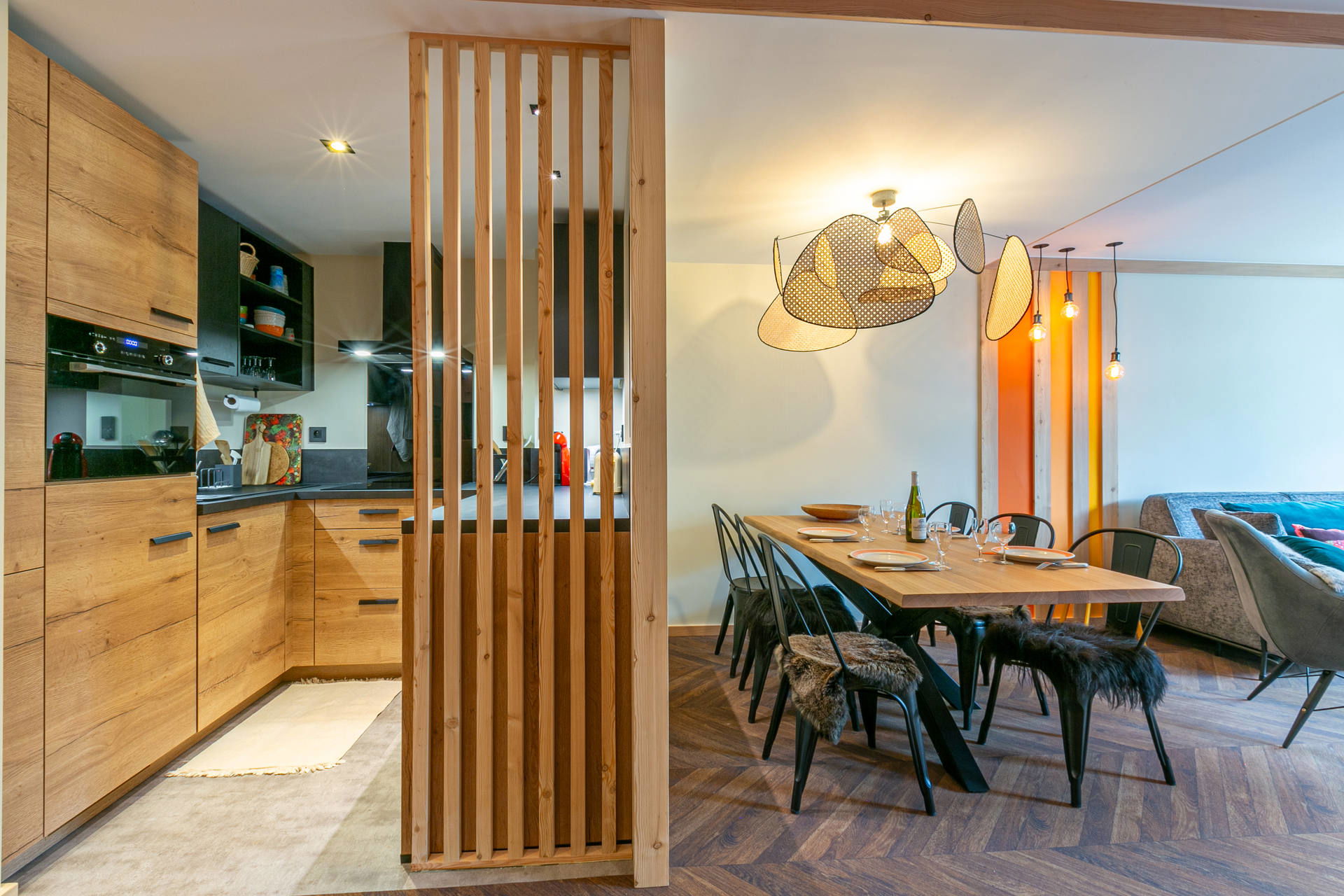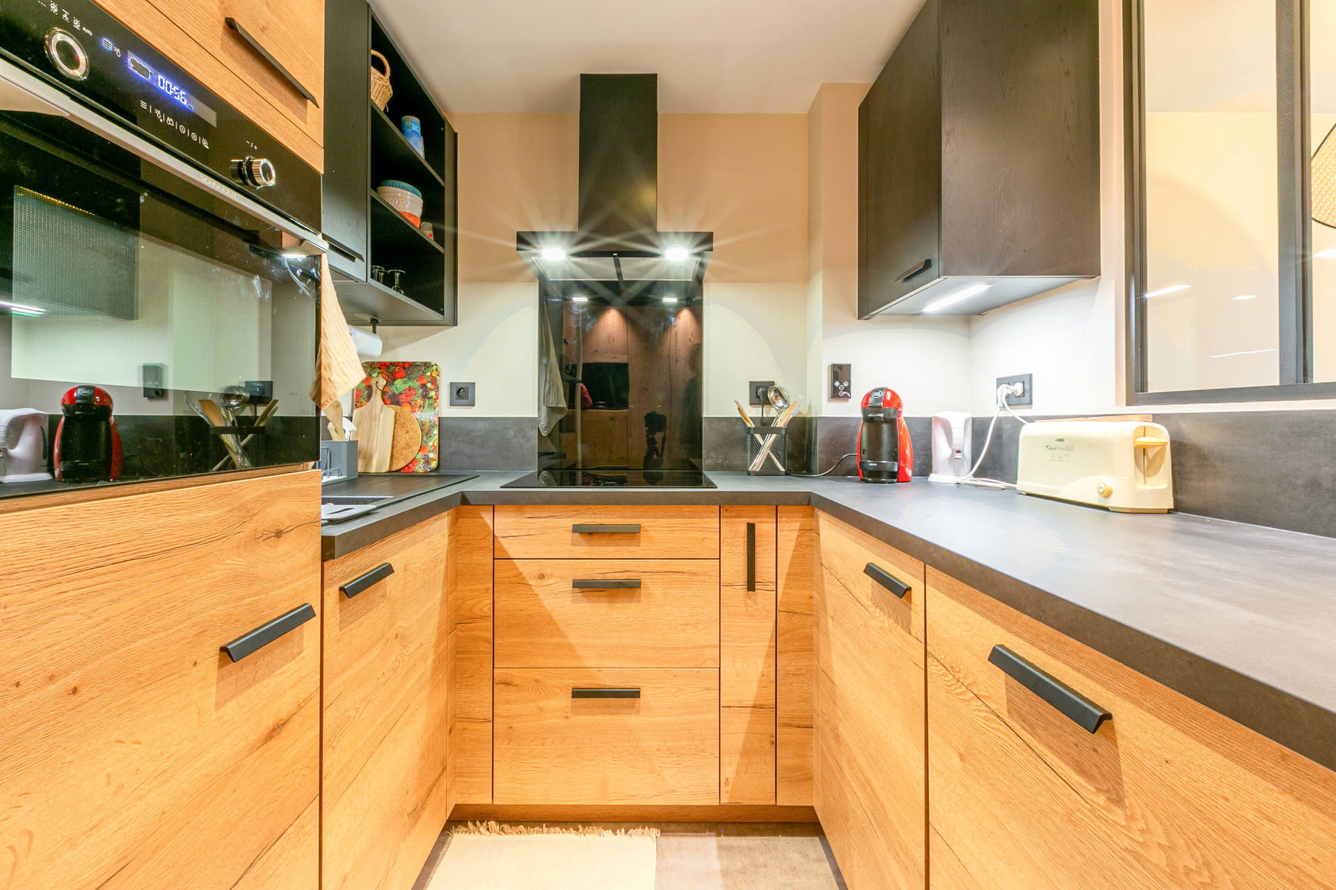 Equipped with fridge ansd frezzer, dishwasher, hood, induction hob, microwave/oven