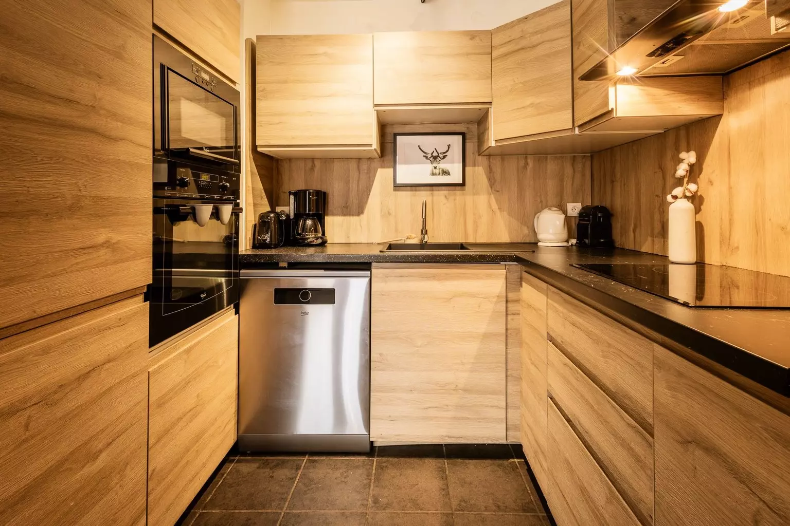 Open kitchen: oven, microwave, dishwasher, ceramic hob, fridge, freezer.