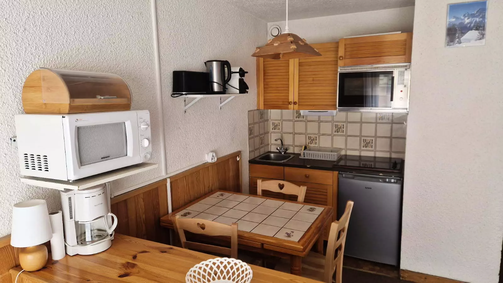 Kitchen area: oven, microwave, ceramic hob (4 burners), refrigerator (140L).