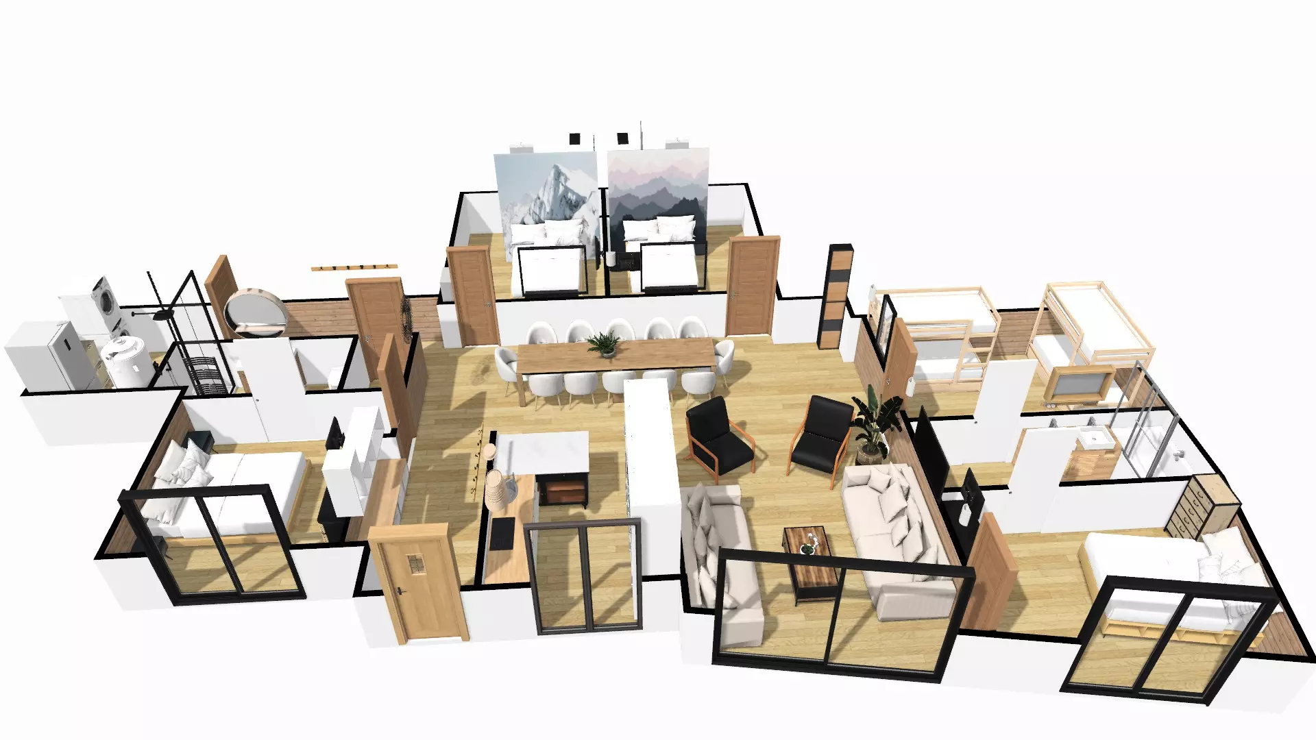 - Kitchen area: oven, microwave, refrigerator, induction hob (4 burners), dishwasher.