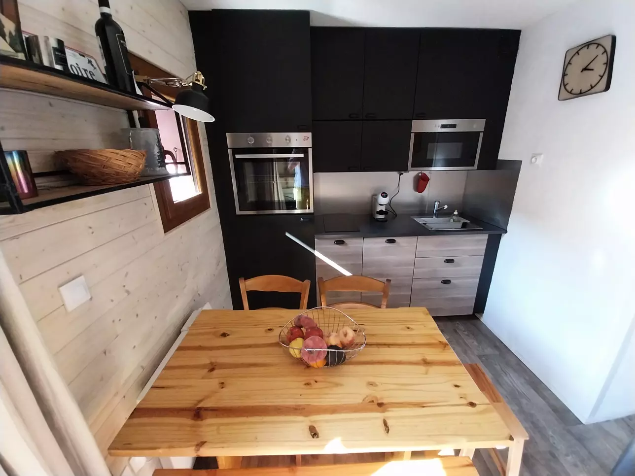 Kitchen area: oven, microwave, fridge/freezer, 2 induction hobs, dishwasher
