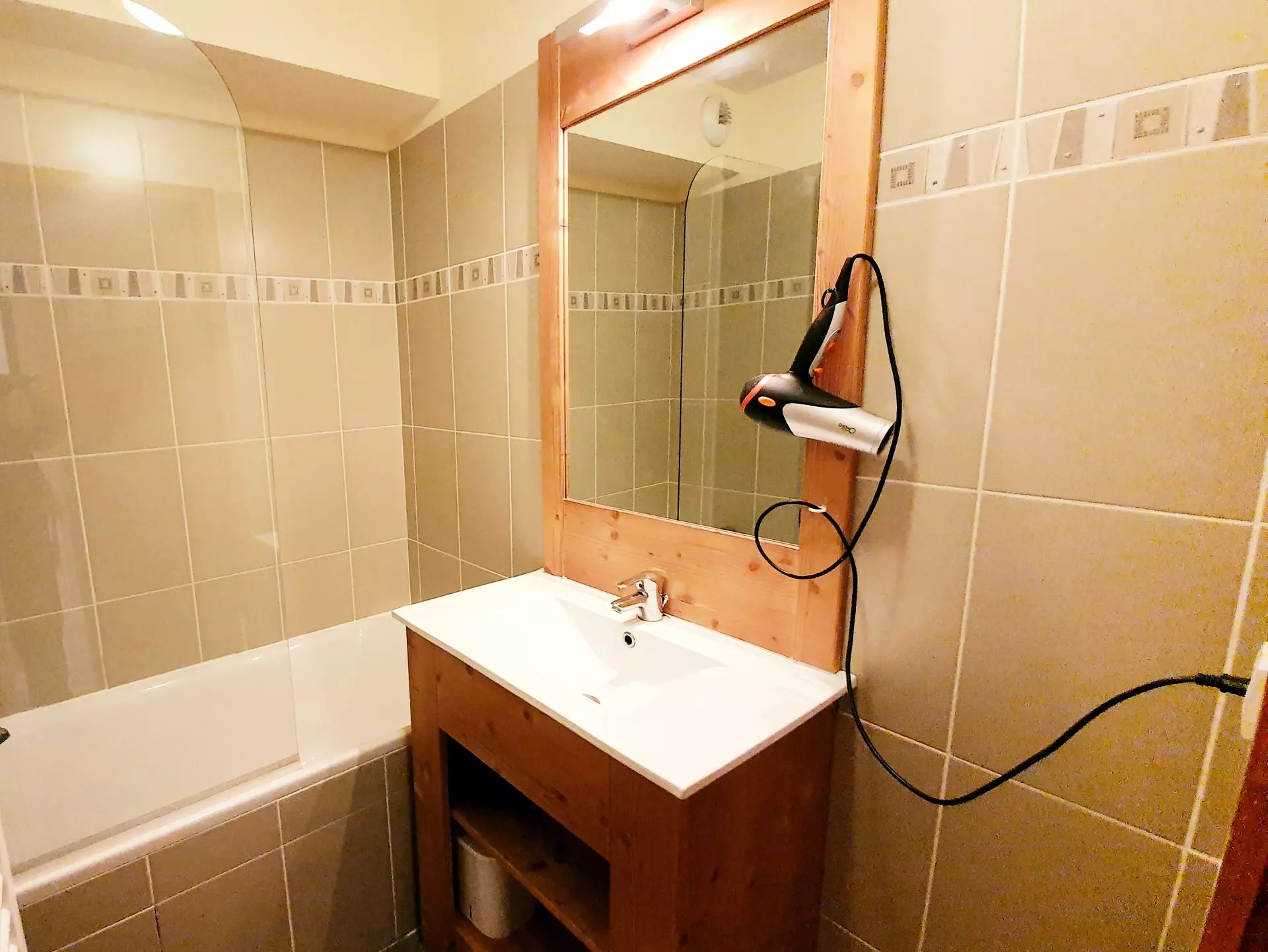 The bathroom has a bathtub, for a relaxing moment after your favorite activities.