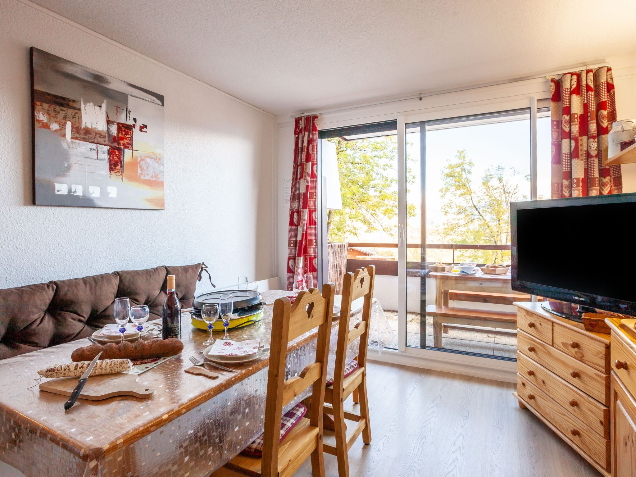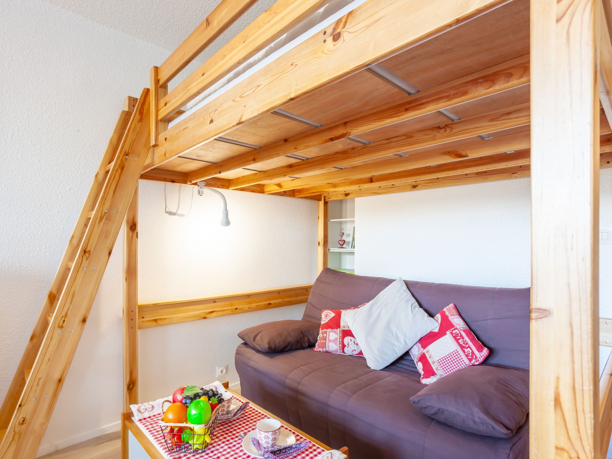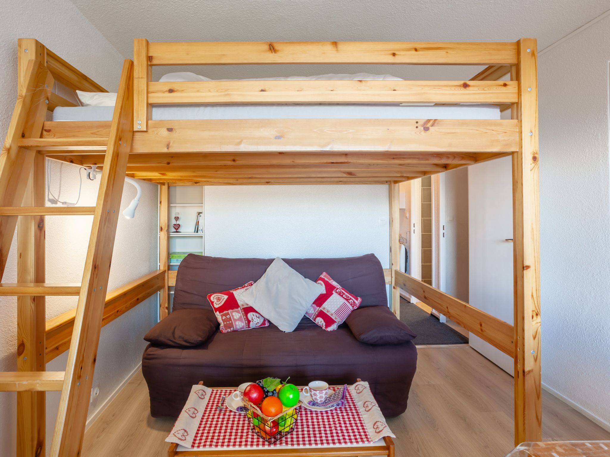1-room apartment 28 m2, on the ground floor, north facing position. Renovated in 2020: living/dining room with 1 double sofabed (160 cm, length 200 cm), TV (flat screen), DVD. Exit to the balcony, north facing position. Alcove with curtain with 1 x 2 bunk beds (80 cm, length 190 cm). Small kitchen (mini-oven, dishwasher, 2 induction hot plates, toaster, kettle, microwave, freezer, electric coffee machine, Capsules for coffee machine (SENSEO) extra, raclette grill). Shower, sep. WC. Electric heating. Parquet floors. Balcony 4 m2, north facing position. Balcony furniture. View of the valley. Facilities: iron, hair dryer. Internet (WiFi, extra). Please note: non-smokers only. Maximum 1 pet/ dog allowed. Smoke alarm. Instead of an enclosed bedroom, some sleeping areas are located in an open-plan area (gallery, alcove, etc.). Offer by a private individual according to Art. 155, IV of CGI.