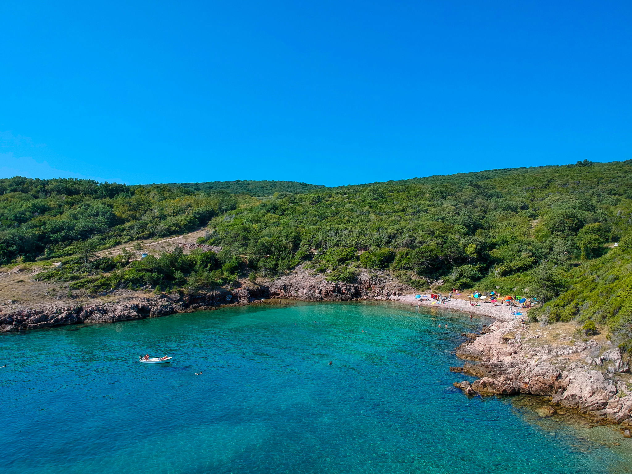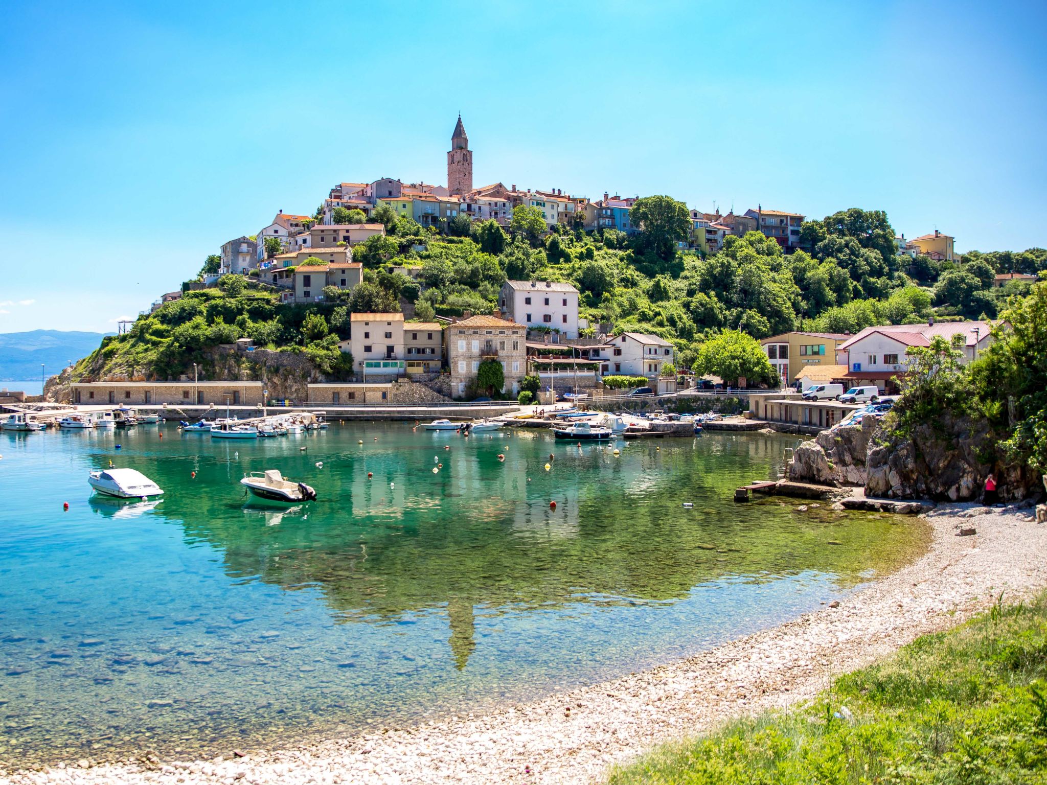 Cosy 2-family house "Filip". In the hamlet Risika 5 km from the centre of Dobrinj, 6 km from the centre of Vrbnik, 1 km from the sea, 1 km from the beach, in a cul-de-sac, in the countryside. For shared use: property 1'000 m2 (fenced), natural garden. In the house: internet access. Parking (for 3 cars) at the house on the premises. Shop 800 m, restaurant 5 km, bar 1 km, bus stop 800 m, sandy beach 1 km. Please note: the owner lives on the same property. Airfield close by 20 km from the property.