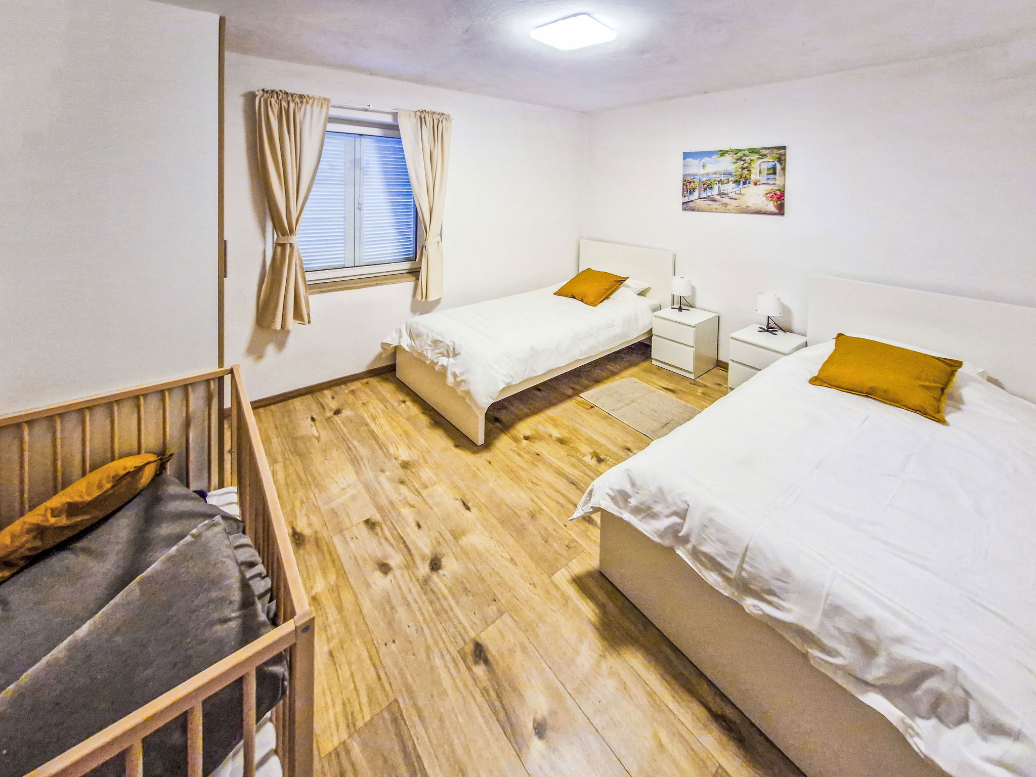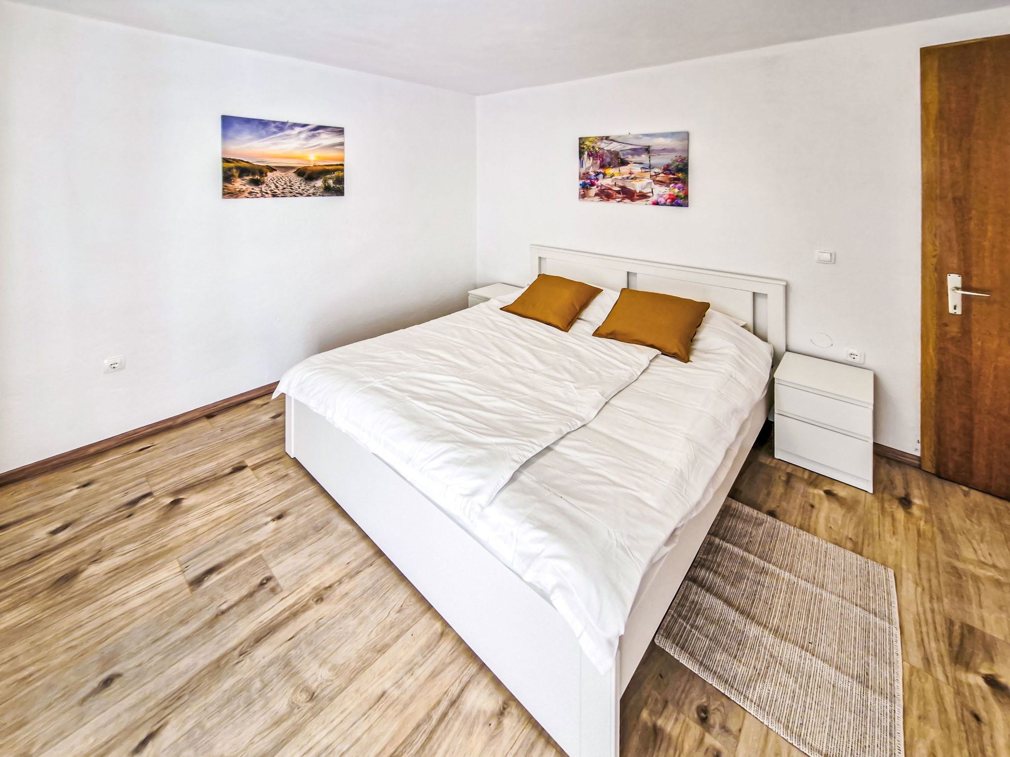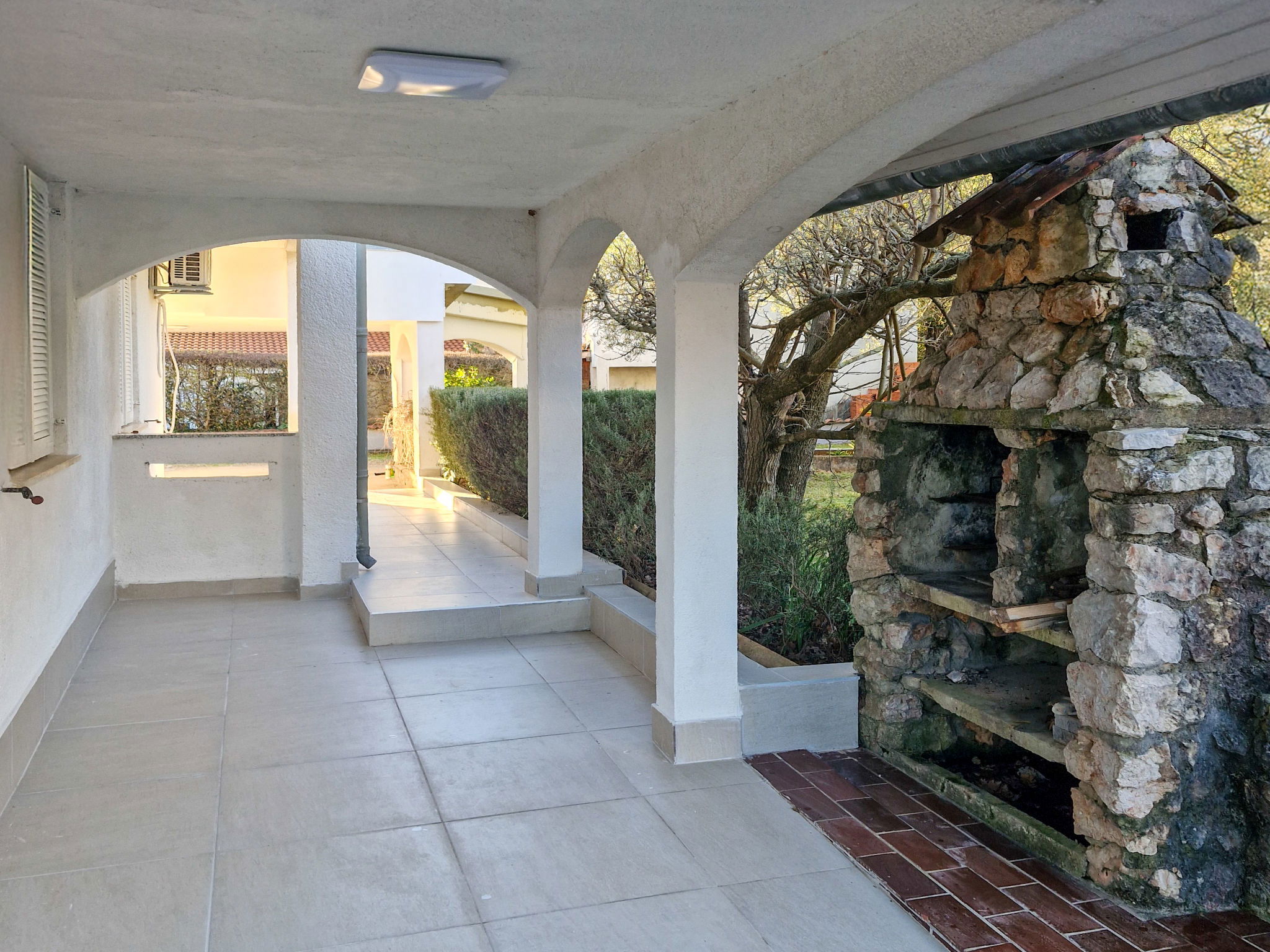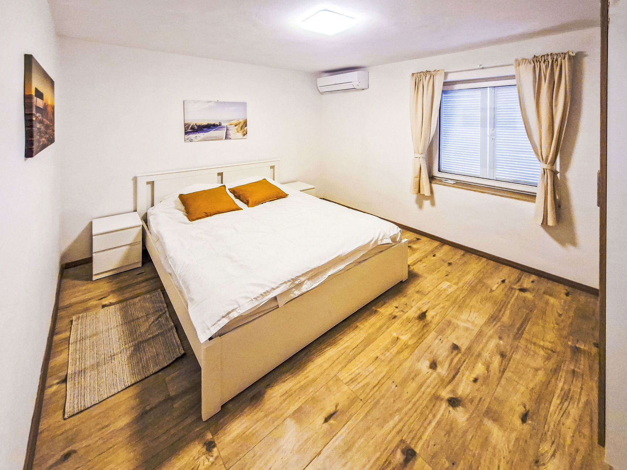 4-room apartment 80 m2, on the ground floor. Partly renovated in 2025, modern furnishings: living/dining room with cable TV. Exit to the garden, to the terrace. 1 room with 1 french bed (160 cm, length 200 cm), air conditioning. 1 room with 2 beds (90 cm, length 200 cm). 1 room with 1 french bed (160 cm, length 200 cm). Exit to the terrace. Kitchen (oven, dishwasher, 4 induction hot plates, toaster, kettle, microwave, freezer, electric coffee machine). Exit to the terrace. Shower/WC. No heating option. Large terrace 35 m2, roofed, small terrace 21 m2, roofed. Terrace furniture, barbecue. Facilities: baby cot. Internet (WiFi). Please note: non-smoking house. Maximum 1 pet/ dog allowed. Fire extinguisher.