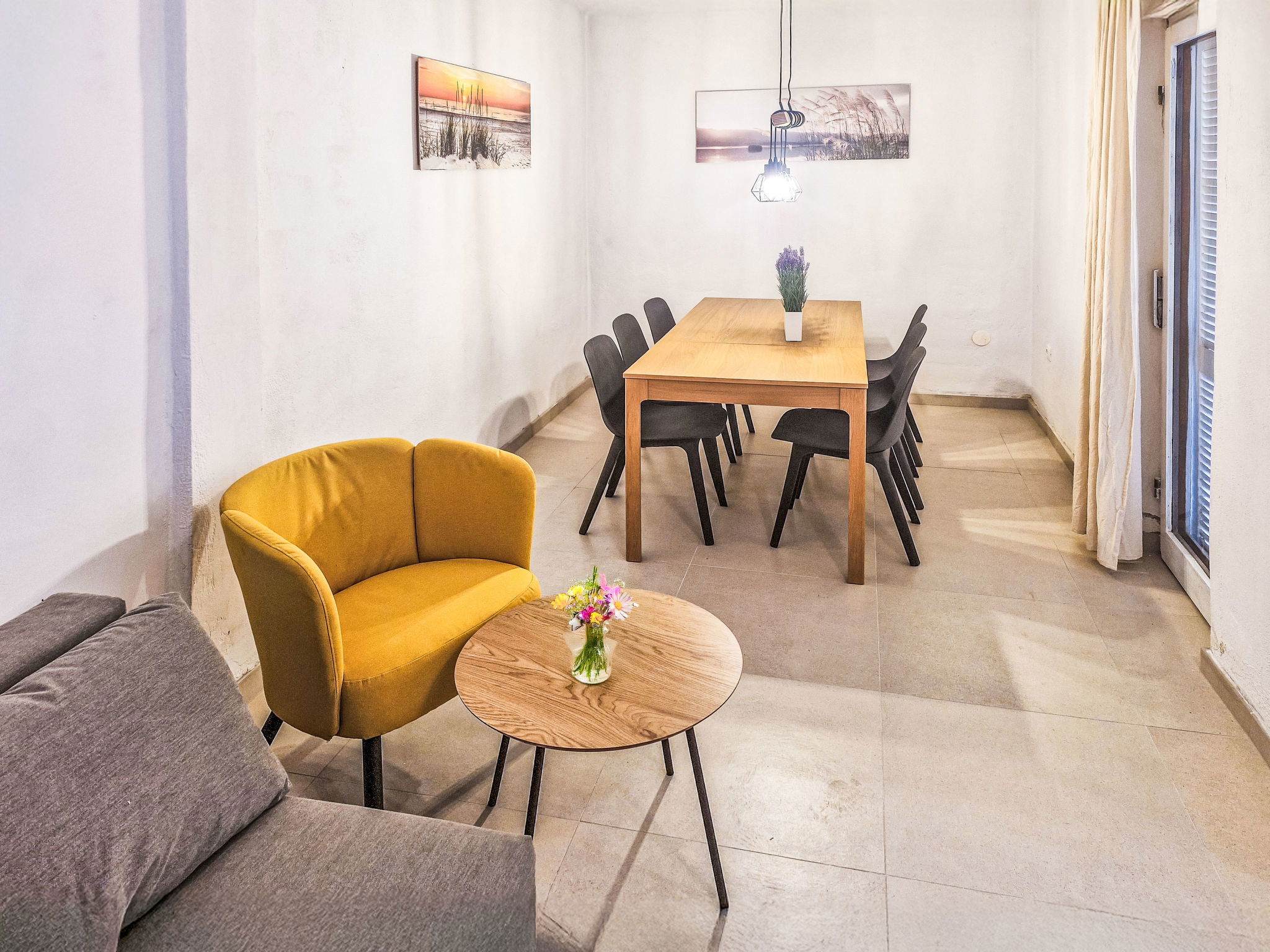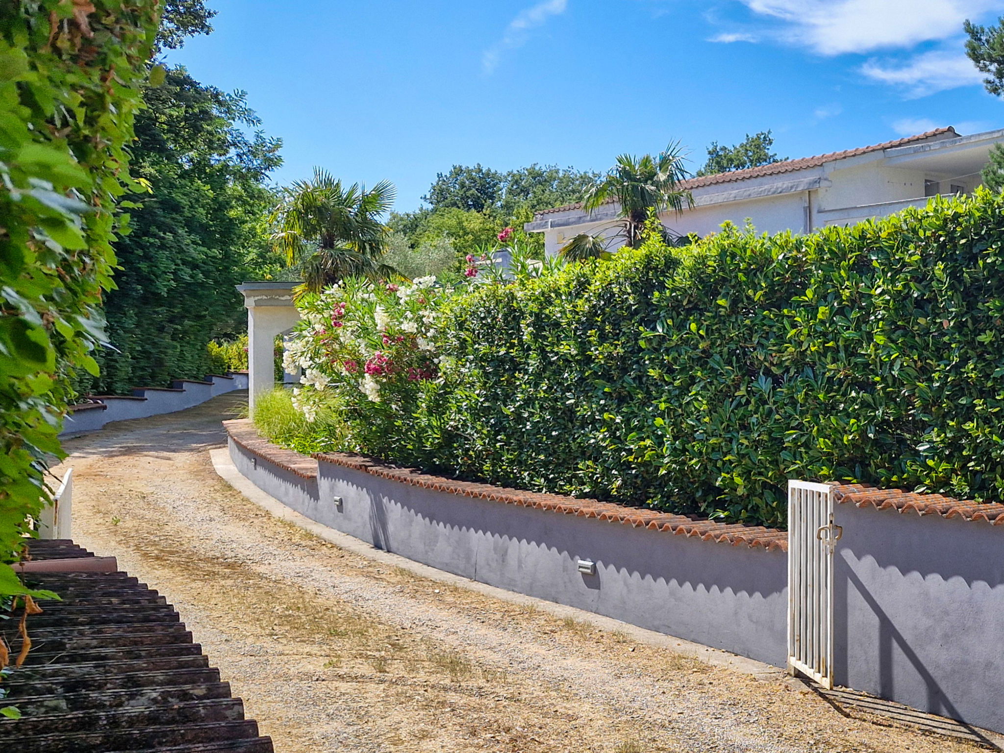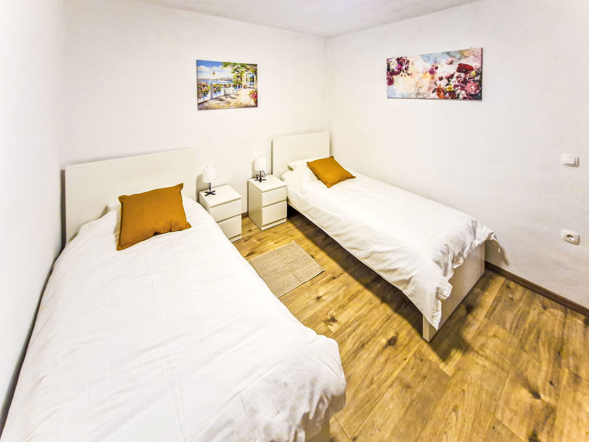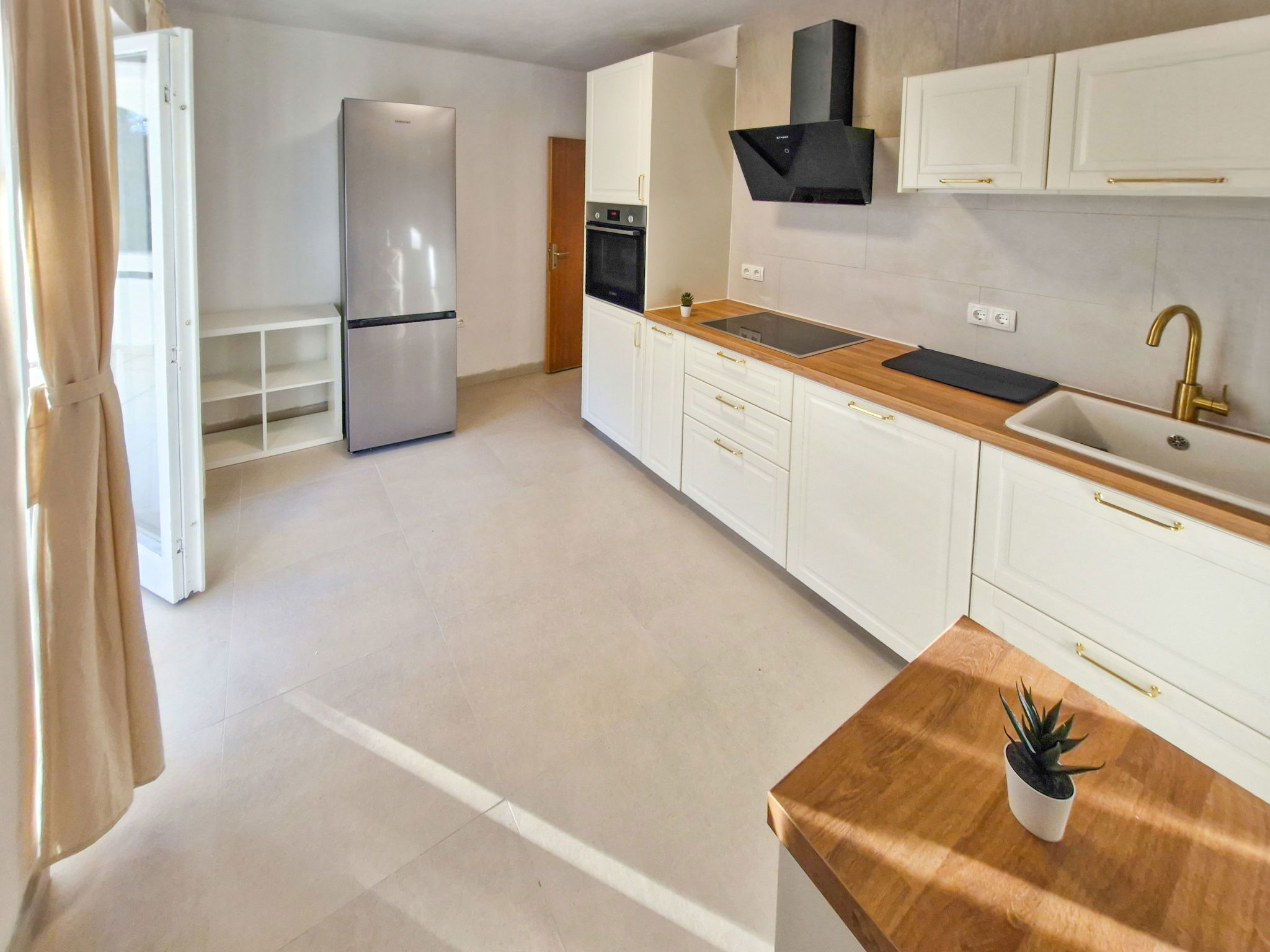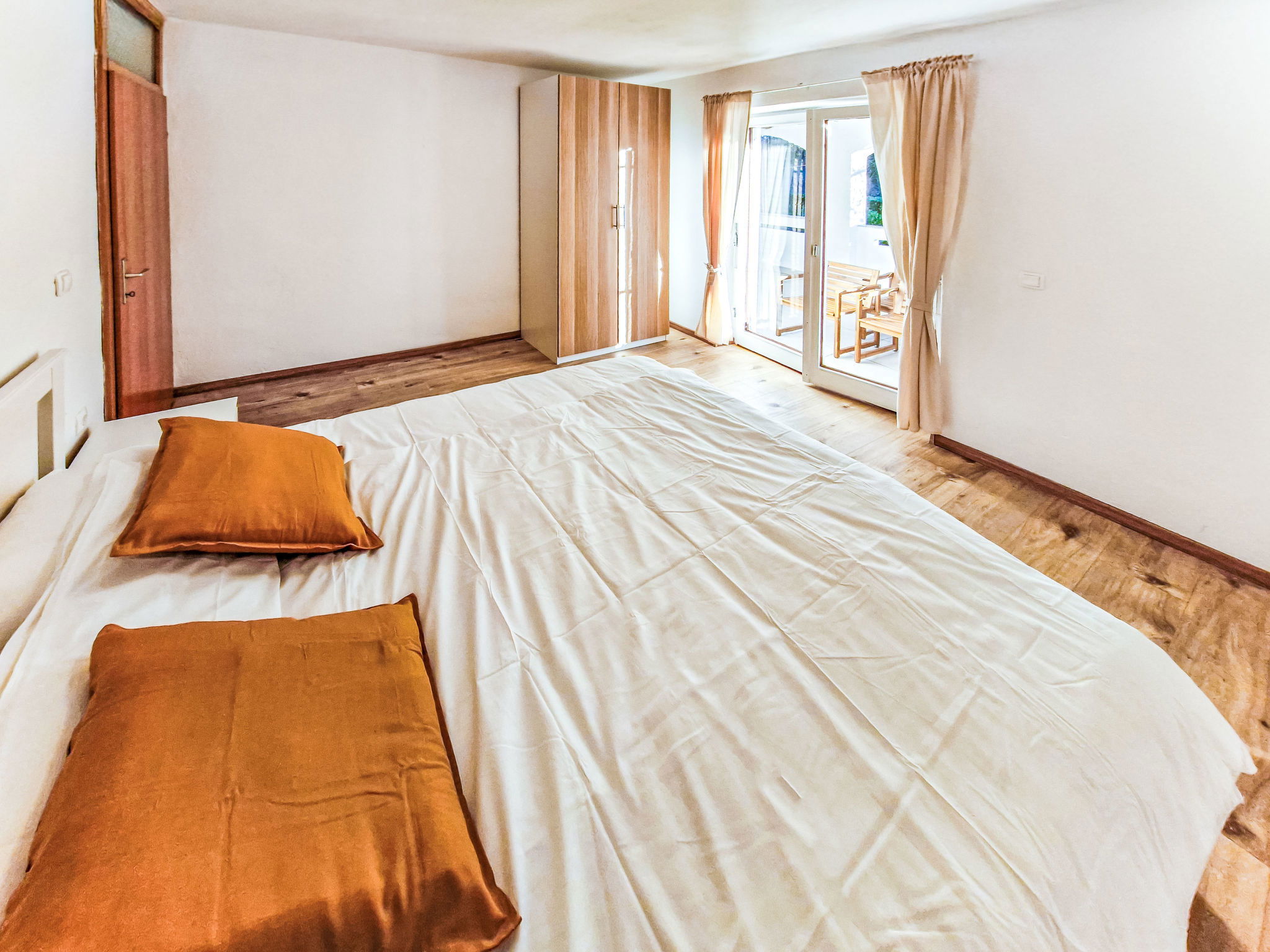 4-room apartment 80 m2, on the ground floor. Partly renovated in 2025, modern furnishings: living/dining room with cable TV. Exit to the garden, to the terrace. 1 room with 1 french bed (160 cm, length 200 cm), air conditioning. 1 room with 2 beds (90 cm, length 200 cm). 1 room with 1 french bed (160 cm, length 200 cm). Exit to the terrace. Kitchen (oven, dishwasher, 4 induction hot plates, toaster, kettle, microwave, freezer, electric coffee machine). Exit to the terrace. Shower/WC. No heating option. Large terrace 35 m2, roofed, small terrace 21 m2, roofed. Terrace furniture, barbecue. Facilities: baby cot. Internet (WiFi). Please note: non-smoking house. Maximum 1 pet/ dog allowed. Fire extinguisher.