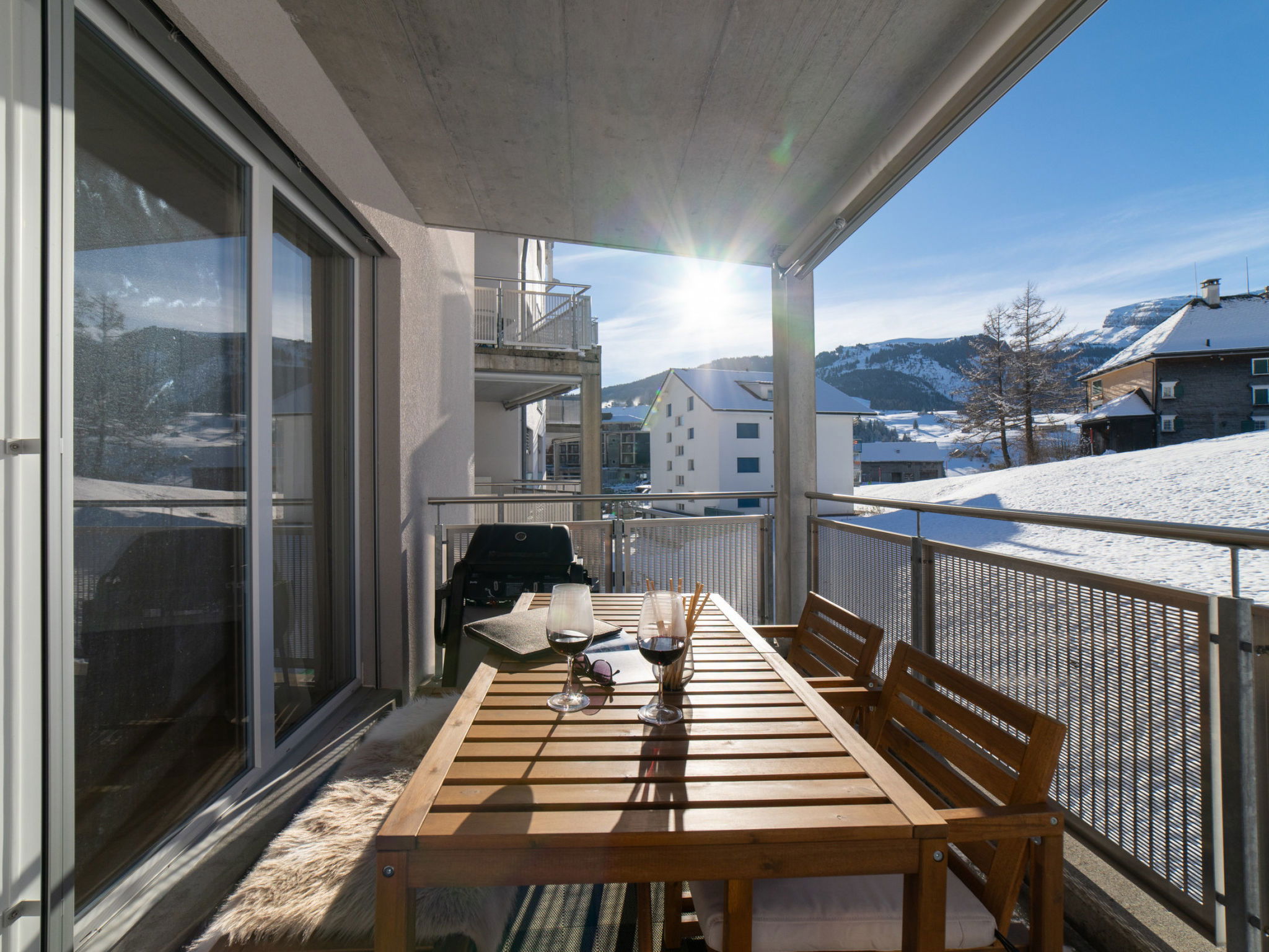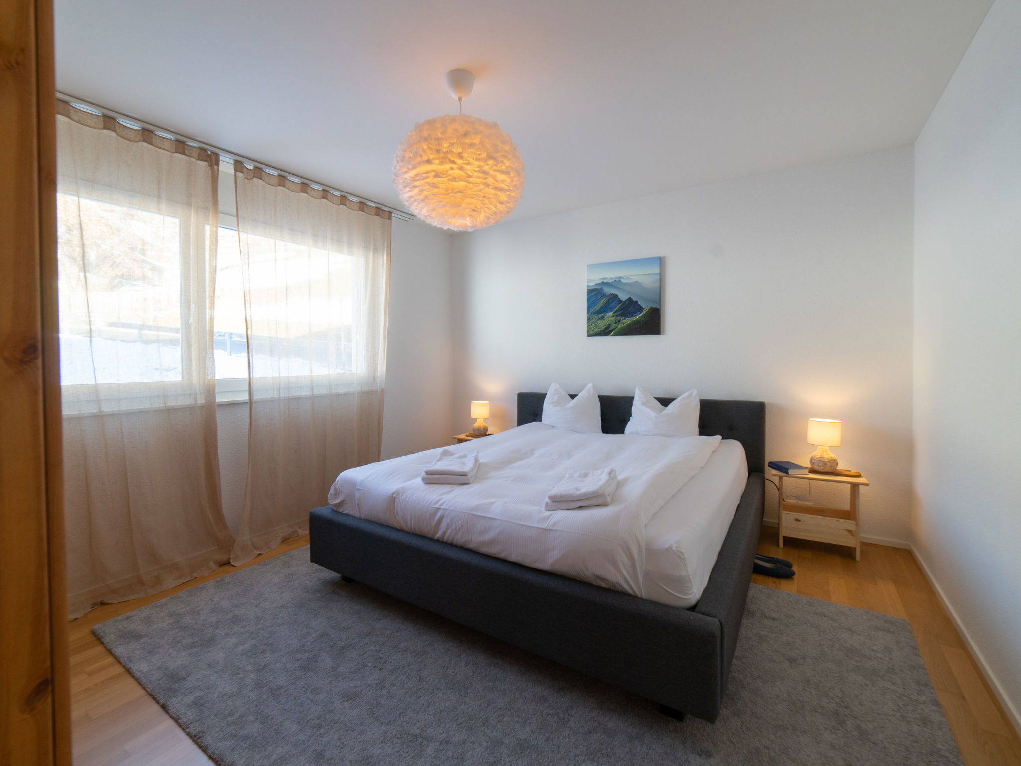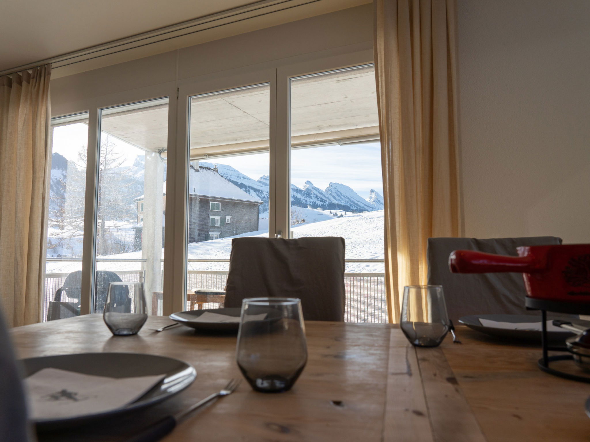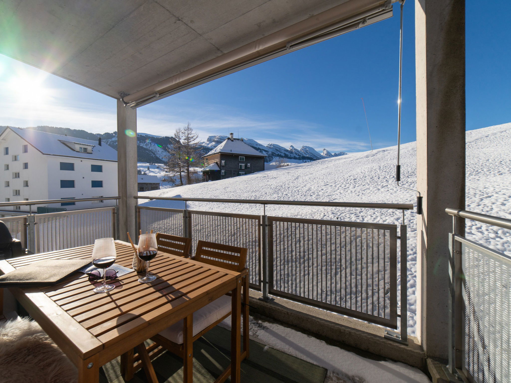 "Säntis", 3-room apartment 107 m2 on 1st floor. Object suitable for 8 adults. 1 room with 1 double bed and TV. 1 room with 1 double bed. 1 room with 2 x 2 bunk beds. Open kitchen (oven, dishwasher, 4 ceramic glass hob hotplates, toaster, freezer, electric coffee machine, raclette grill). Bath/WC, sep. WC. Balcony. Barbecue. View of the mountains and the ski run. Facilities: washing machine, dryer. Internet (WiFi, free). Garage (1 car). Please note: non-smokers only. 1 pet/ dog allowed. DescriptionThe Säntis holiday apartment in Wildhaus offers space for up to 8 people and comprises 3 cosy bedrooms. Enjoy not only a breathtaking view of the mountains, but also a perfect location that allows you to reach the valley station in no time. The charming village centre with numerous shopping opportunities is also just a few minutes' walk away.In summer, you can look forward to countless leisure activities. Thanks to the ideal location, you will be on various hiking trails suitable for all levels of difficulty in just a few minutes. Families in particular will get their money's worth here and enjoy unforgettable experiences in the midst of nature.Mandatory or included services:Baby bed : IncludedBed linen : CHF 12.00 /personFinal Cleaning : CHF 180.00 /bookingGarage : IncludedHeating : IncludedInternet Access : IncludedStarter Package : CHF 25.00 /bookingTowels : CHF 8.00 /personOptional services:Pet : CHF 10.00 / dayCheck-in schedule:1.1-31.12 from 00:00 to 23:59, Monday, Tuesday, Wednesday, Thursday, Friday, Saturday, SundayCheck-out schedule: 10:00