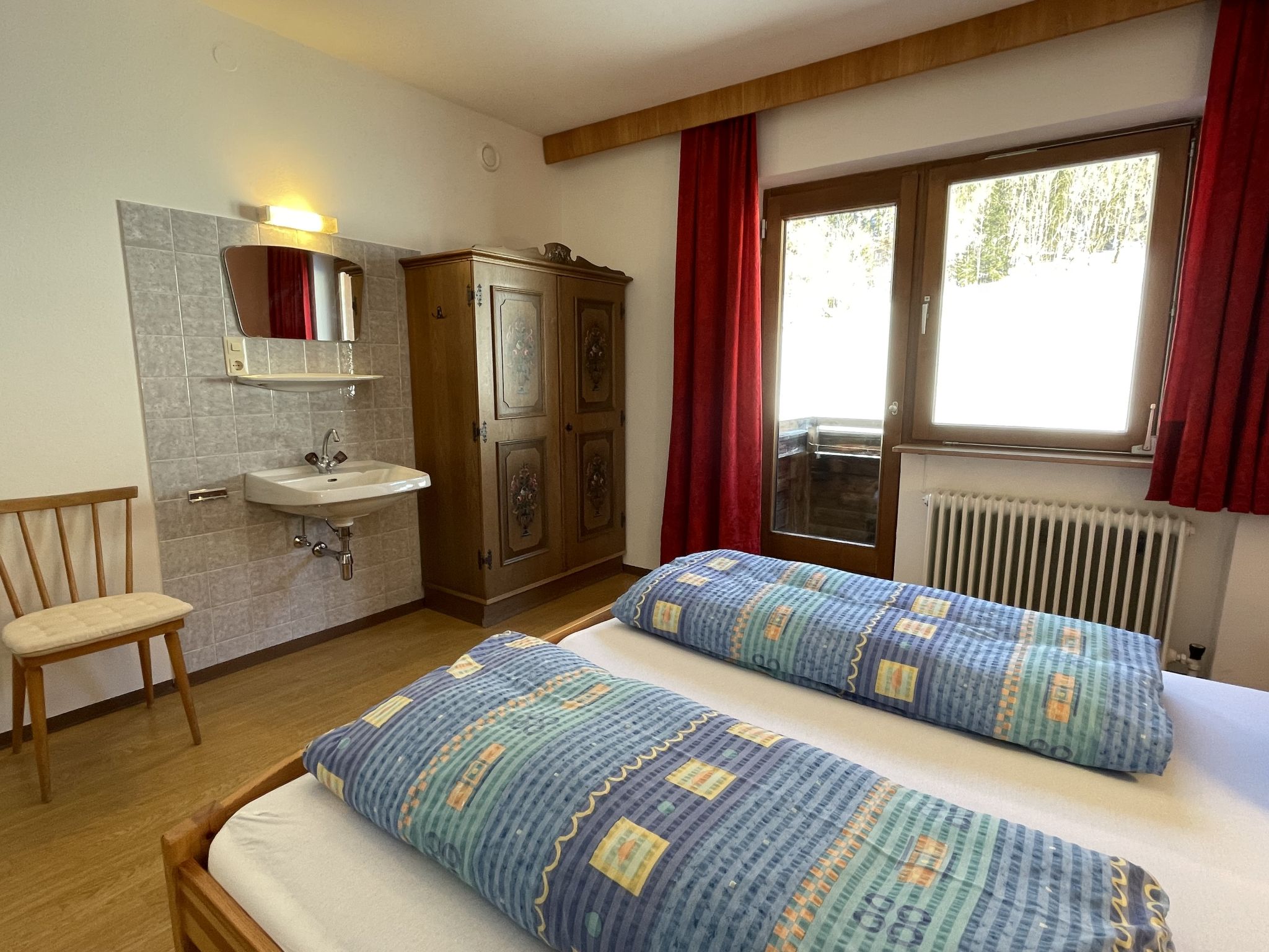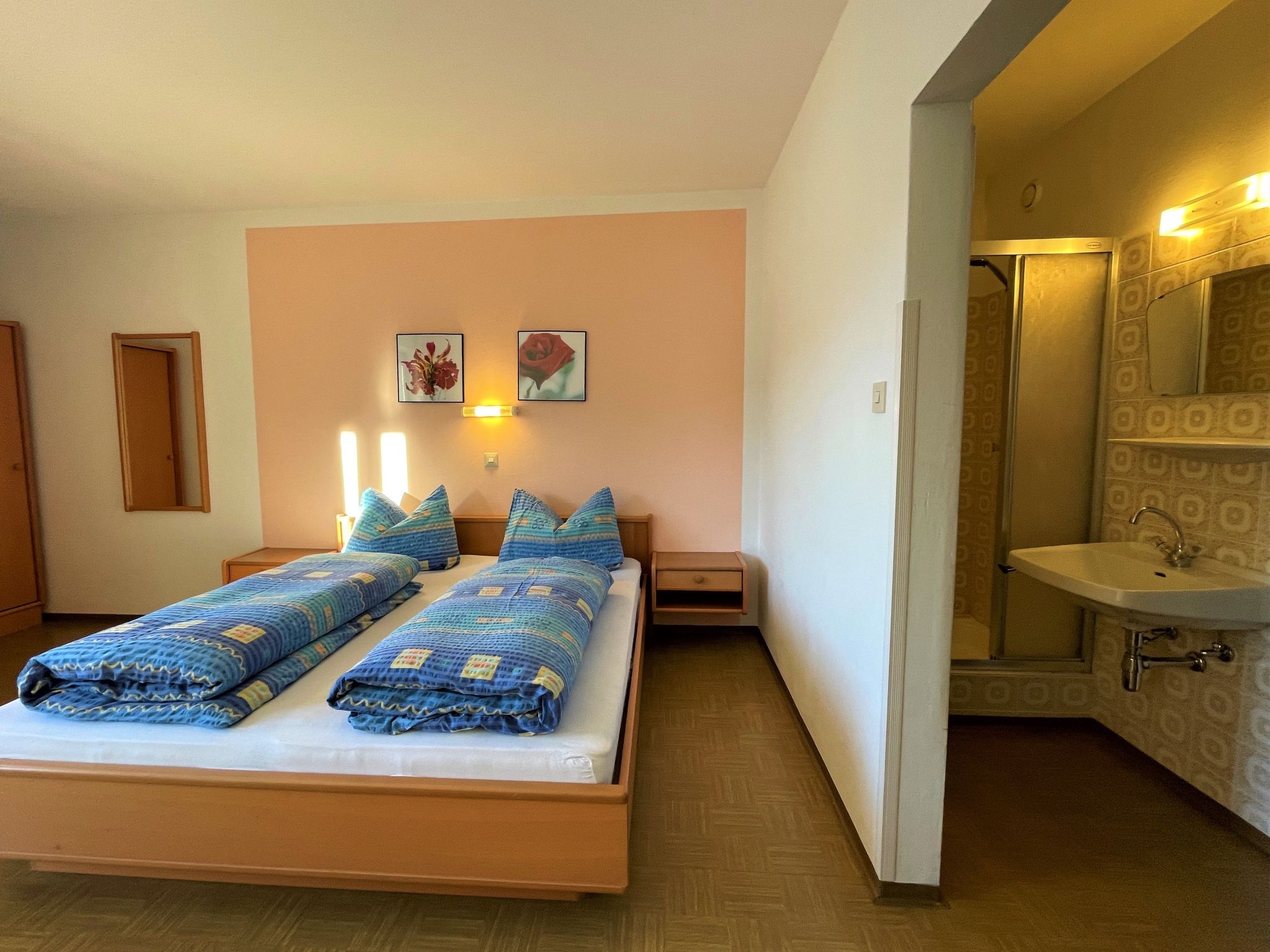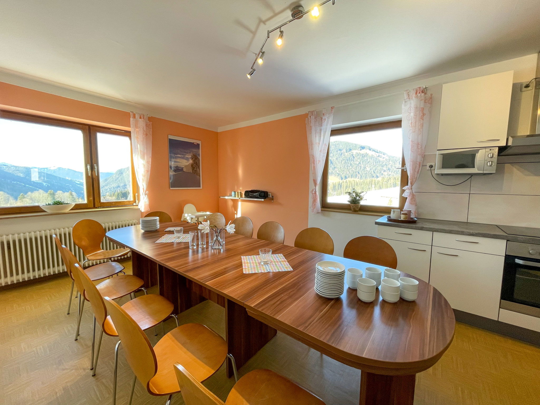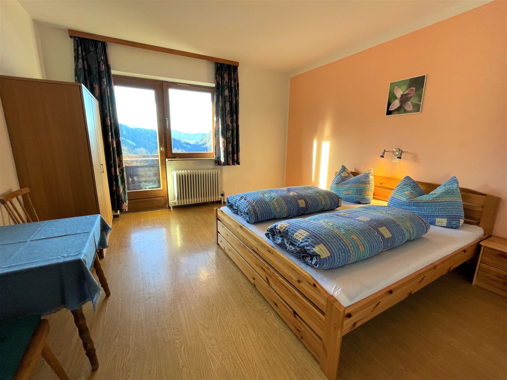"Roggenboden", 8-room apartment 200 m2 on 2nd floor, south-west facing position. Object suitable for 14 adults. Spacious and bright, simple and practical furnishings: living room with dining nook and satellite TV. Exit to the balcony. 1 double bedroom with hand-basin and shower. Exit to the balcony. 1 double bedroom with hand-basin and shower. Exit to the balcony. 1 room with 1 bed, 1 double bed and hand-basin. Exit to the balcony. 1 room with 1 double bed, 1 folding bed and hand-basin. Exit to the balcony. 1 double bedroom with hand-basin. Exit to the balcony. 1 double bedroom with hand-basin. Exit to the balcony. Large kitchen (oven, dishwasher, 4 ceramic glass hob hotplates, toaster, kettle, microwave, electric coffee machine) with dining table and radio. Shower, 2 sep. WC's. Heating. 2 balconies. Balcony furniture. Very beautiful view of the mountains and the valley. Facilities: children's high chair, baby cot. Internet (WiFi, free). Please note: non-smokers only. Maximum 1 pet/ dog allowed. Smoke alarm, fire extinguisher. When there are less than the maximum number of guests staying at the property, not all of the housing units will be available for use.