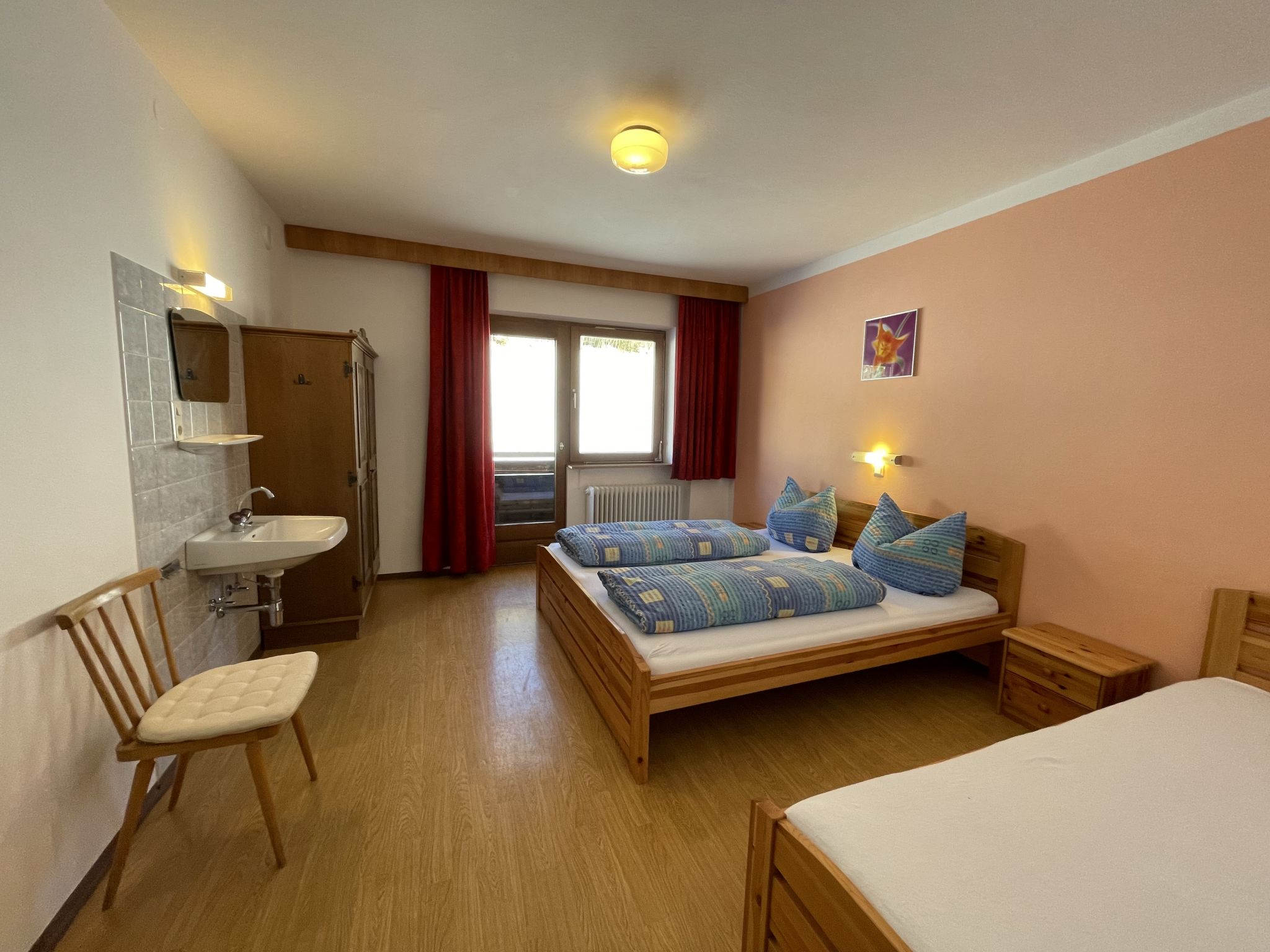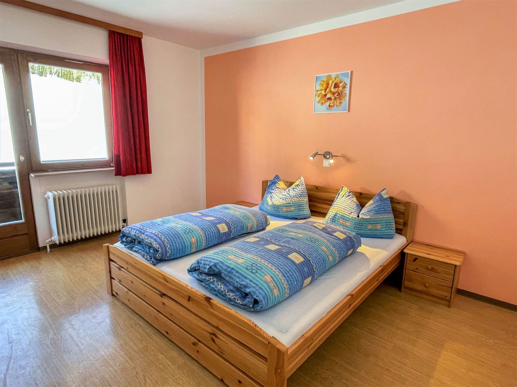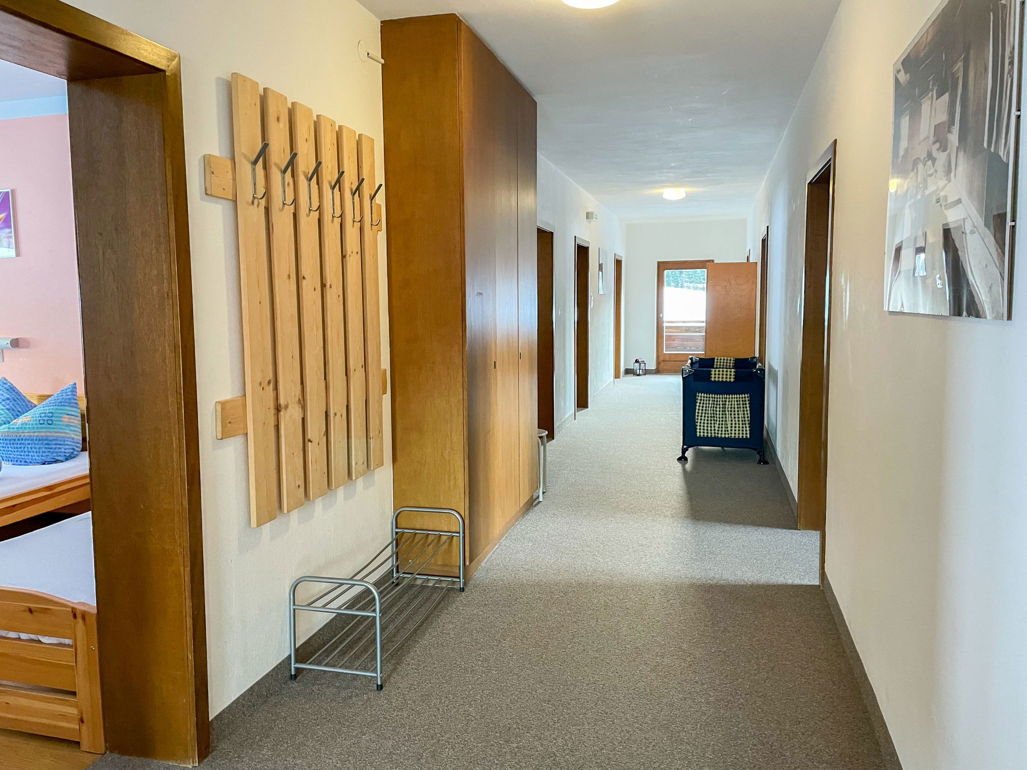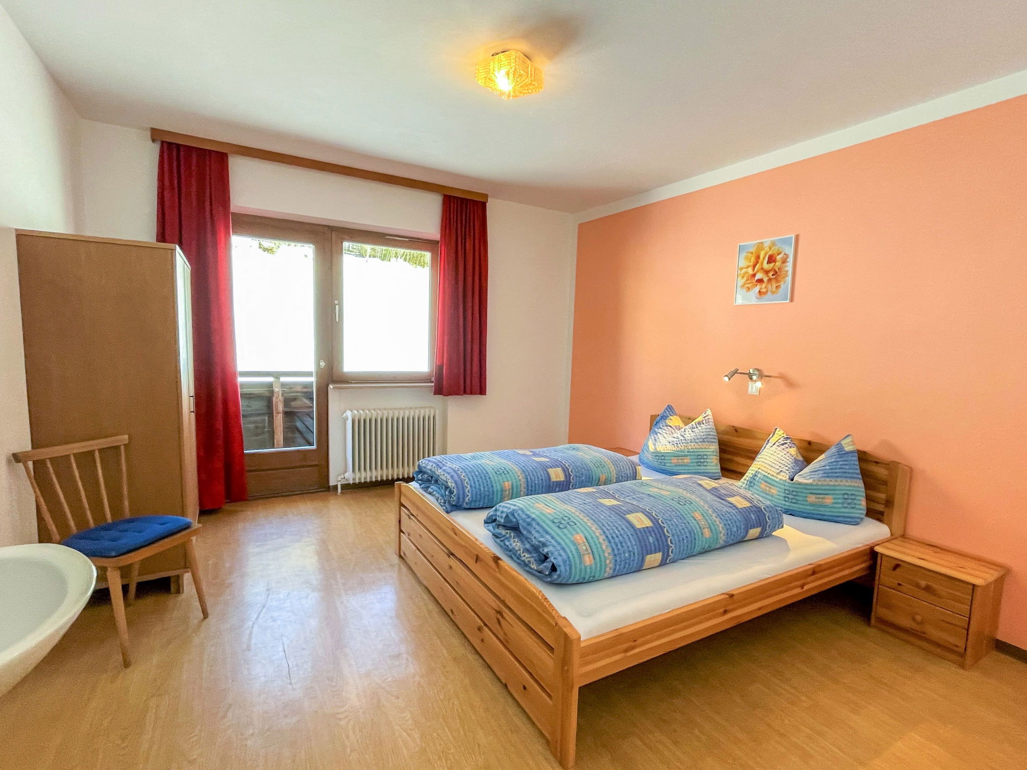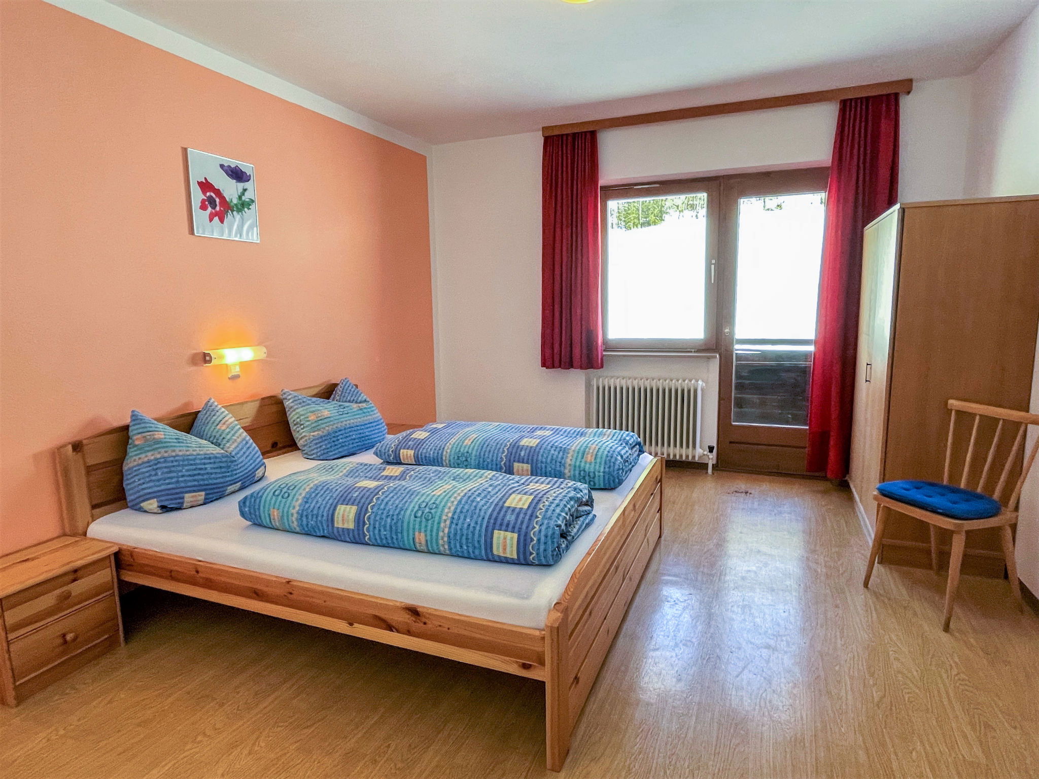 "Roggenboden", 8-room apartment 200 m2 on 2nd floor, south-west facing position. Object suitable for 14 adults. Spacious and bright, simple and practical furnishings: living room with dining nook and satellite TV. Exit to the balcony. 1 double bedroom with hand-basin and shower. Exit to the balcony. 1 double bedroom with hand-basin and shower. Exit to the balcony. 1 room with 1 bed, 1 double bed and hand-basin. Exit to the balcony. 1 room with 1 double bed, 1 folding bed and hand-basin. Exit to the balcony. 1 double bedroom with hand-basin. Exit to the balcony. 1 double bedroom with hand-basin. Exit to the balcony. Large kitchen (oven, dishwasher, 4 ceramic glass hob hotplates, toaster, kettle, microwave, electric coffee machine) with dining table and radio. Shower, 2 sep. WC's. Heating. 2 balconies. Balcony furniture. Very beautiful view of the mountains and the valley. Facilities: children's high chair, baby cot. Internet (WiFi, free). Please note: non-smokers only. Maximum 1 pet/ dog allowed. Smoke alarm, fire extinguisher. When there are less than the maximum number of guests staying at the property, not all of the housing units will be available for use.
