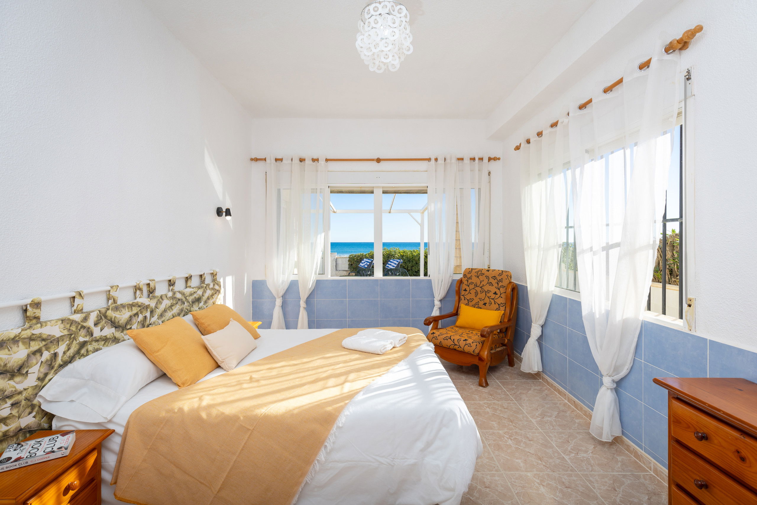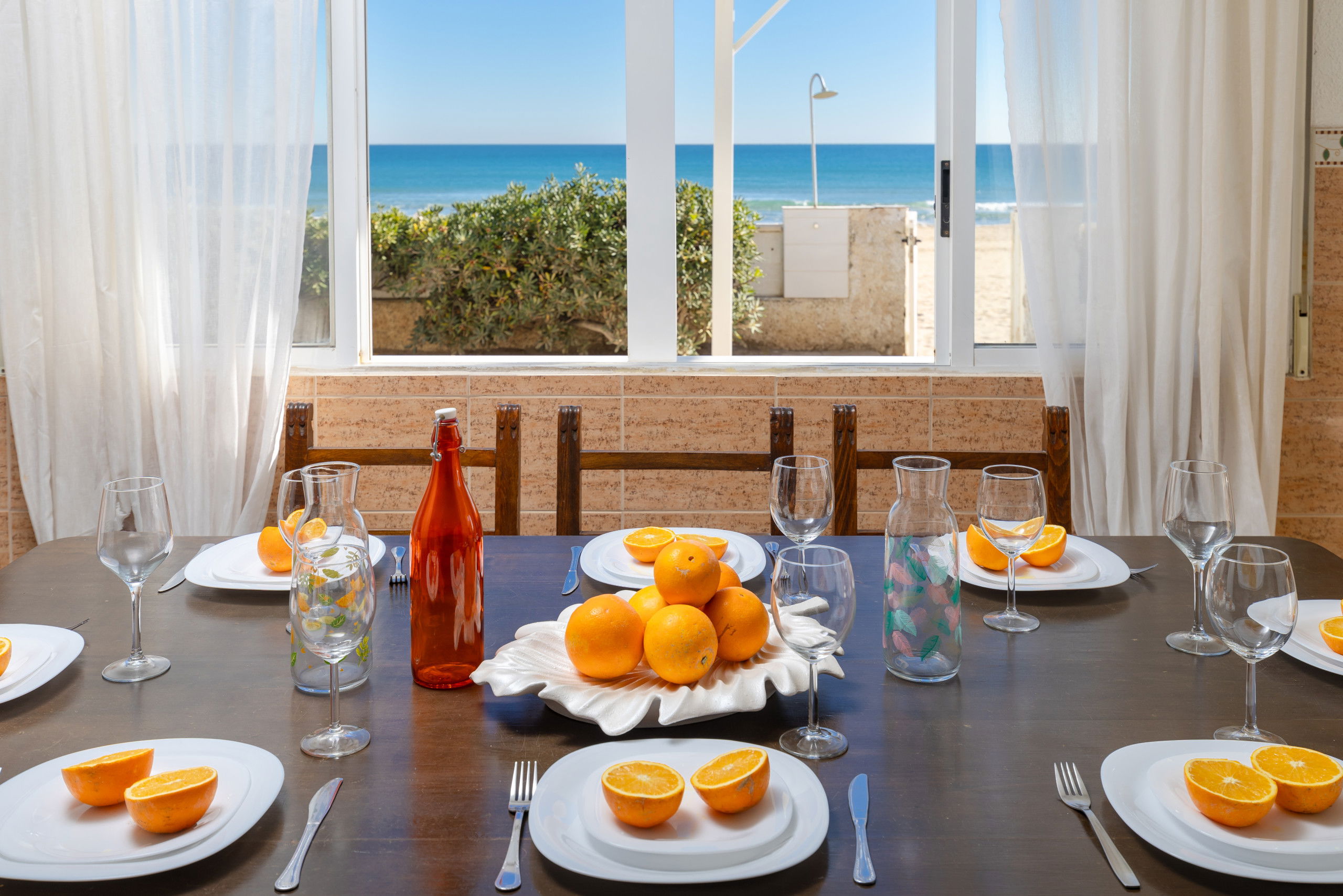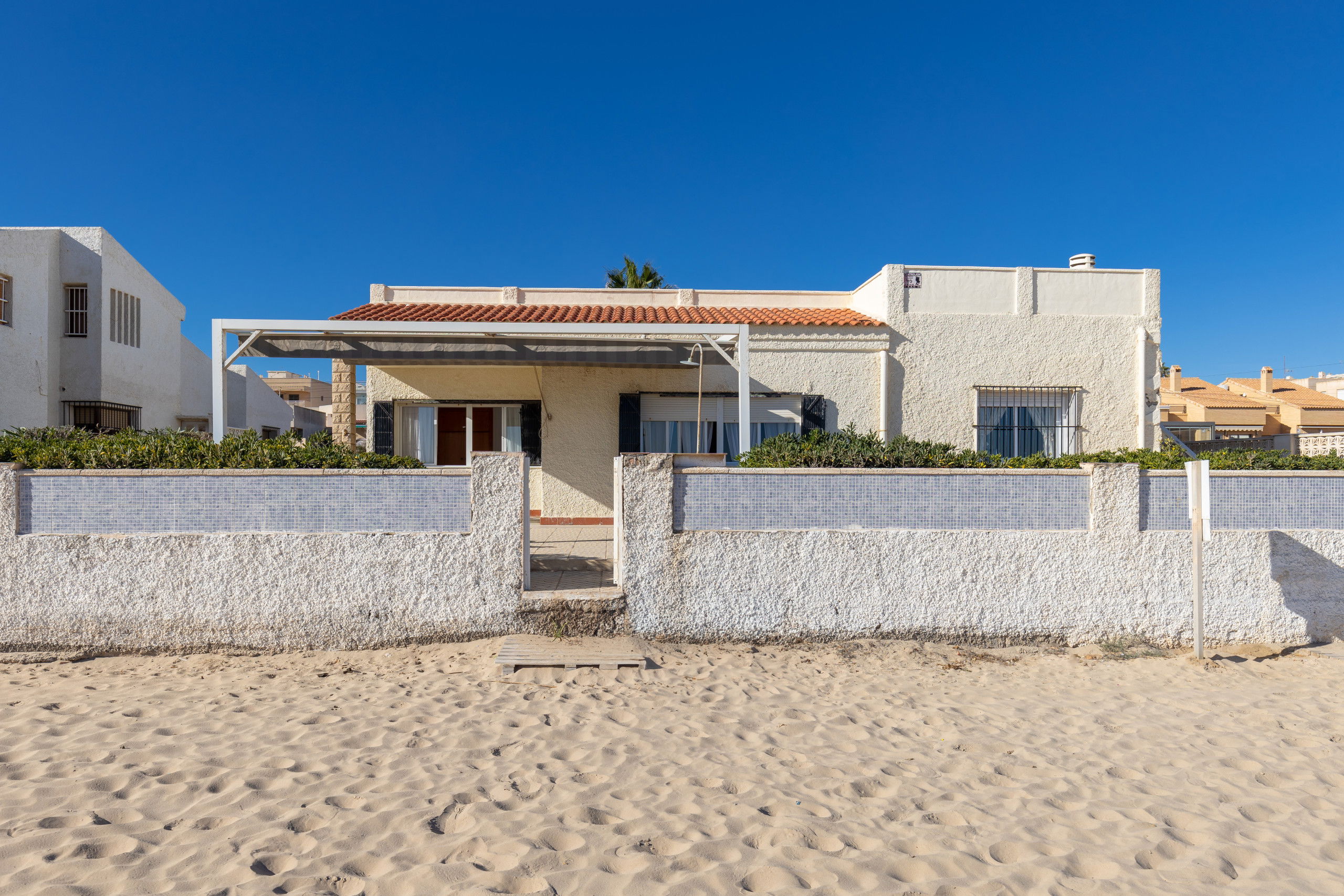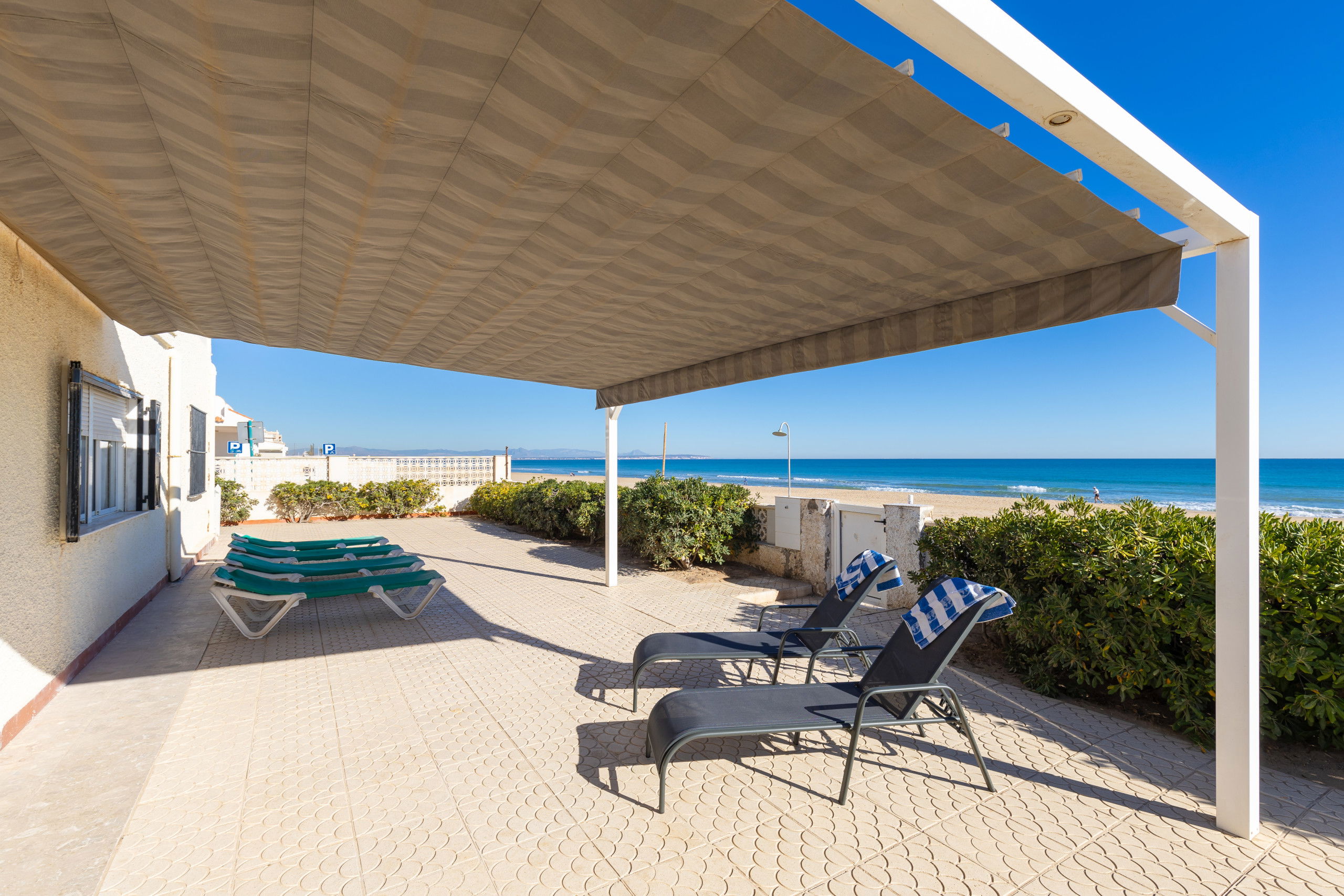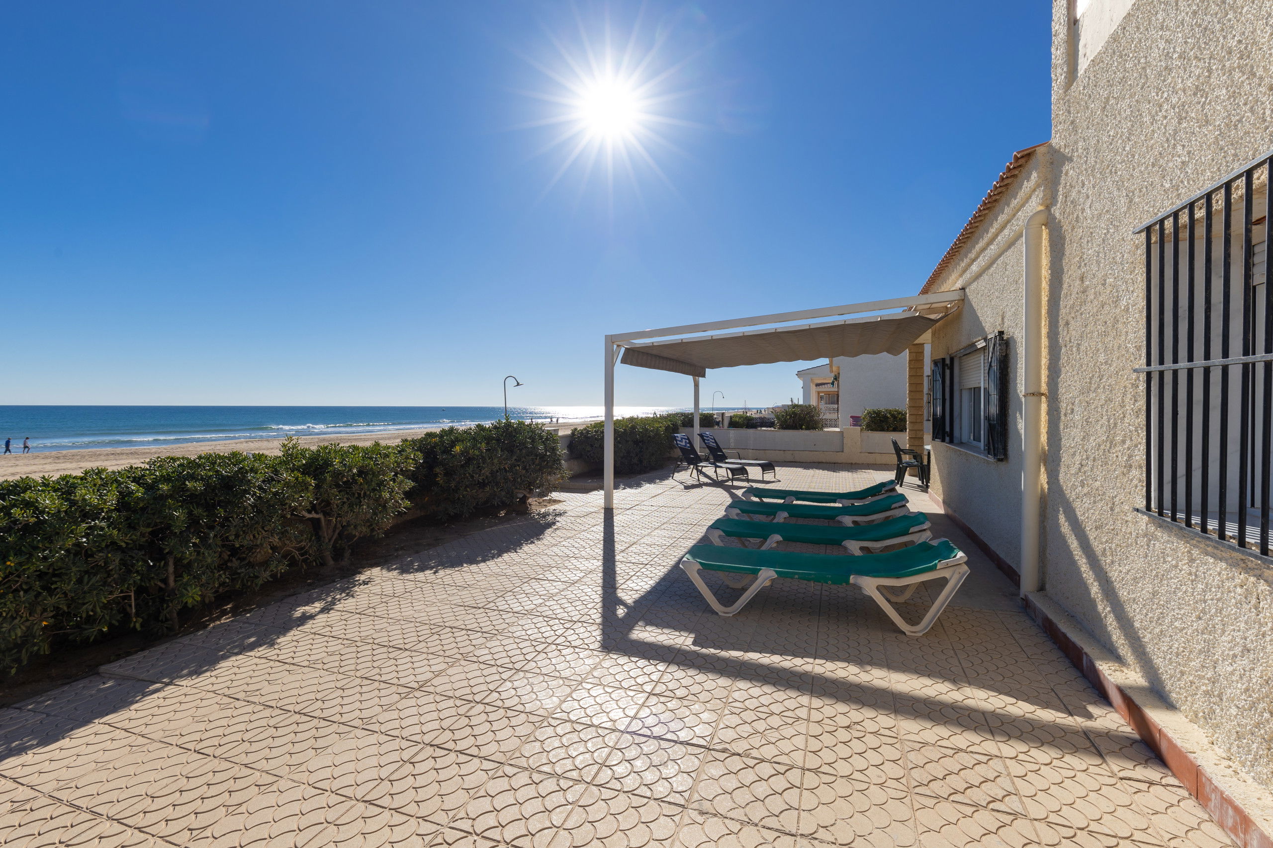 Beautiful independent villa, on the seafront in Guardamar, from the house you go out to the sand of the beach, if you like the sea, there is no better way to enjoy it, with large terraces, barbecue, from anywhere you are watching the sea As if it were a painting, it has 4 bedrooms with 4 bathrooms en suite, each bedroom has its own bathroom and capacity for 8 people.