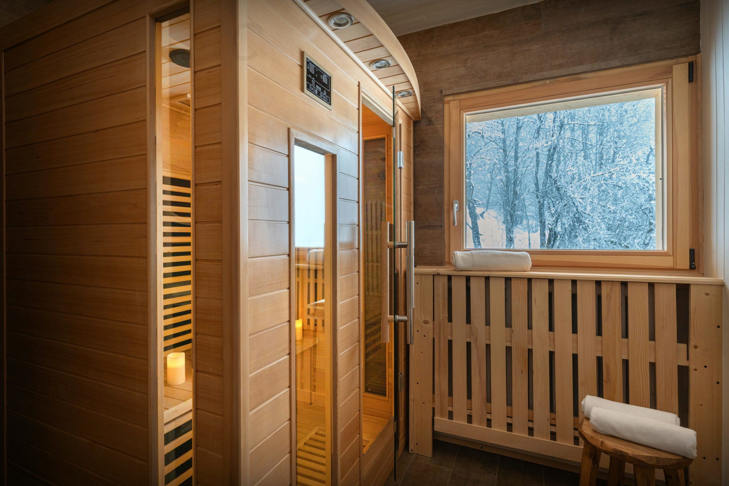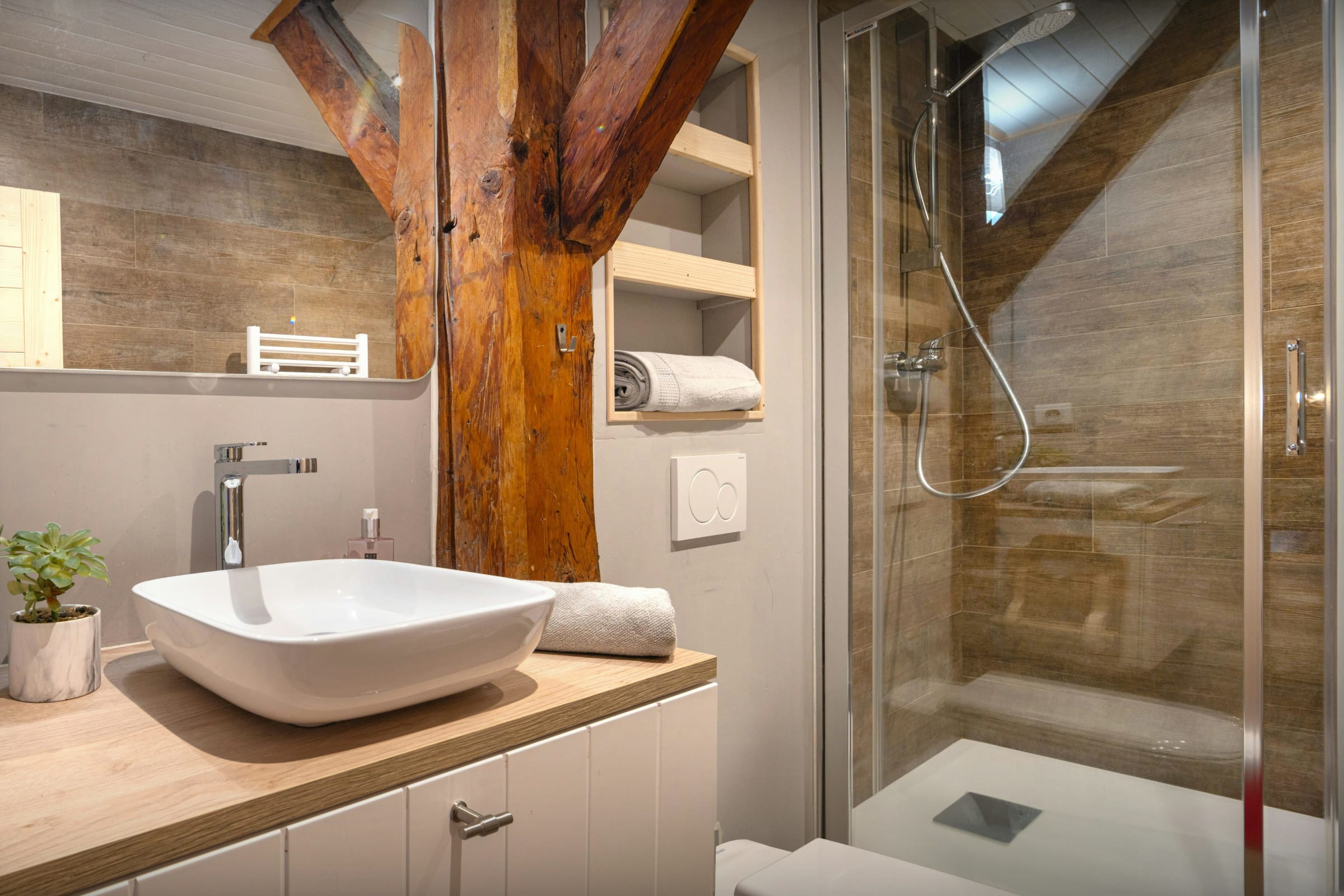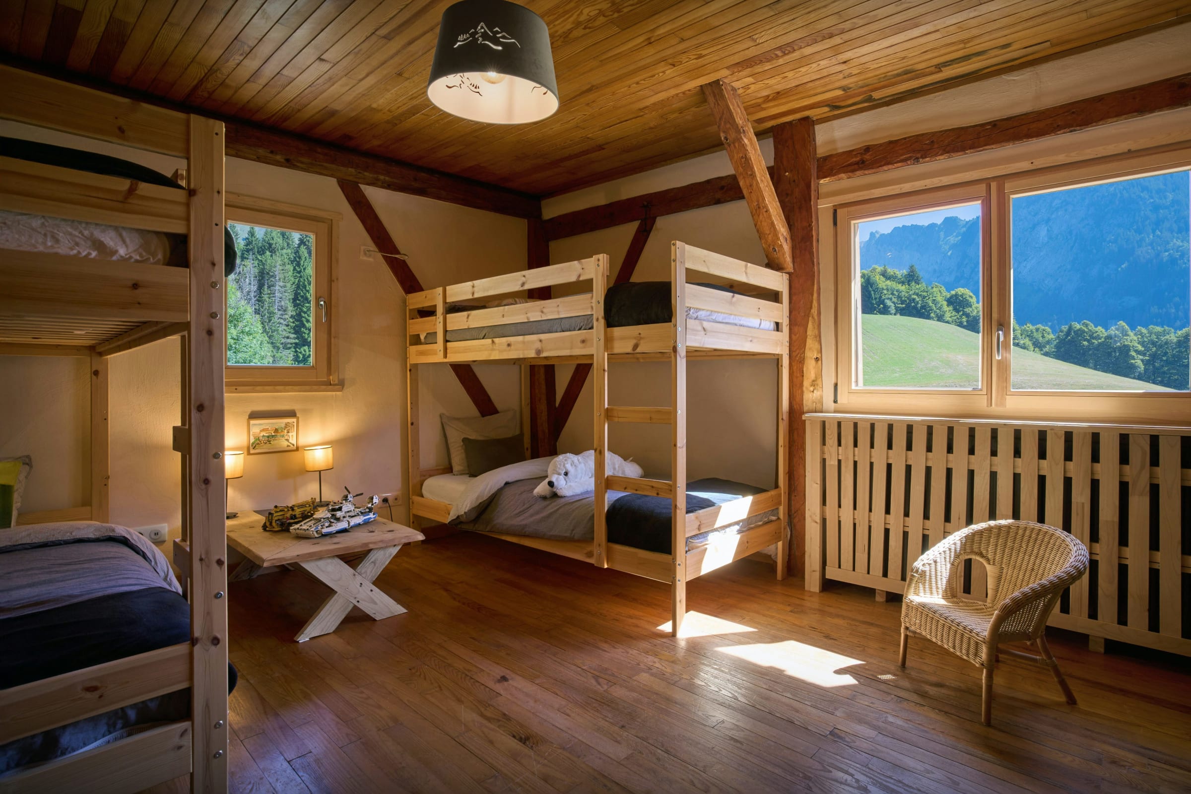 Up to 8 people can sleep on the upper floor, in 2 double bedrooms and 1 dorm-style room with 2 bunk beds. On this floor, there are also 2 bathrooms, the sauna, and a 2nd living area with a small kitchen, and access to a balcony. We particularly like this room, which will allow the whole group to come together, whatever their needs.