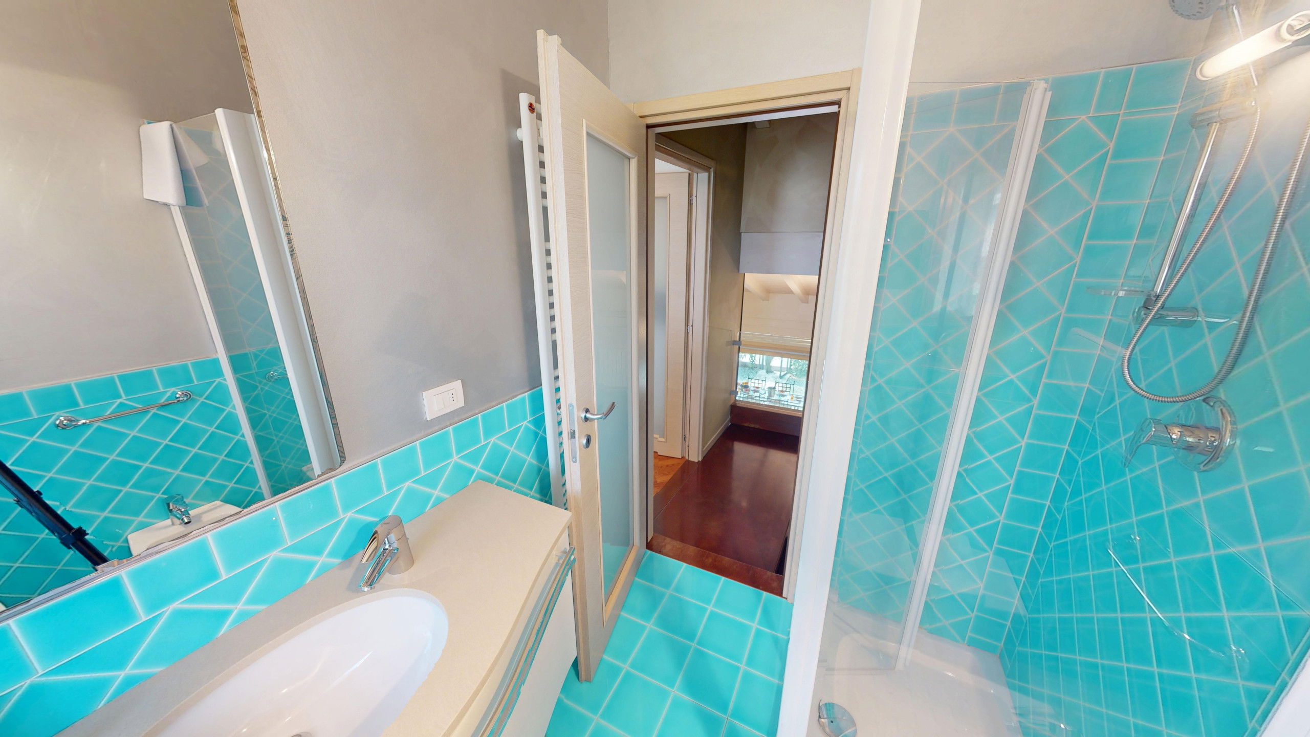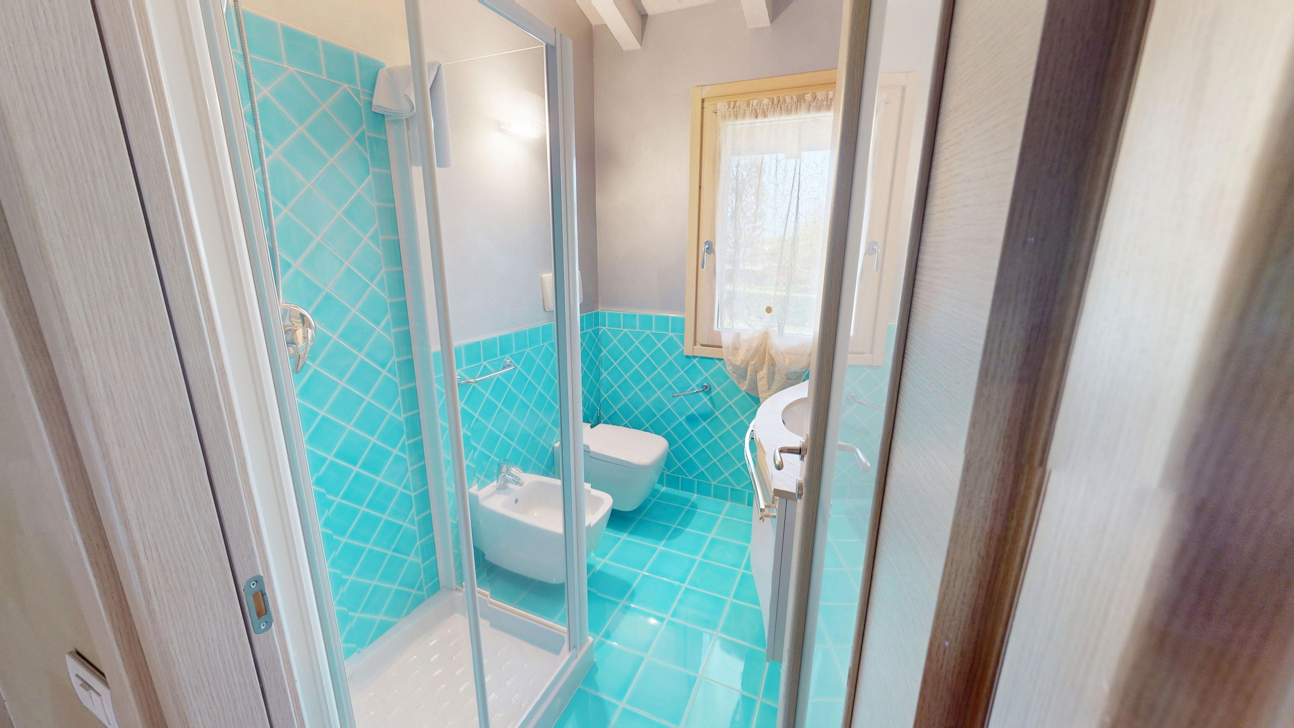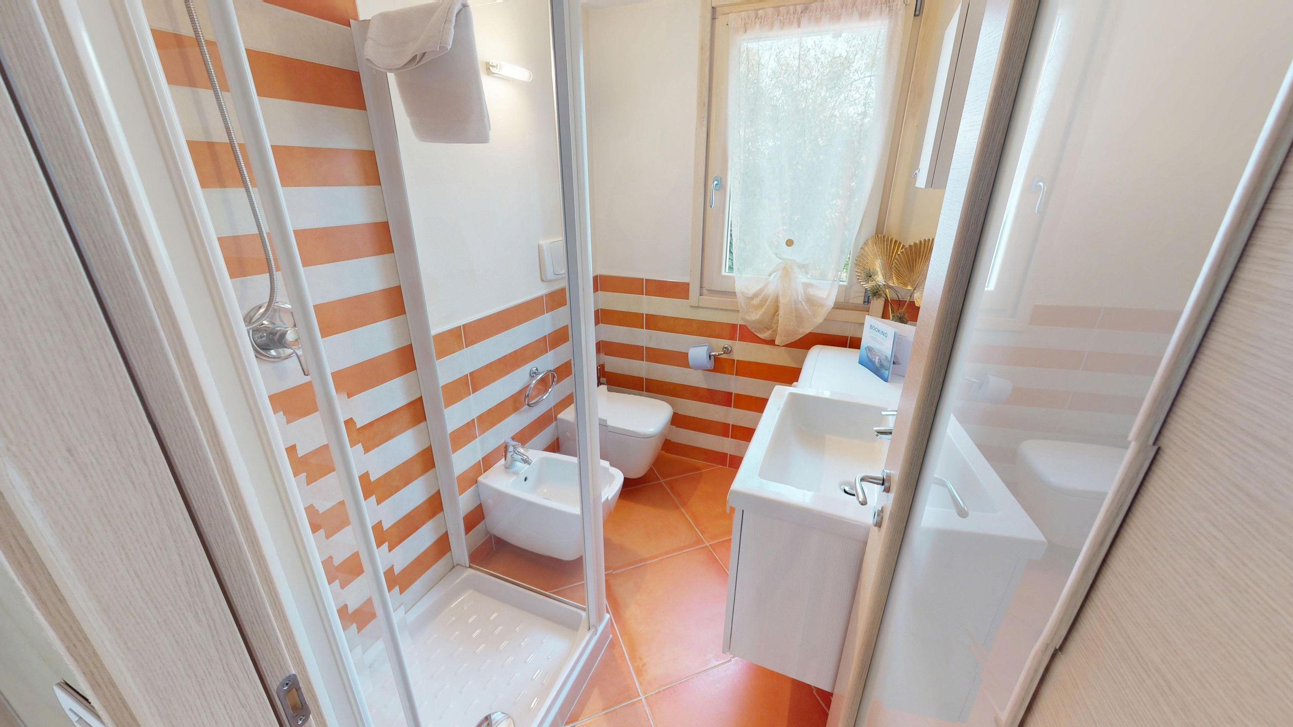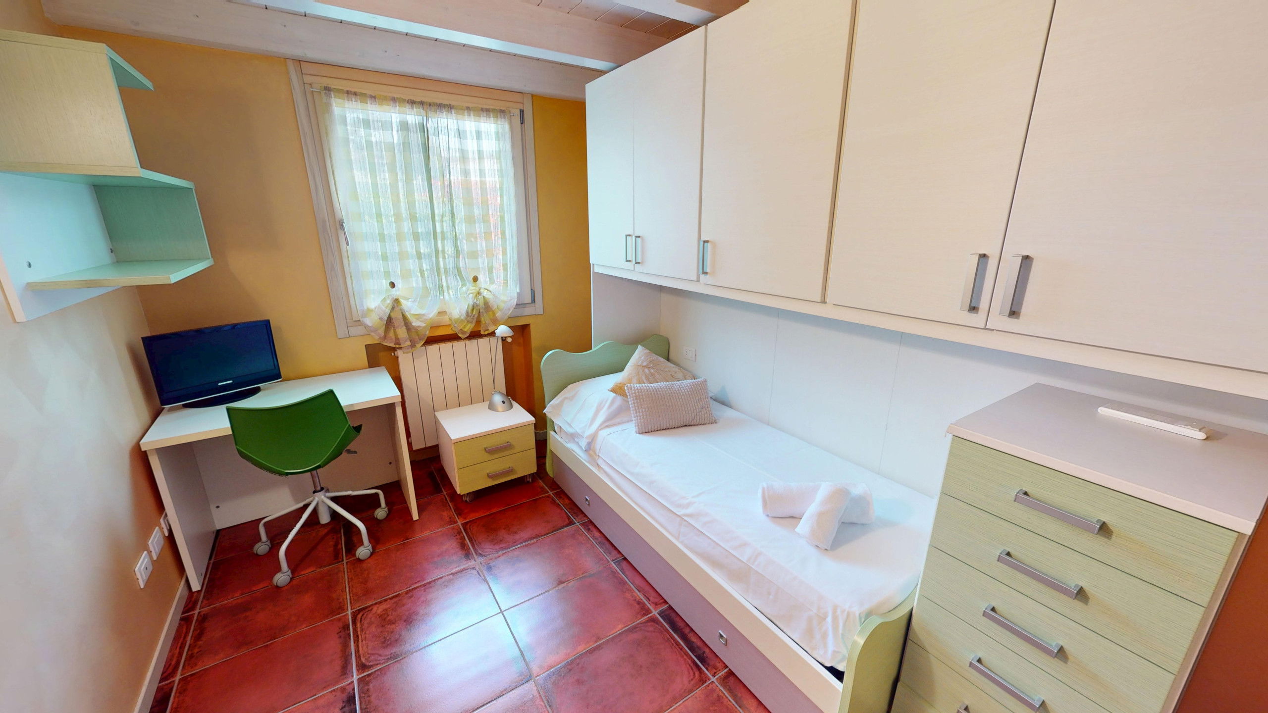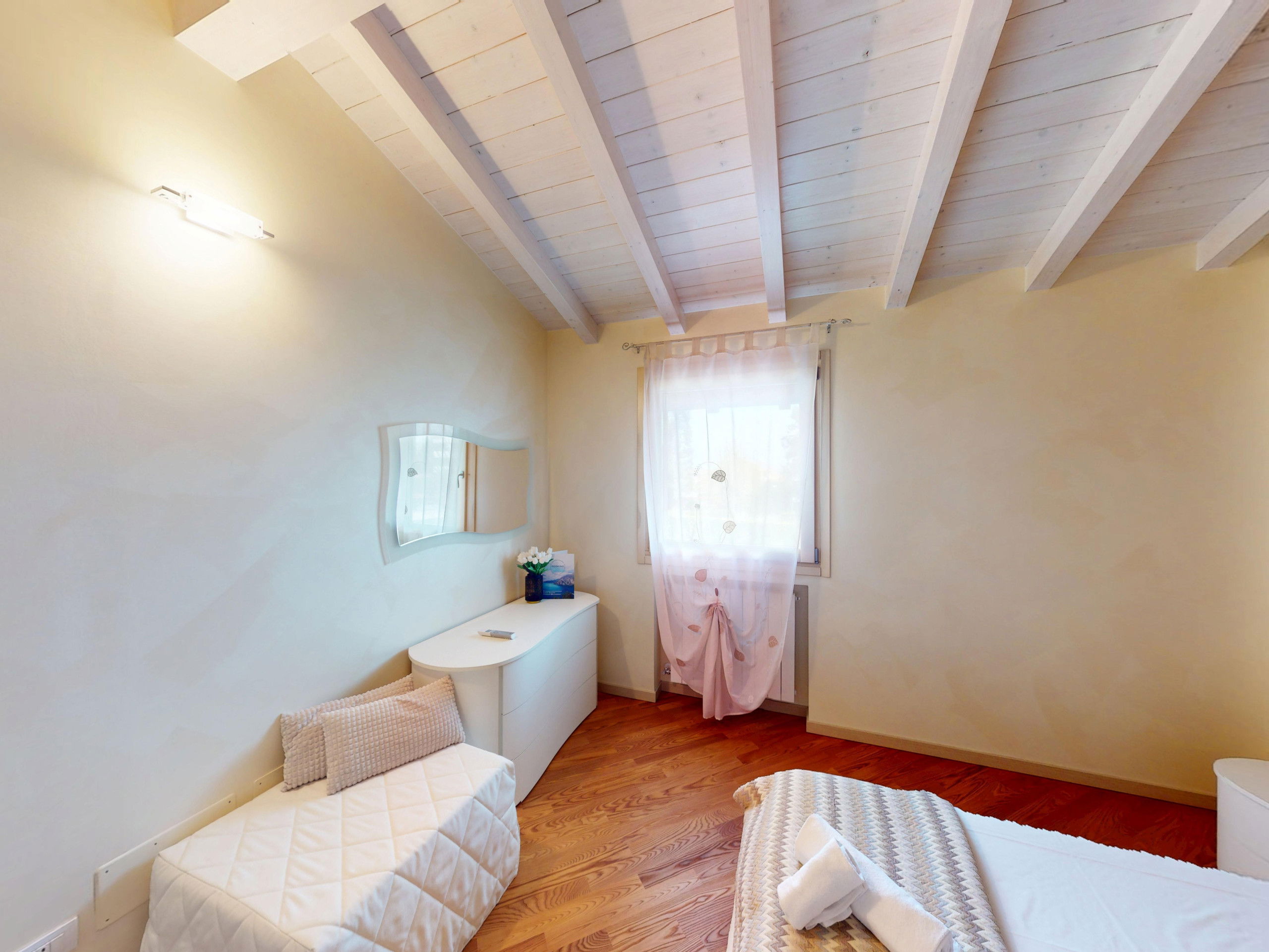 Two bedrooms on two levels: a double room with a private bathroom on the upper floor, and one with two single beds on the ground floor, guarantee privacy and comfort.