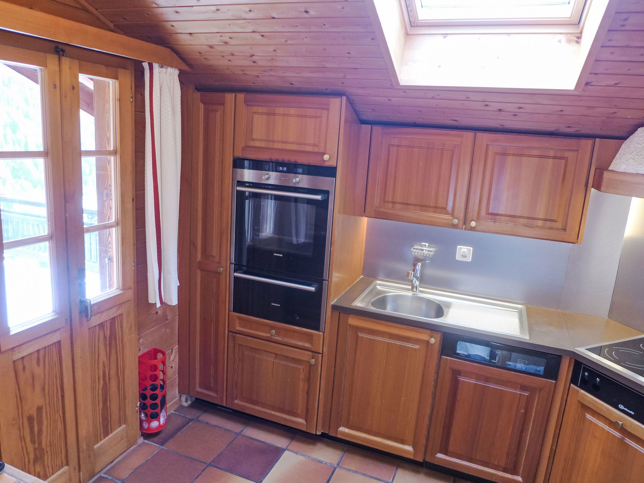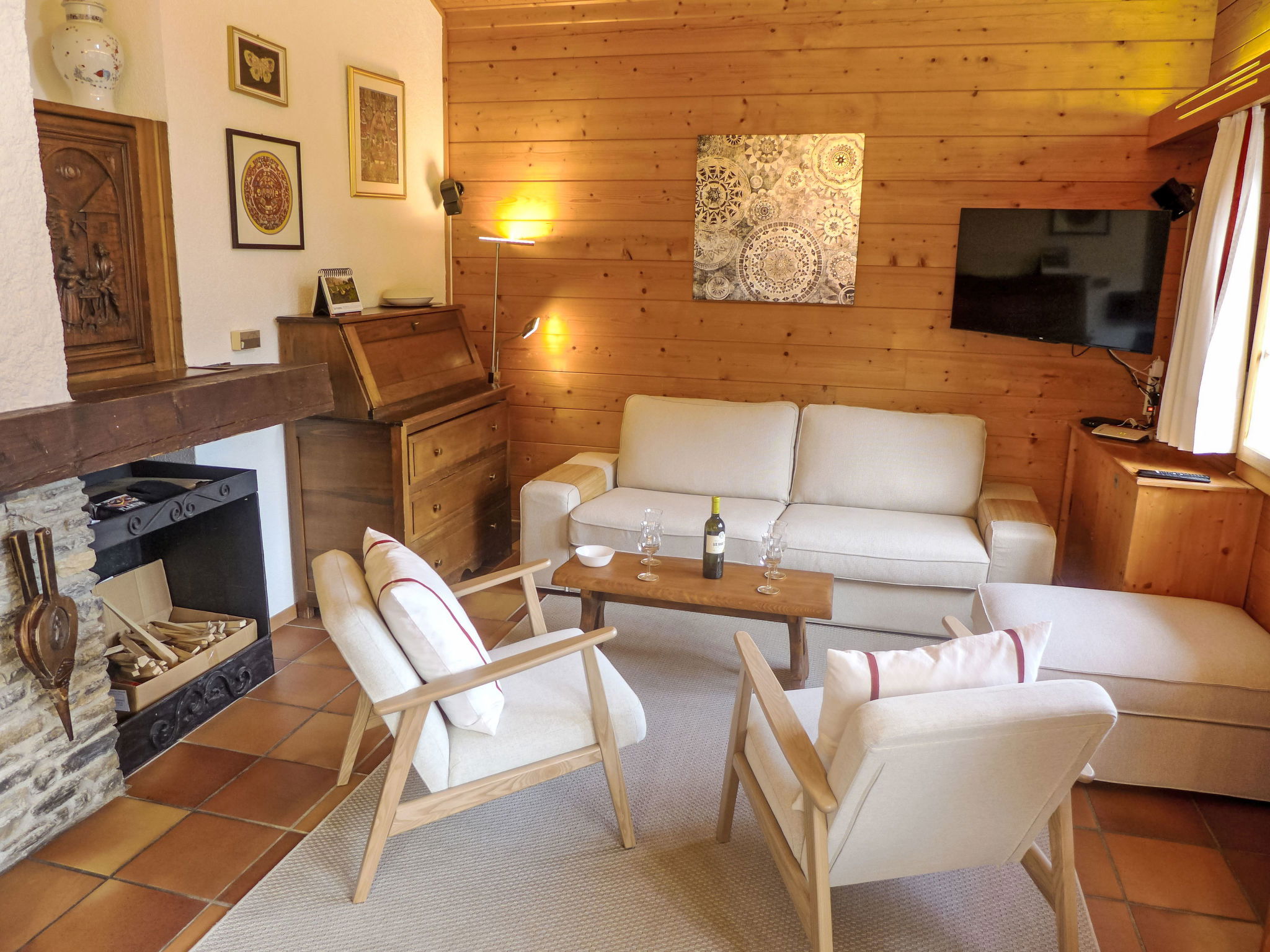 "Les Clarines", 4-room chalet 100 m2 on 2 levels. Tasteful and wooden furniture furnishings: living/dining room with open-hearth fireplace, dining table, dining nook, cable TV and radio. Open kitchen (oven, dishwasher, 4 ceramic glass hob hotplates, microwave, freezer, electric coffee machine, Capsules for coffee machine (Nespresso) extra, raclette grill, fondue Set (cheese)). Exit to the balcony. Sep. WC. On the lower ground floor: 1 room with 1 french bed (160 cm, length 200 cm). Exit to the terrace. 2 rooms, each room with 2 beds (90 cm, length 190 cm). Bath/WC, shower. Electric heating. Balcony, south facing position and, east facing position, small terrace, south facing position. Balcony furniture, box-room. Beautiful panoramic view of the mountains, the countryside and the resort. Facilities: iron, hair dryer. Internet (WiFi, free). Garage (1 car), height 180 cm. Please note: non-smoking house. Maximum 2 pets/ dogs allowed.