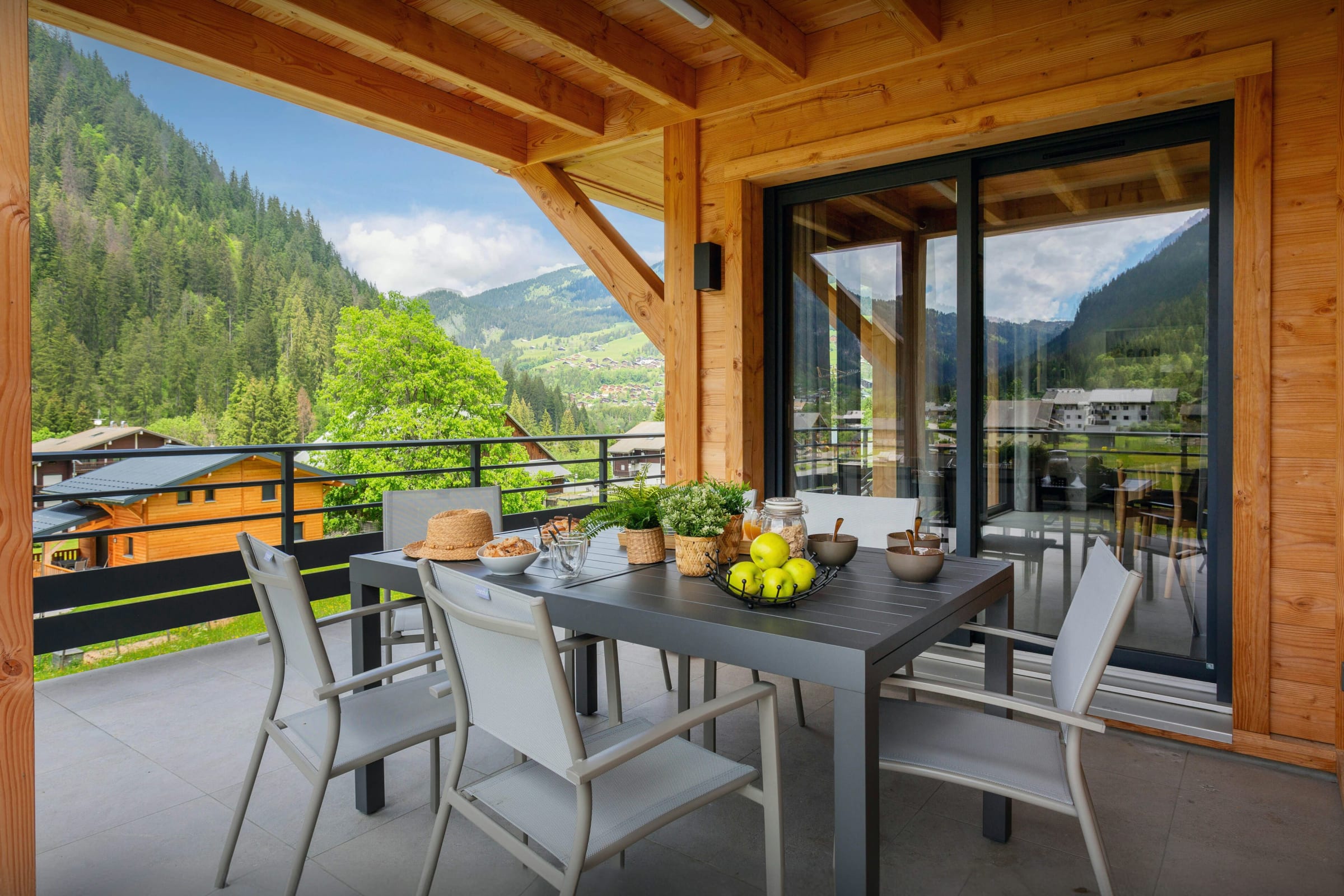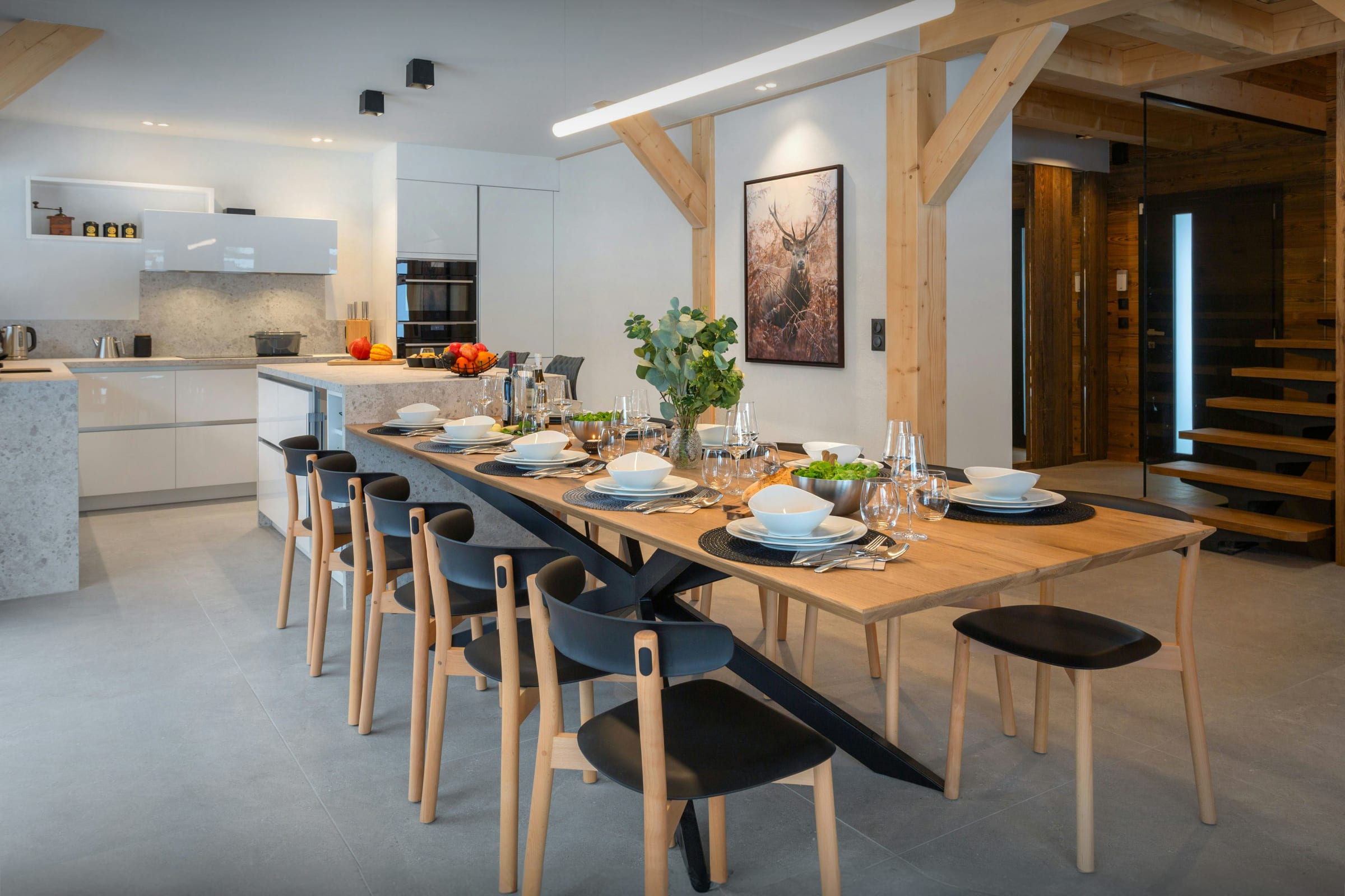 The open-plan living area opens onto a spacious furnished balcony, which wraps around two sides of the house so that you can chase the sun, and also boasts a brand-new hot tub. There's plenty of room to eat out here in the summer, and in the winter, you can wrap up and enjoy some stargazing. Or you could relax in the wellness area, which has a sauna, shower and exercise room.