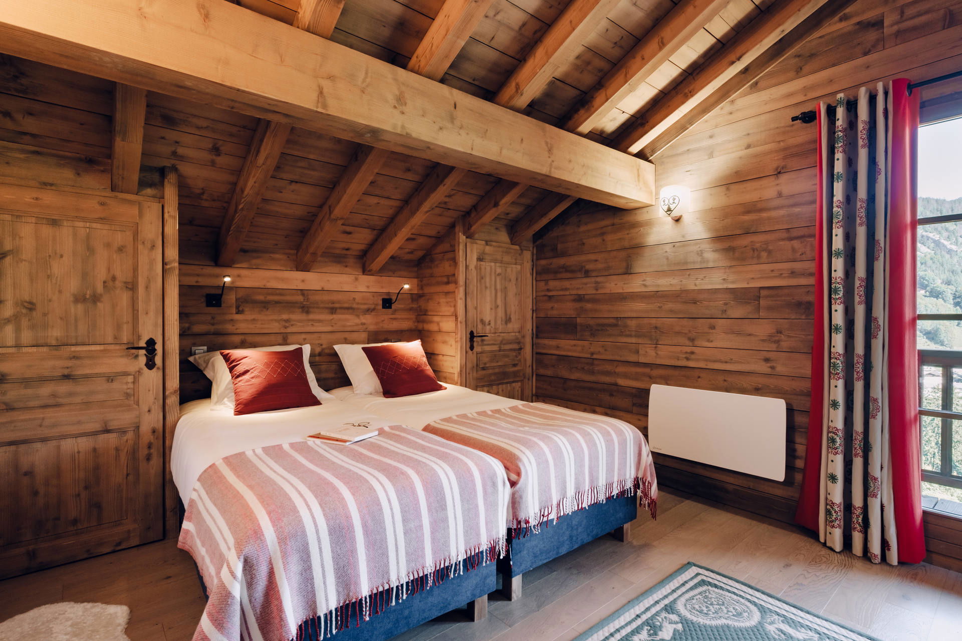 - BEDROOM (14.66 m² including 9.56m² mansard roofed) : 2 SINGLE BEDS (90), east facing French window + balcony, village / mountain view