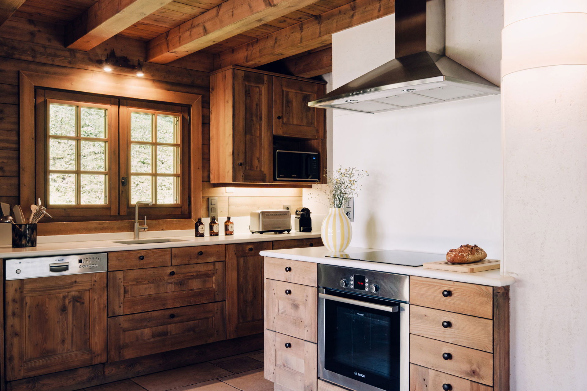 - KITCHEN (11.23 m²): fridge + freezer (250 L), oven, GLASS-CERAMIC STOVE, MICROWAVE, DISHWASHE, NESPRESSO coffee machine, cellar with WASHING MACHINE, TUMBLE DRYER, west facing window, fields / next door chalets view