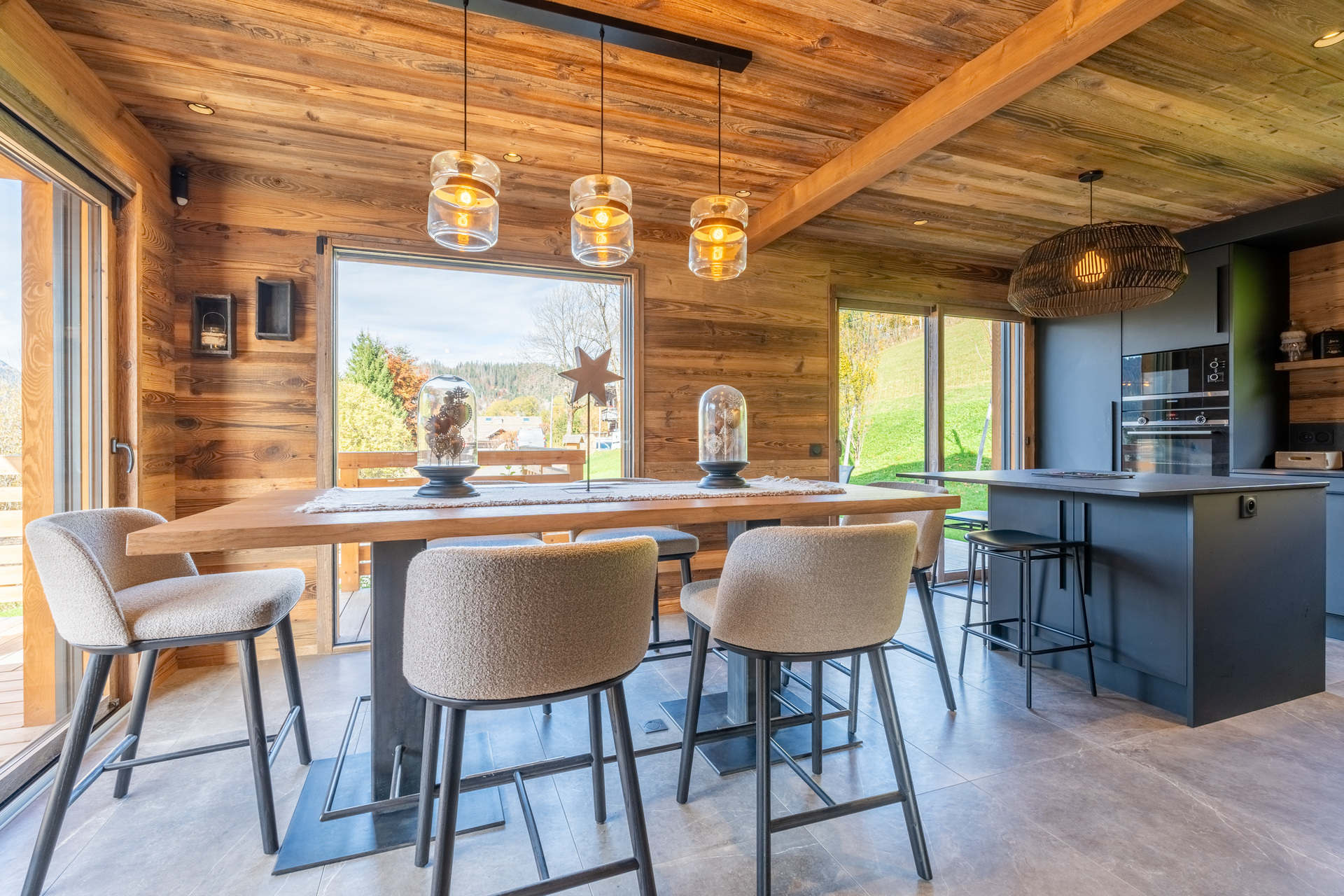 - Open KITCHEN: fridge + freezer (286 L), INDUCTION STOVE, OVEN, MICRO WAVES, DISHWASHER, NESPRESSO coffee machine, east facing window, vegetation / nextdoor chalets / mountain view, eating place, west/north facing bay window + sliding bay-windows, balcony and terrace west-north access, vegetation / nextdoor chalets / mountain view
