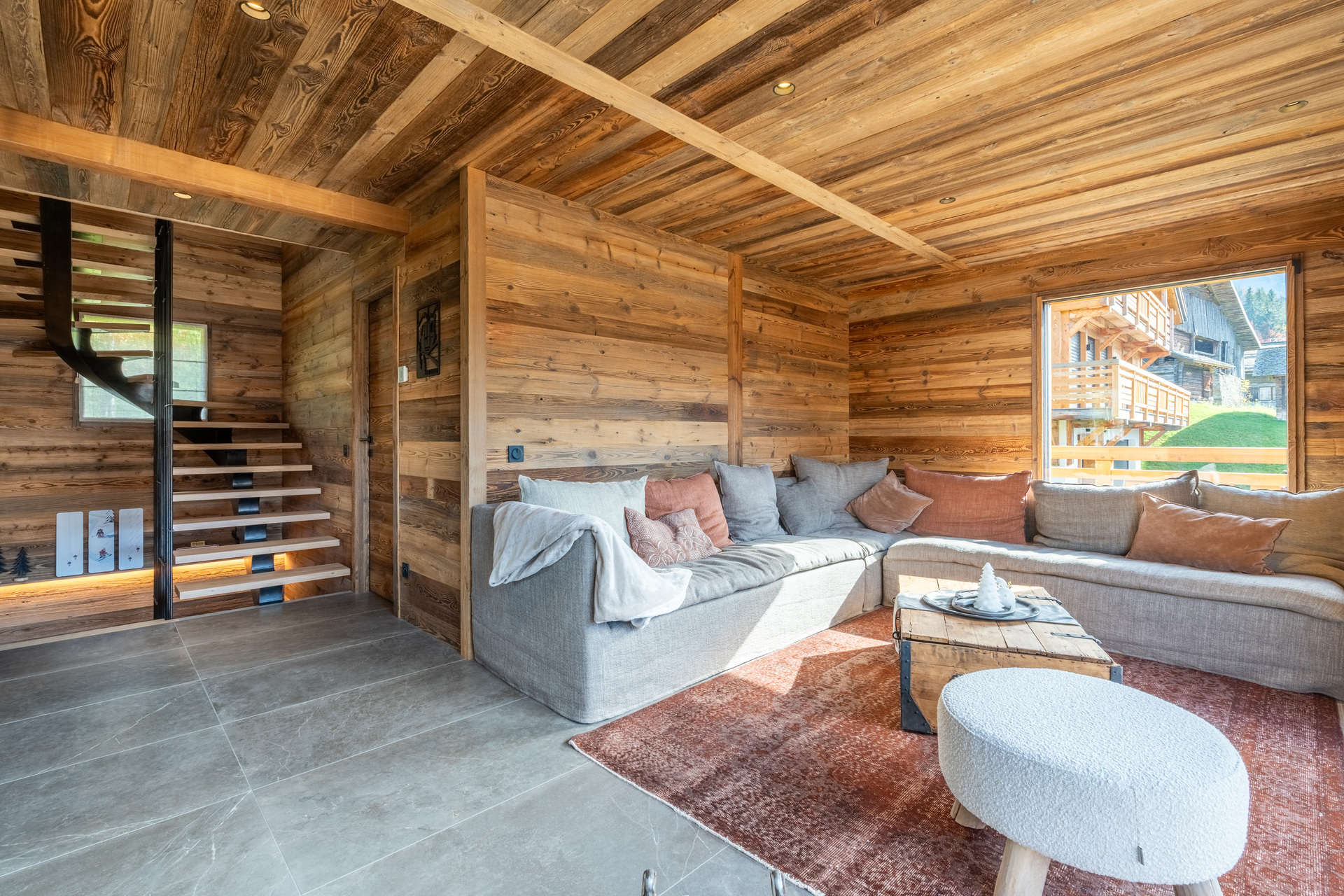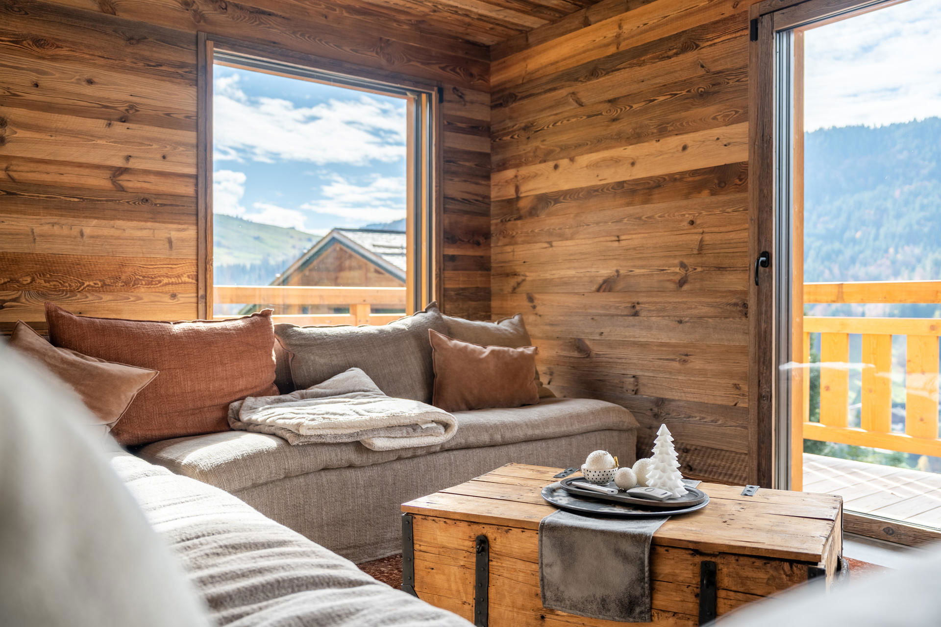 - LIVING-ROOM (46.95 m²): FIREPLACE, flat screen TV, lounge place, pleasure sofa, south facing window + south/west facing bay window + sliding bay-window, balcony south-west access, vegetation / nextdoor chalets / mountain view