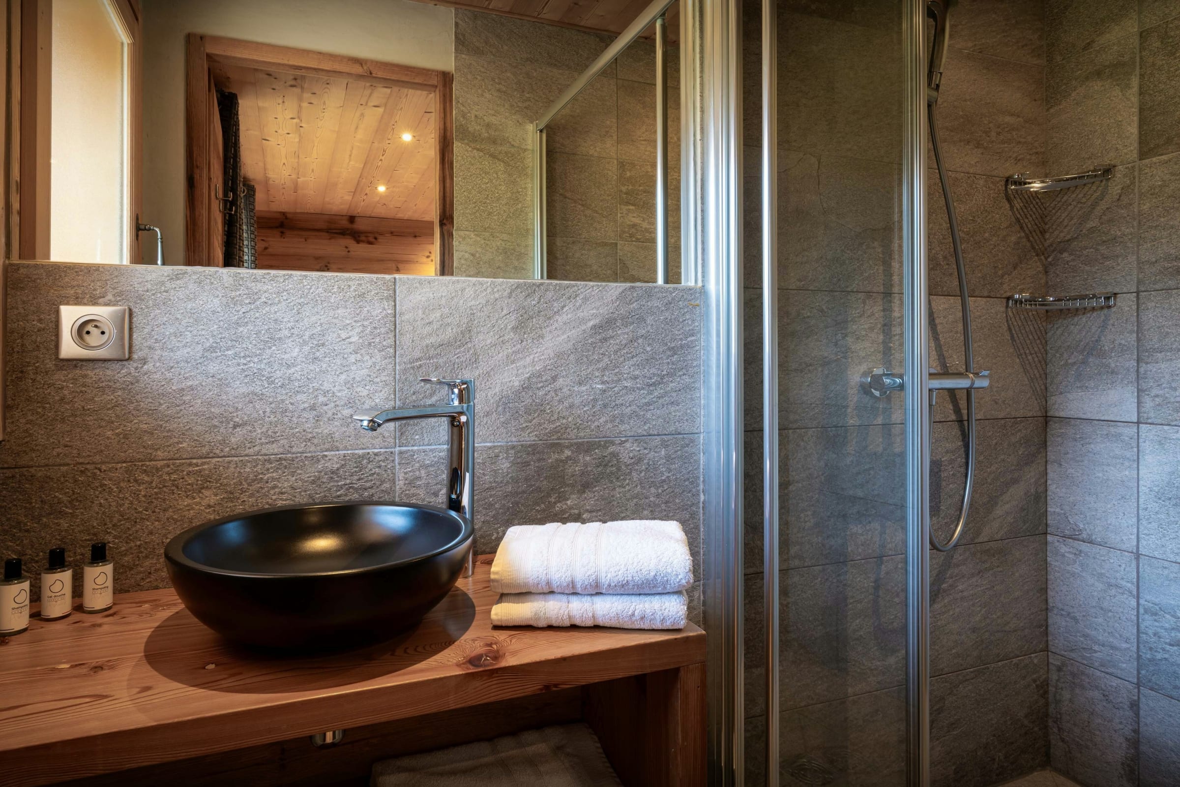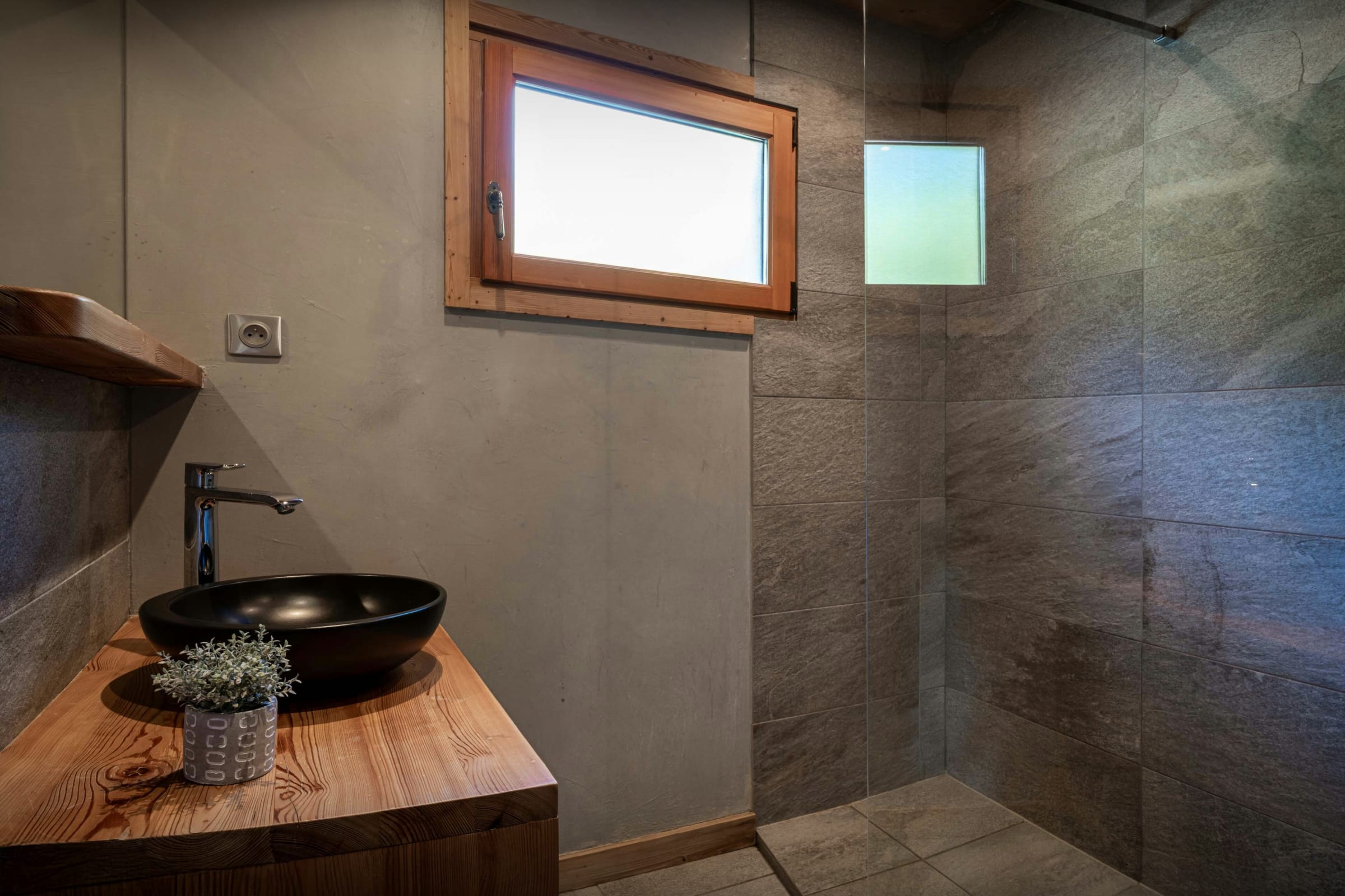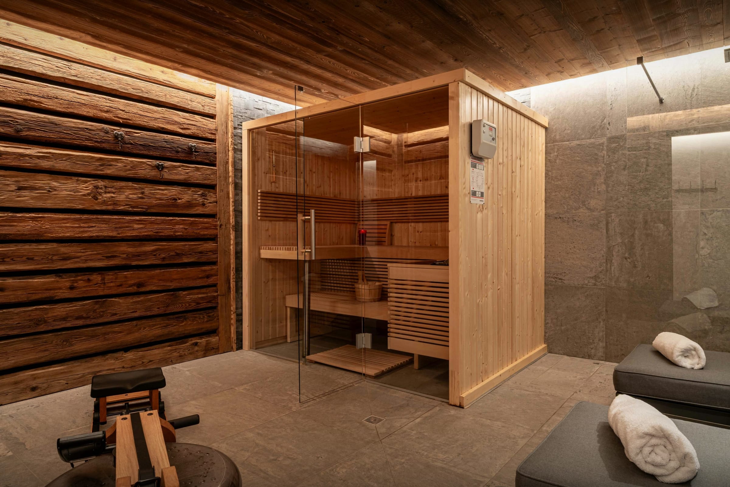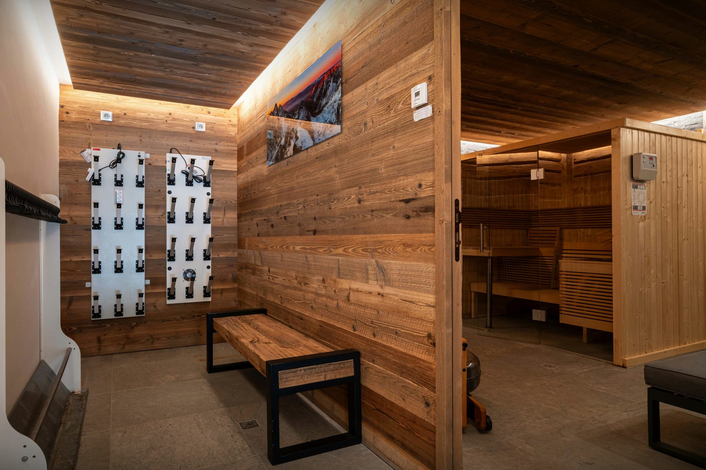 Upstairs there is a double bedroom and a larger 4 people dorm under the eaves. These rooms share a stylish shower room. The dorm can be either set up with 4 single beds, or as a family room with one double bed and two single. There are a further two double en suite bedrooms in the lower level, where you'll also find a really useful ski store (for 12 pairs of skis, with also 2 boot warmers), lots of hanging space, a laundry and drying room, and more importably a fantastic sauna to relax after an active day in the mountains.