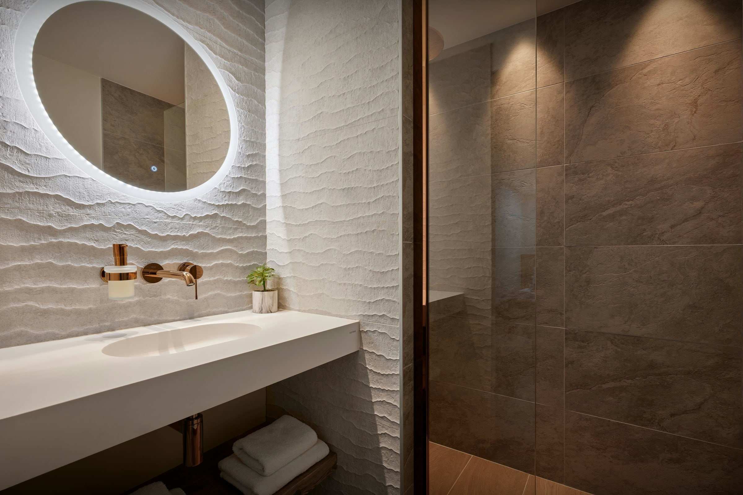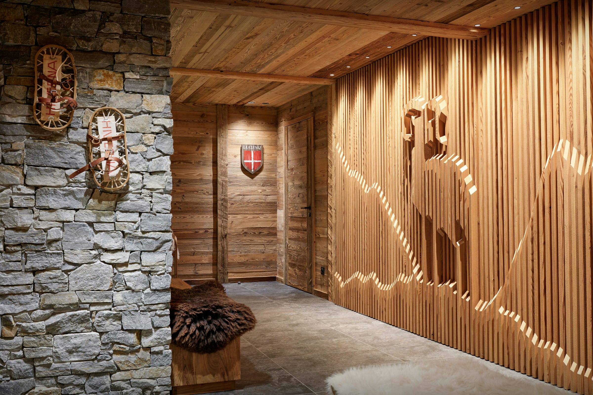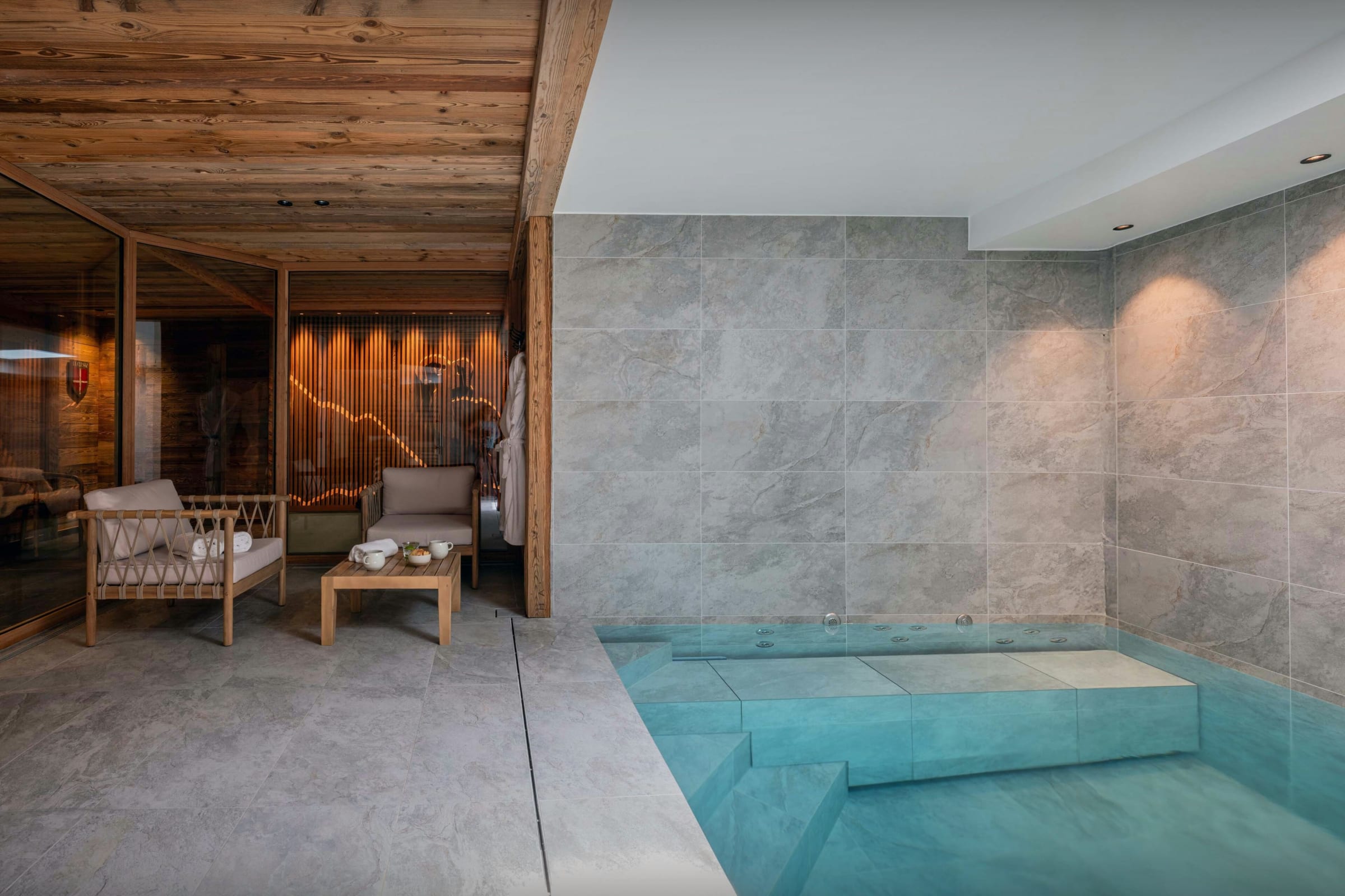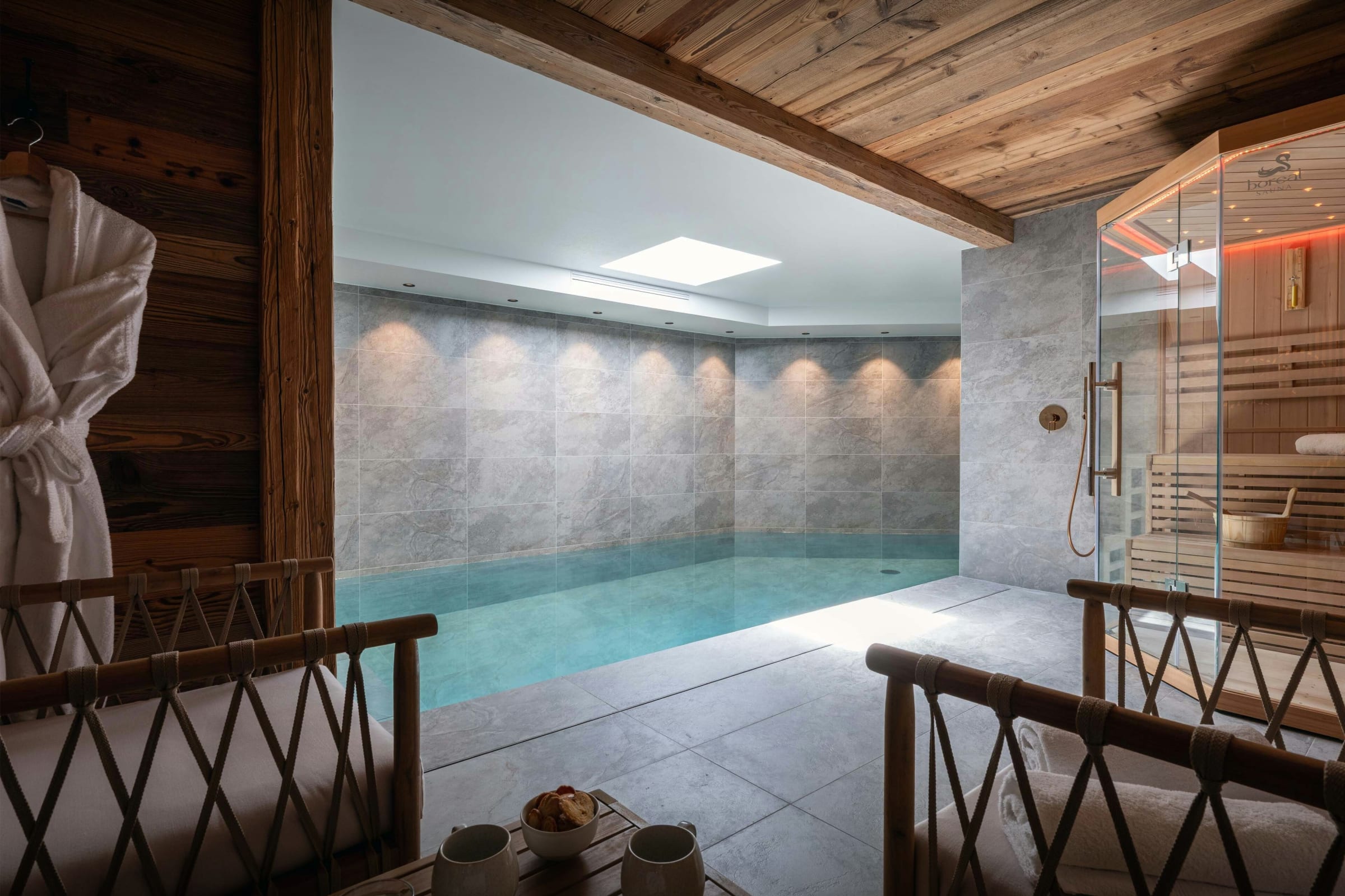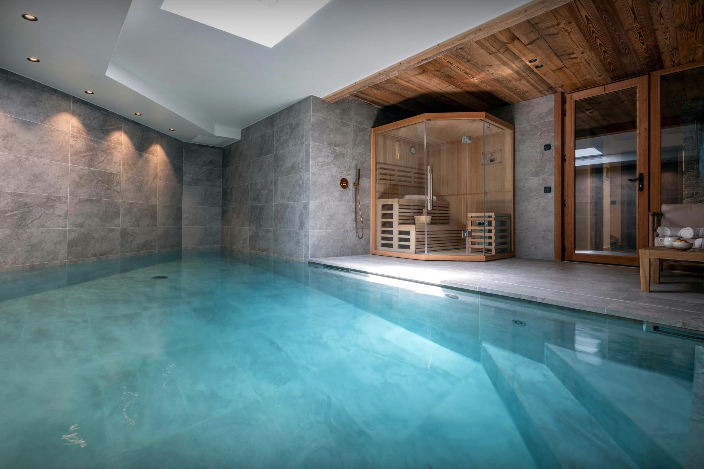 You'll find the luxurious pool, relaxation area and sauna on the lower ground floor, along with a laundry room and the ski room.
