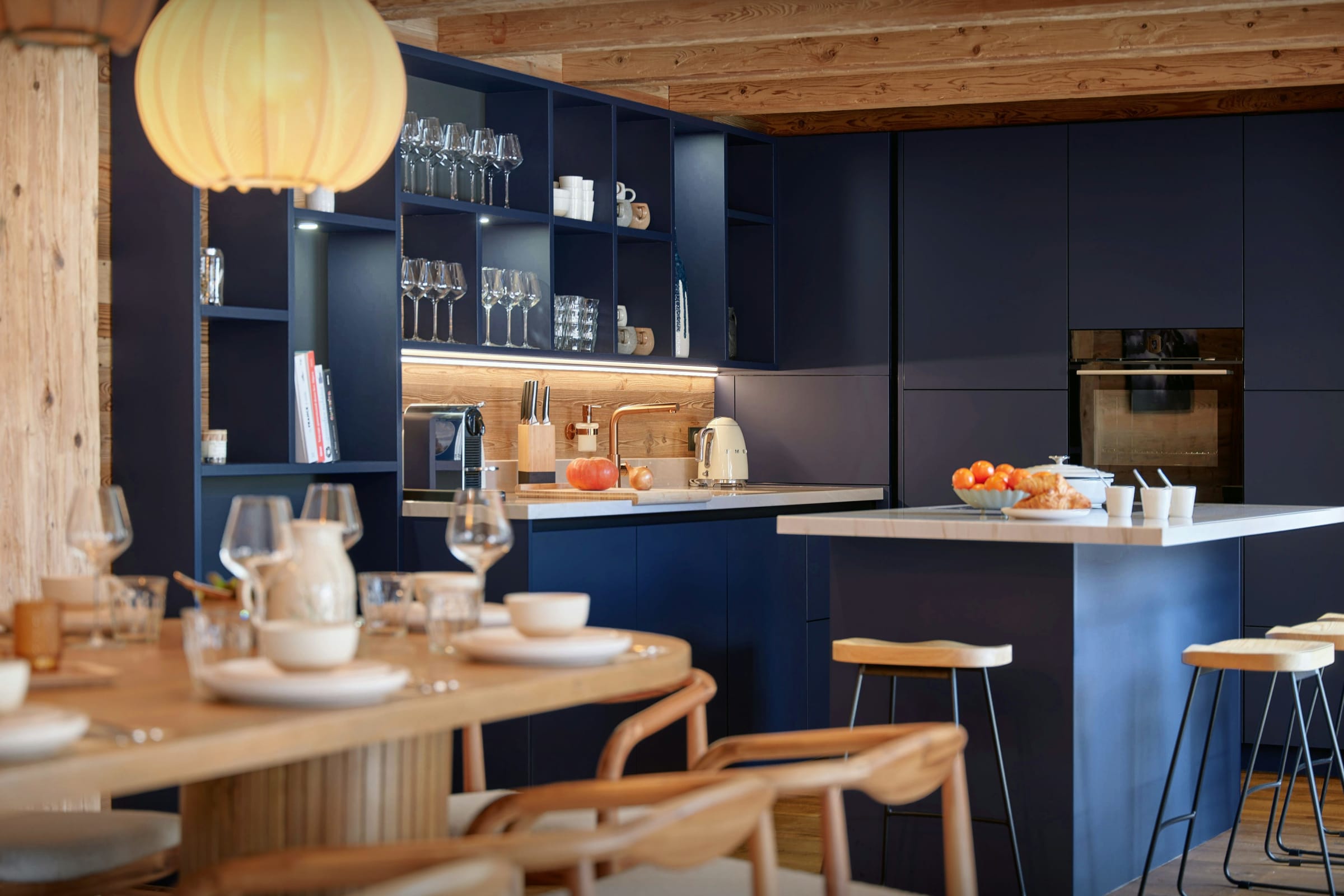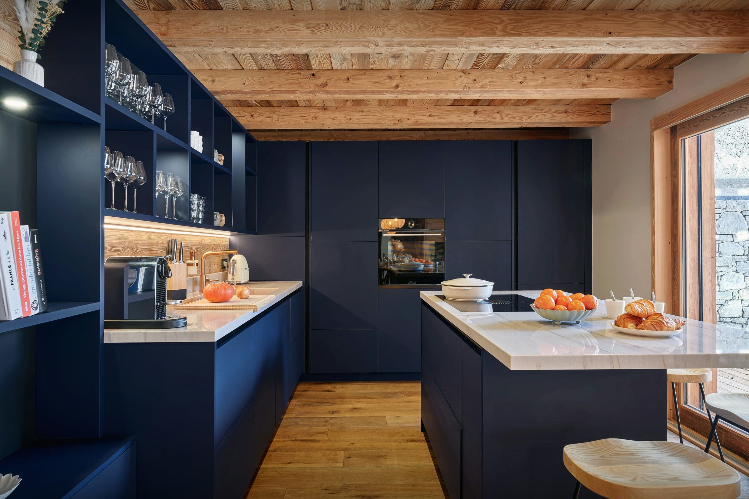 On the ground floor, you'll find a comfortable sitting area with cosy sofas and chairs around a four-sided fireplace. The sleek, modern kitchen has everything you need to cook for your group, and a central island with a breakfast bar. More formal meals can be taken at the large dining table or in good weather, out on the large, wraparound balcony.