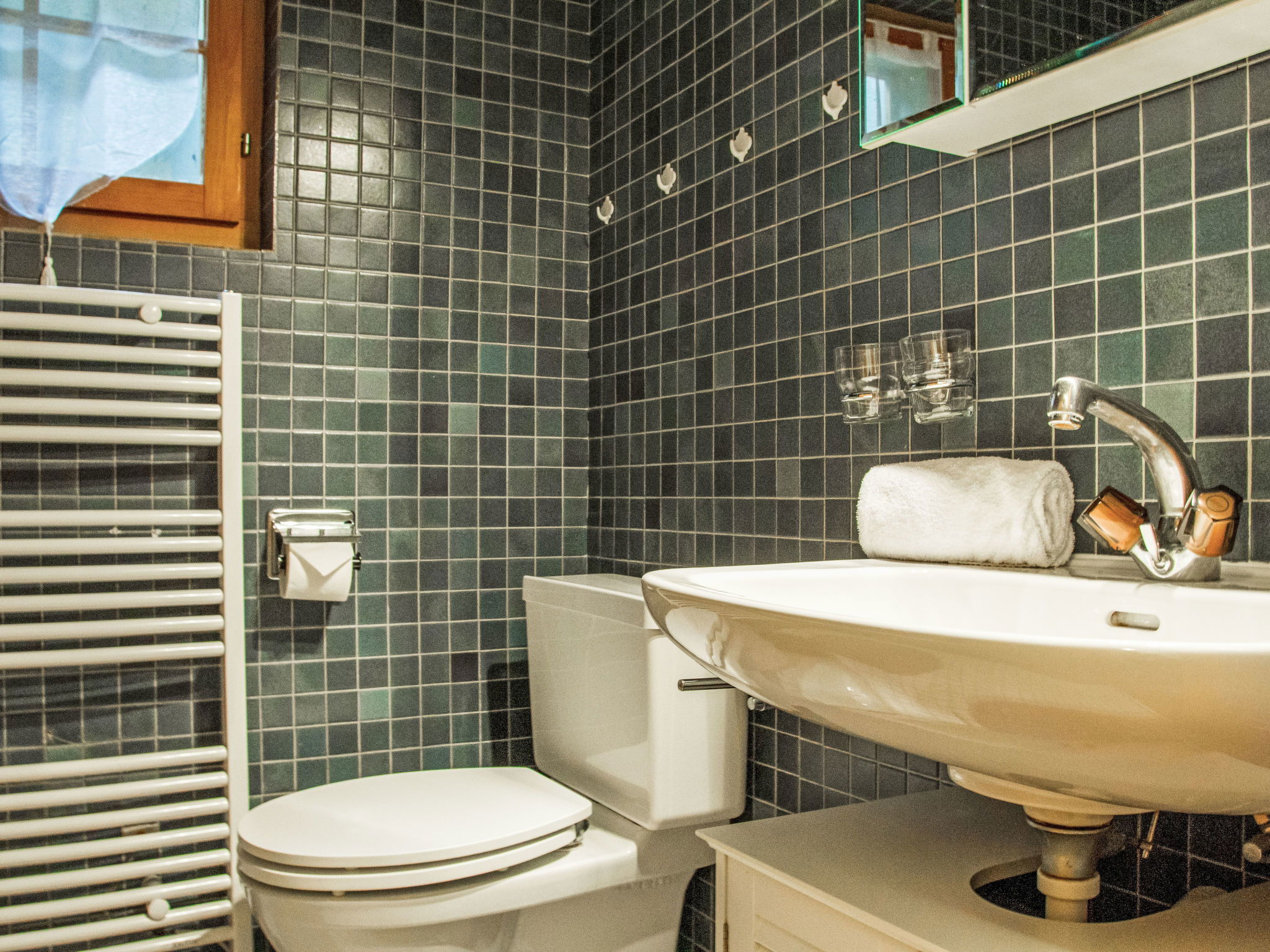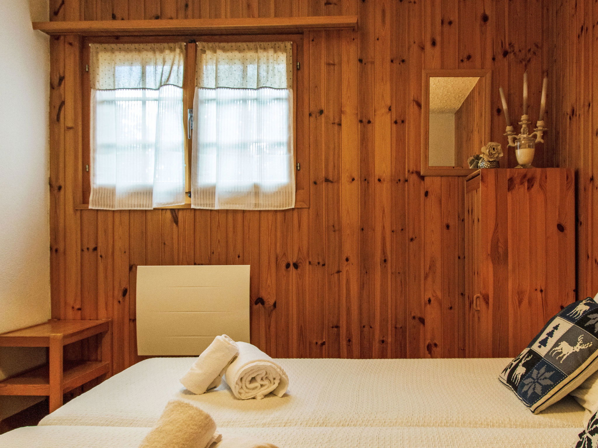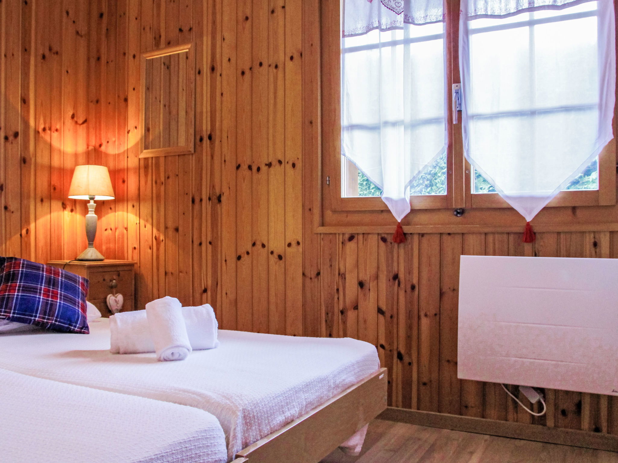 "La Couronne", 4-room chalet 92 m2 on 2 levels. Practical and beautiful furnishings: living/dining room with open-hearth fireplace, cable TV and DVD. Exit to the terrace, north facing position and west facing position. Open kitchen (oven, dishwasher, 4 ceramic glass hob hotplates, toaster, kettle, raclette grill, fondue Set (chinoise)). Shower/WC. Electric heating. On the lower ground floor: 1 room with 2 beds (90 cm, length 190 cm). 1 room with 1 double bed (180 cm, length 200 cm). 1 room with 2 beds (80 cm, length 190 cm). Bath/WC. Balcony, north facing position, terrace, north facing position and west facing position, garden, south facing position. Terrace furniture, barbecue. Beautiful view of the mountains. Facilities: children's high chair, baby cot. Internet (WiFi). Parking (3 cars). Please note: non-smokers only. Maximum 1 pet/ dog allowed.