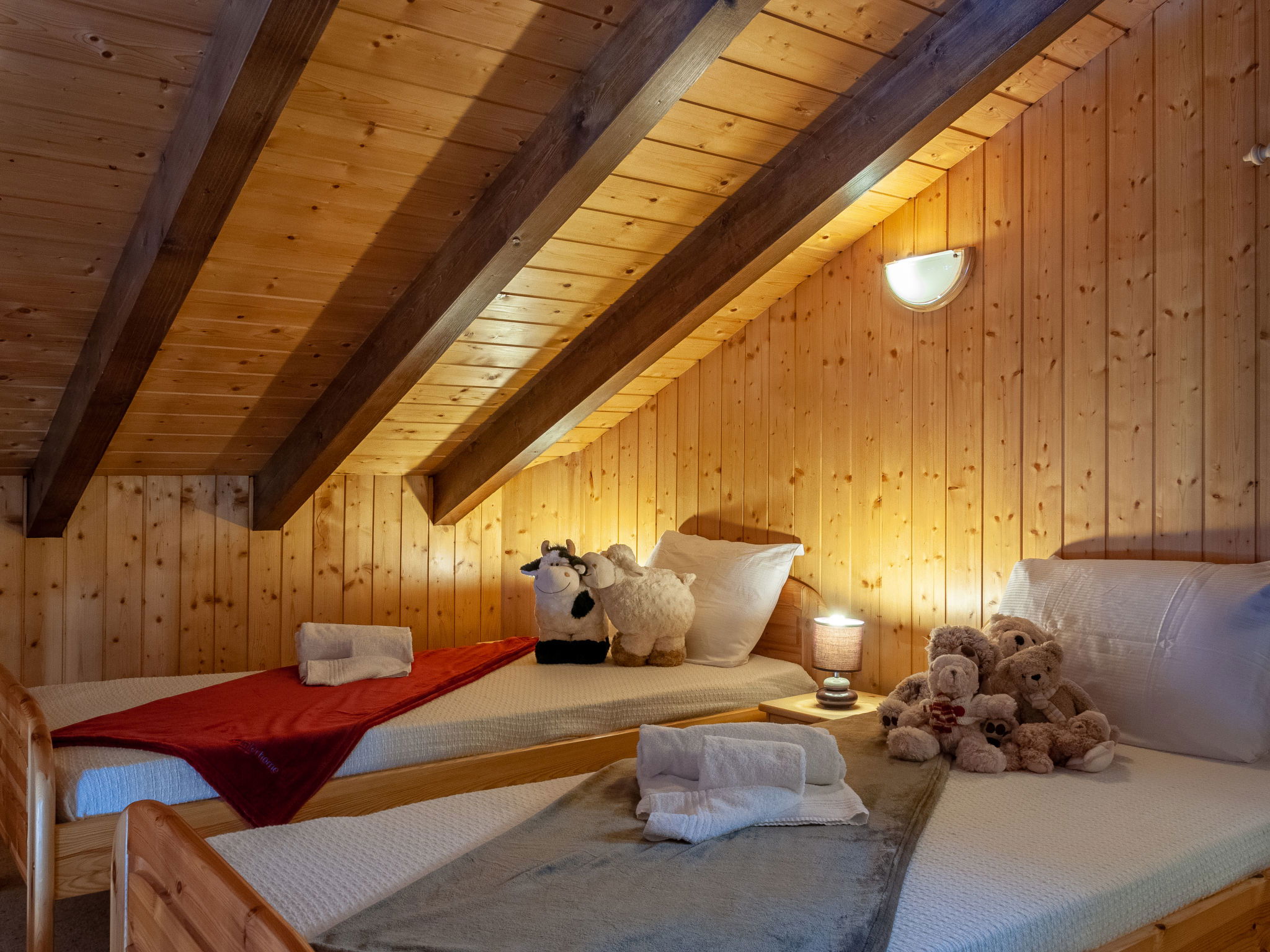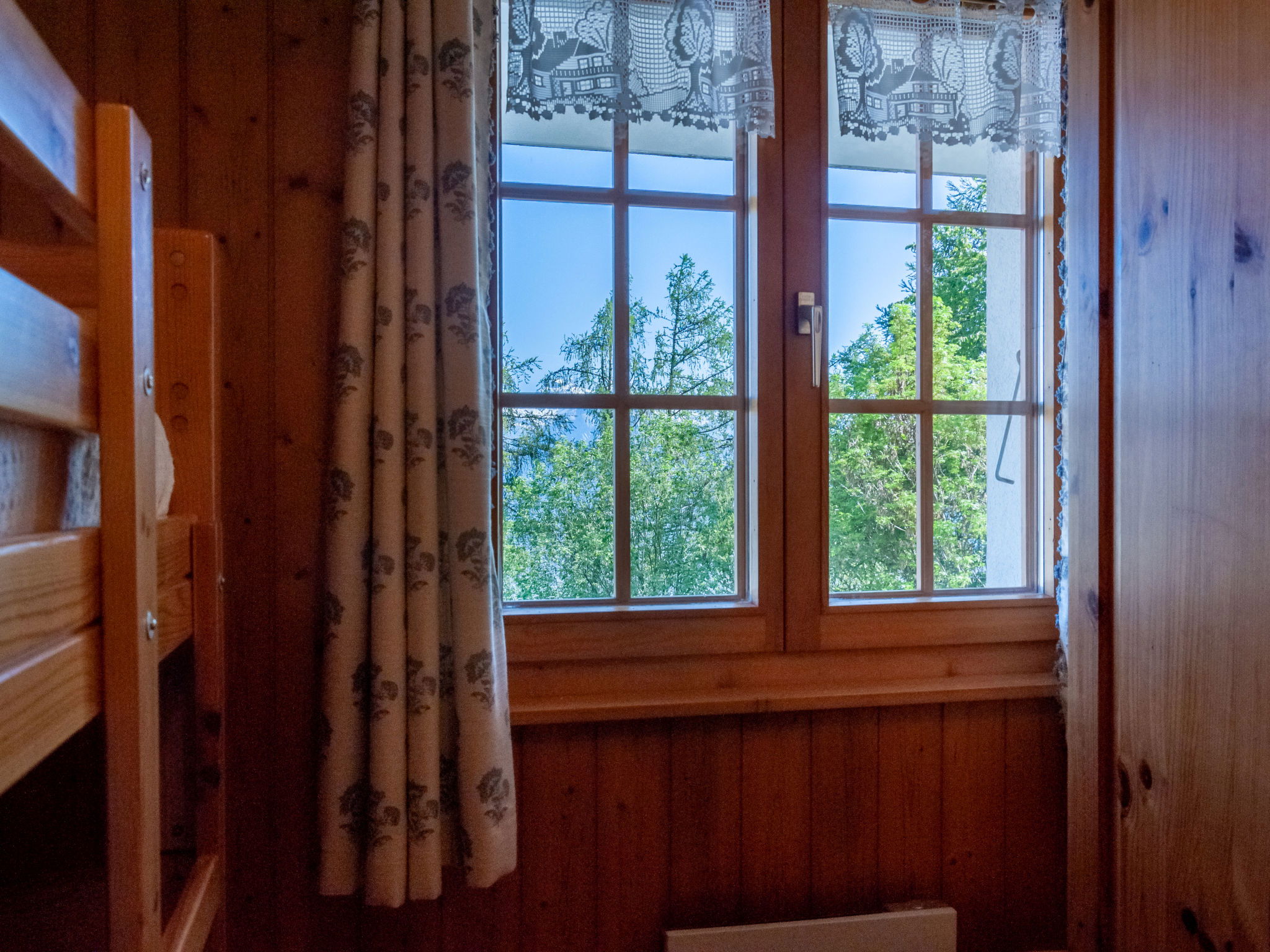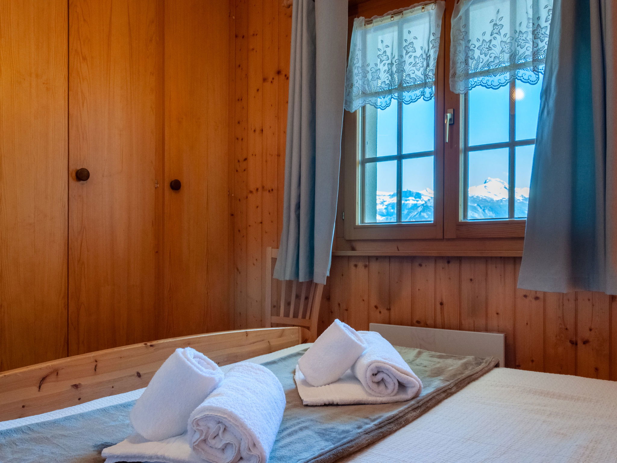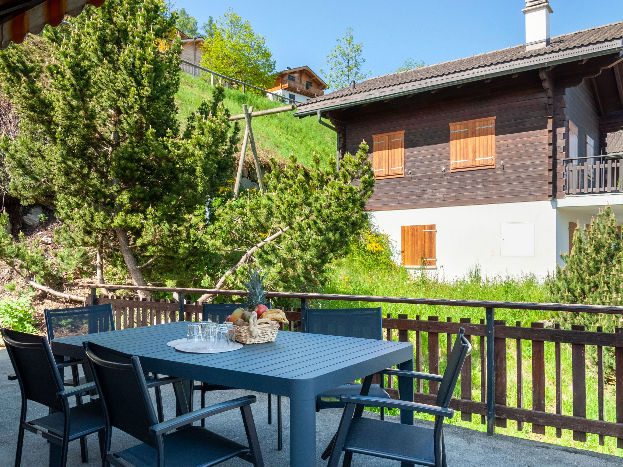 "Anusach", 3-room chalet 80 m2 on 2 levels. Partly renovated in 2022, comfortable and wooden furniture furnishings: small entrance hall. Living/dining room with Scandinavian wood stove and cable TV. Exit to the terrace, north facing position and west facing position. Open kitchen (oven, dishwasher, 4 ceramic glass hob hotplates, toaster, kettle, microwave, electric coffee machine, raclette grill, fondue Set (cheese)). Shower/WC. Electric heating. On the lower ground floor: 1 room with 1 french bed (1 x 160 cm, length 200 cm). 1 room with 1 x 2 bunk beds (90 cm, length 190 cm). Bath/WC. Upper floor: (steep stair) open gallery with sloping ceilings with 2 beds (90 cm, length 190 cm). Terrace, north facing position. Very beautiful view of the mountains and the valley. Facilities: washing machine, hair dryer. Internet (WiFi, free). Garage (1 car), height 200 cm, width 225 cm. Please note: non-smokers only. 1 small pet/ dog allowed. Instead of an enclosed bedroom, some sleeping areas are located in an open-plan area (gallery, alcove, etc.).