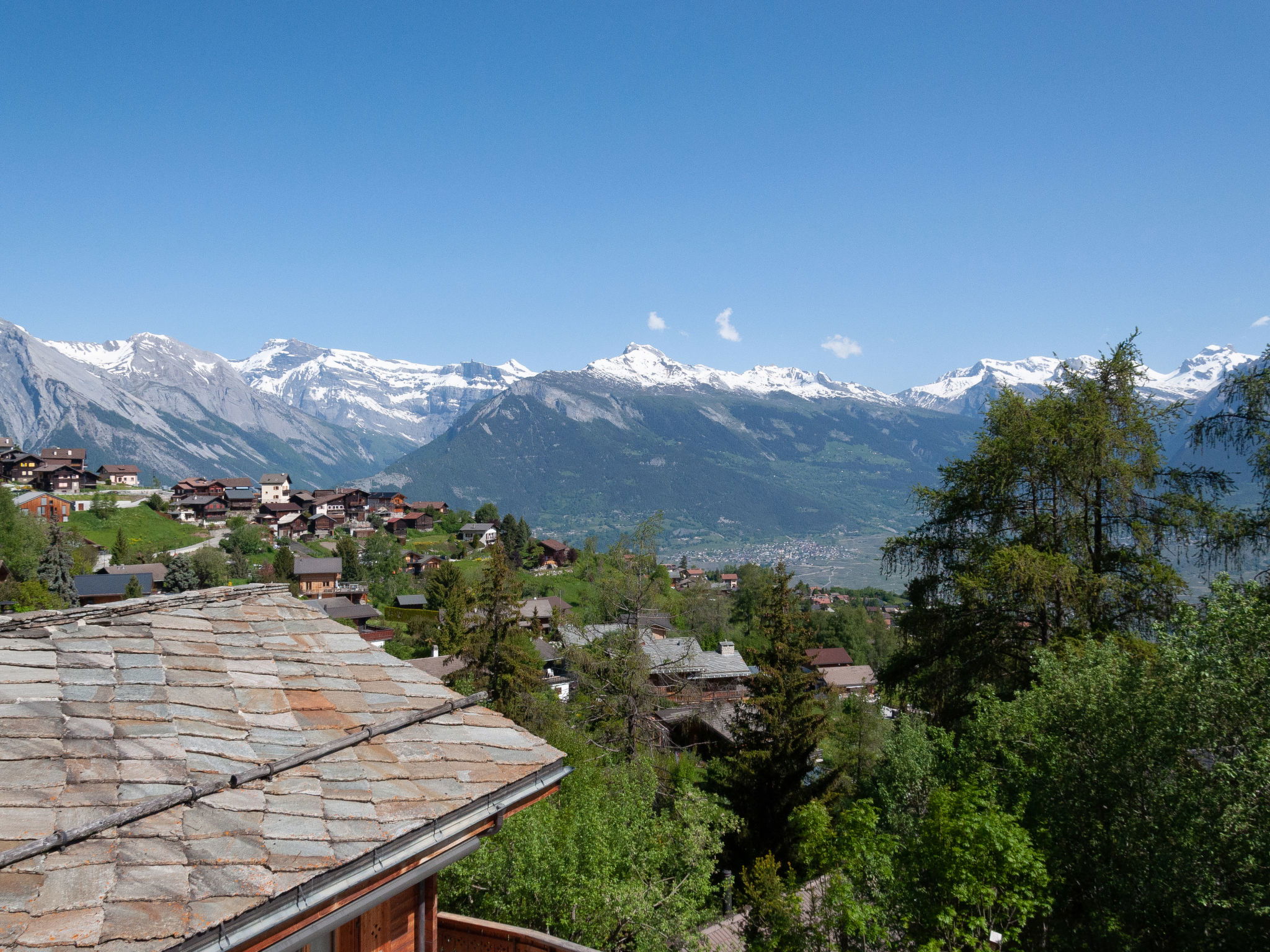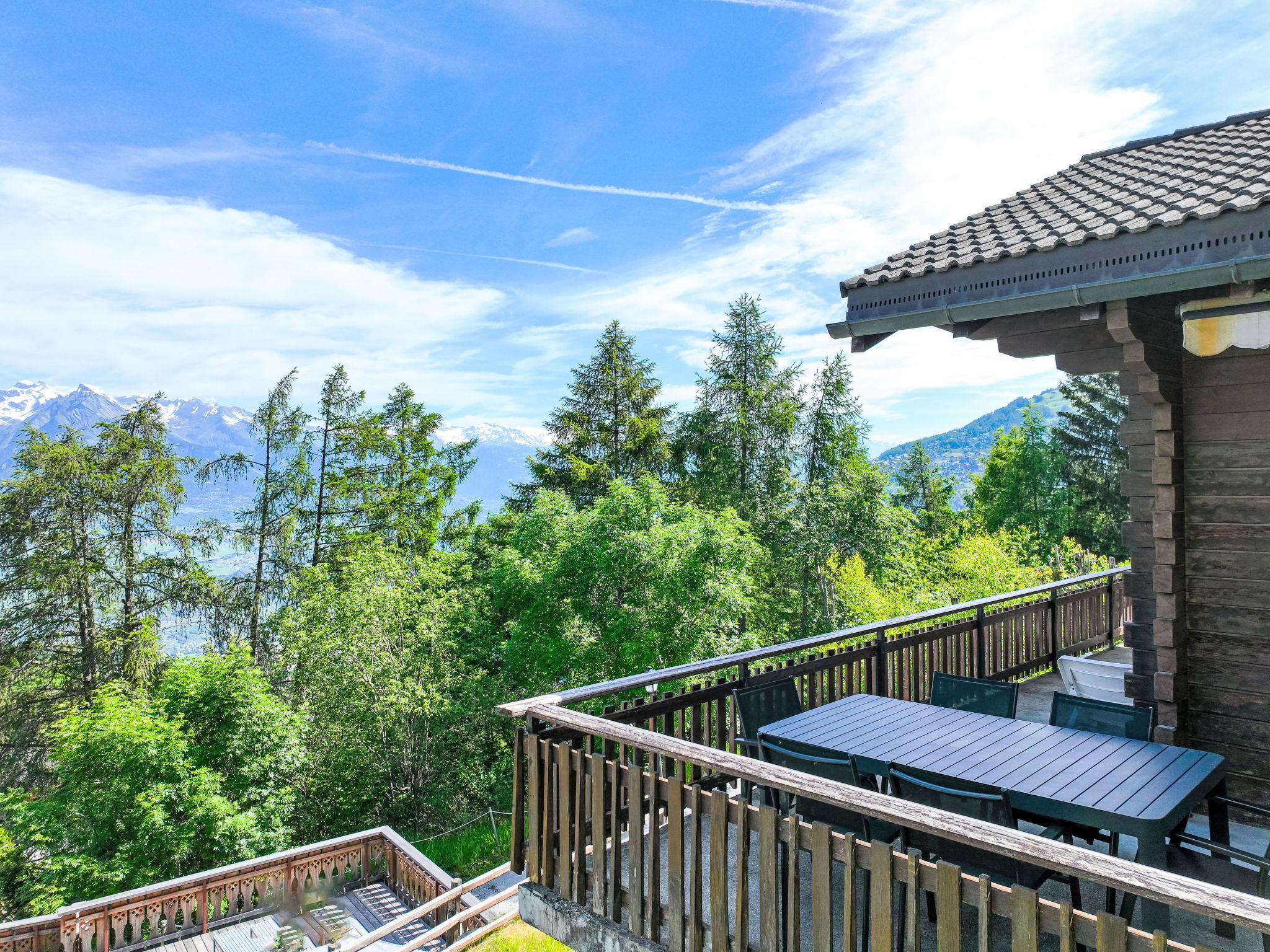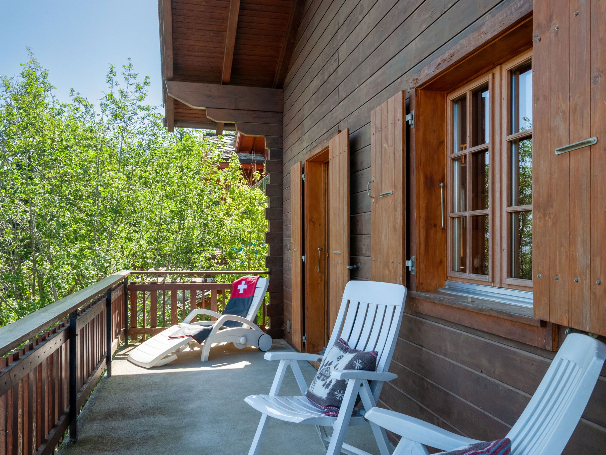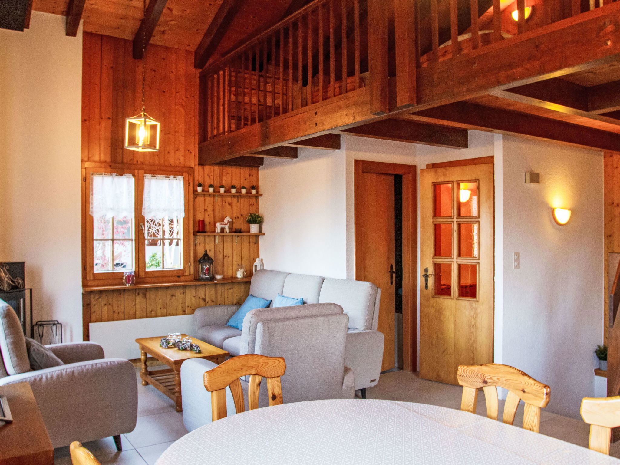 "Anusach", 3-room chalet 80 m2 on 2 levels. Partly renovated in 2022, comfortable and wooden furniture furnishings: small entrance hall. Living/dining room with Scandinavian wood stove and cable TV. Exit to the terrace, north facing position and west facing position. Open kitchen (oven, dishwasher, 4 ceramic glass hob hotplates, toaster, kettle, microwave, electric coffee machine, raclette grill, fondue Set (cheese)). Shower/WC. Electric heating. On the lower ground floor: 1 room with 1 french bed (1 x 160 cm, length 200 cm). 1 room with 1 x 2 bunk beds (90 cm, length 190 cm). Bath/WC. Upper floor: (steep stair) open gallery with sloping ceilings with 2 beds (90 cm, length 190 cm). Terrace, north facing position. Very beautiful view of the mountains and the valley. Facilities: washing machine, hair dryer. Internet (WiFi, free). Garage (1 car), height 200 cm, width 225 cm. Please note: non-smokers only. 1 small pet/ dog allowed. Instead of an enclosed bedroom, some sleeping areas are located in an open-plan area (gallery, alcove, etc.).