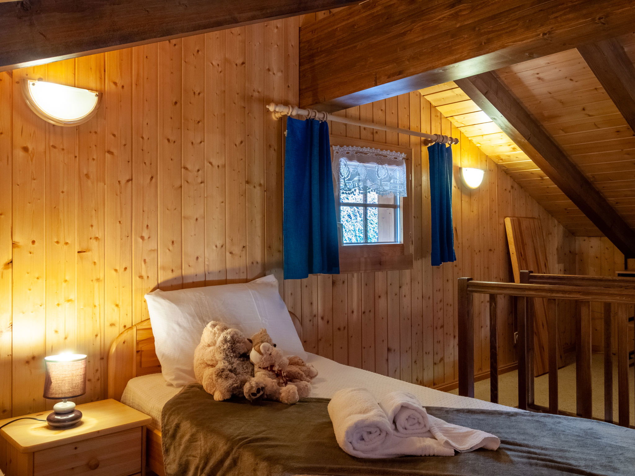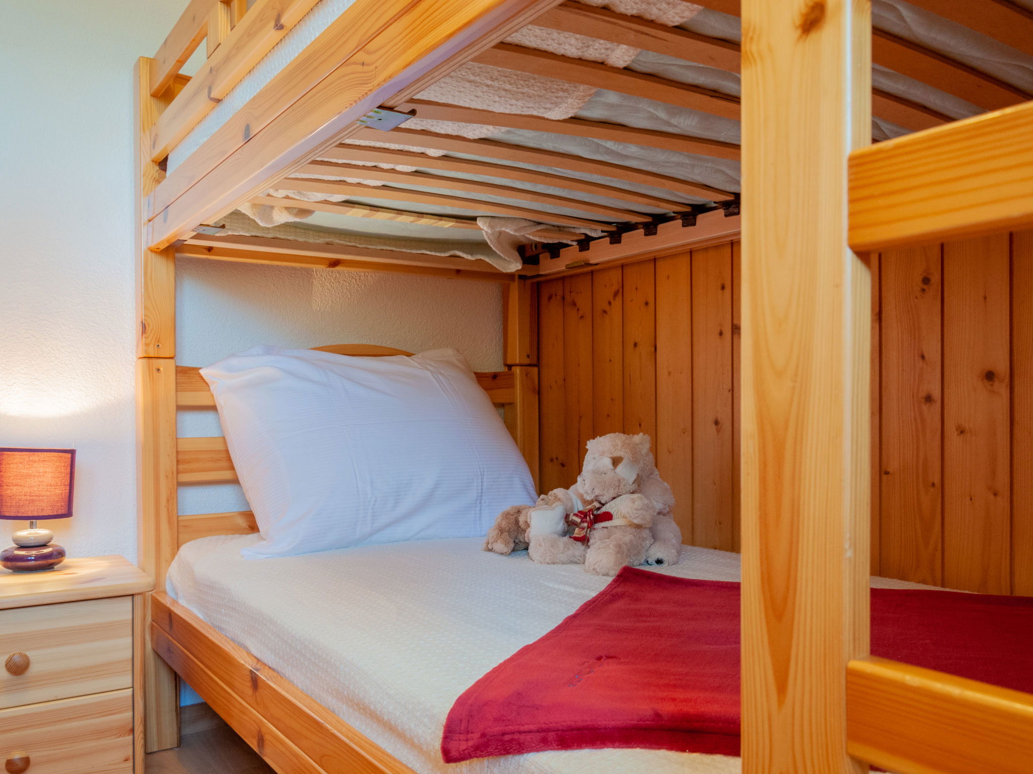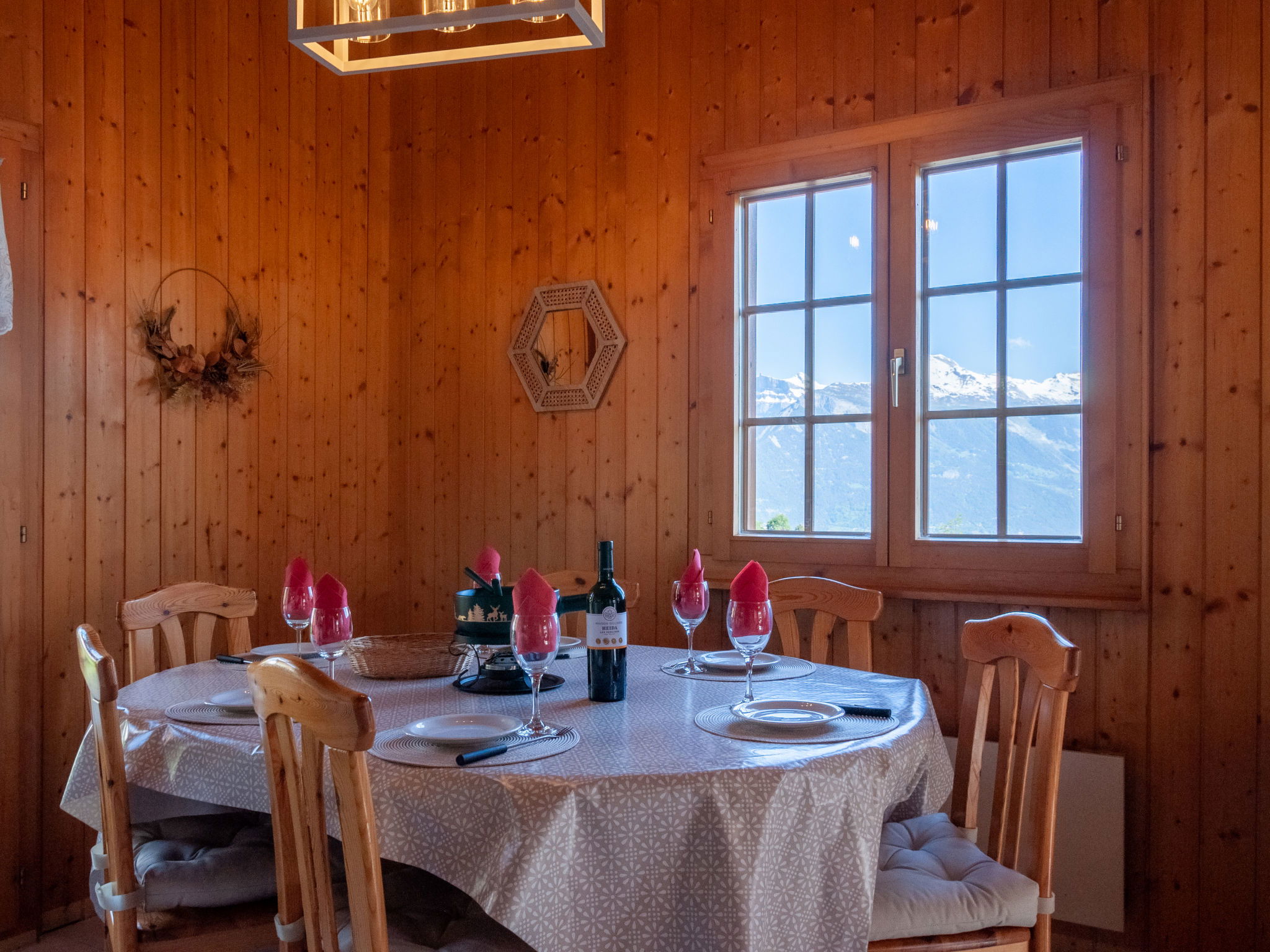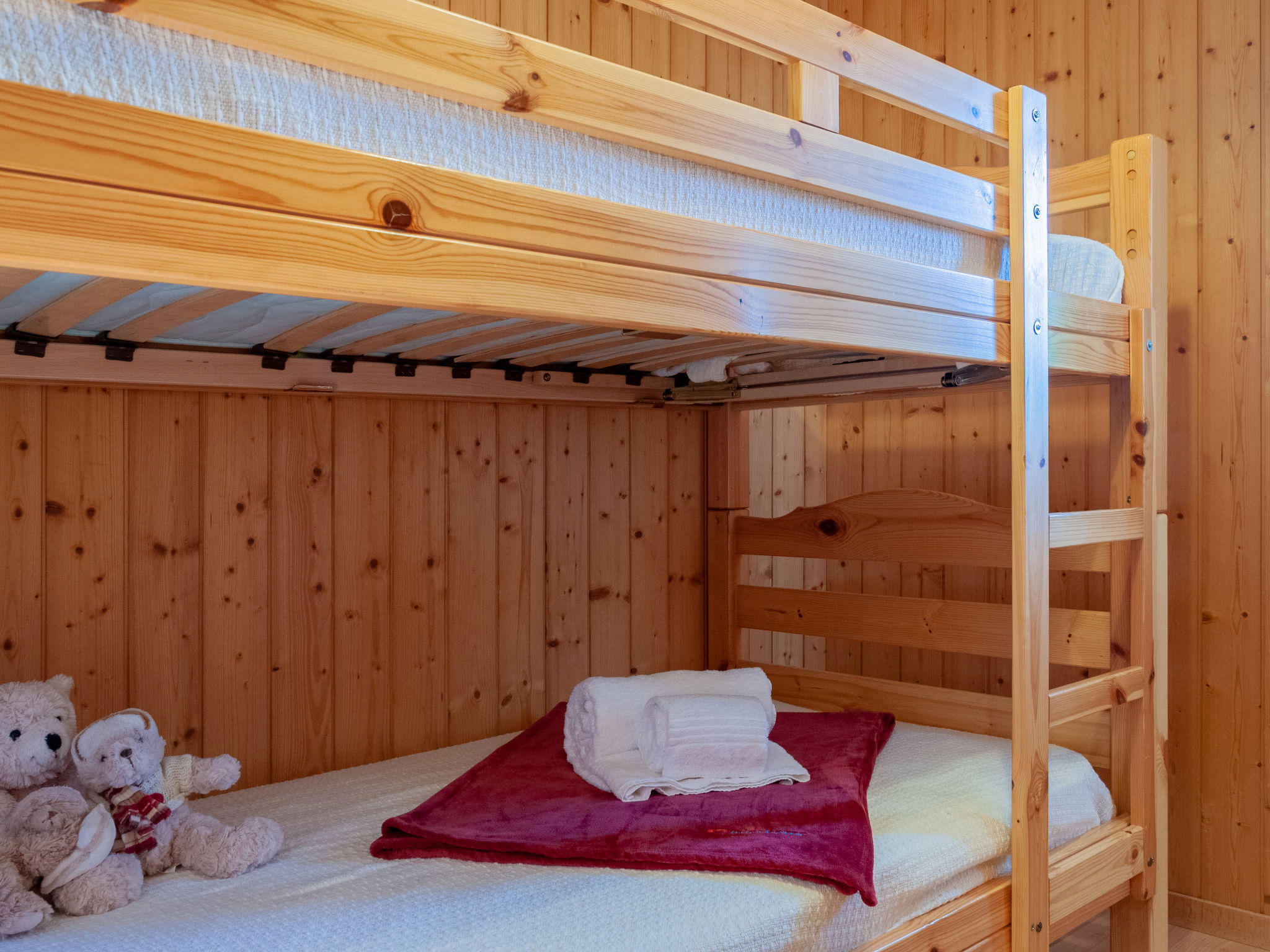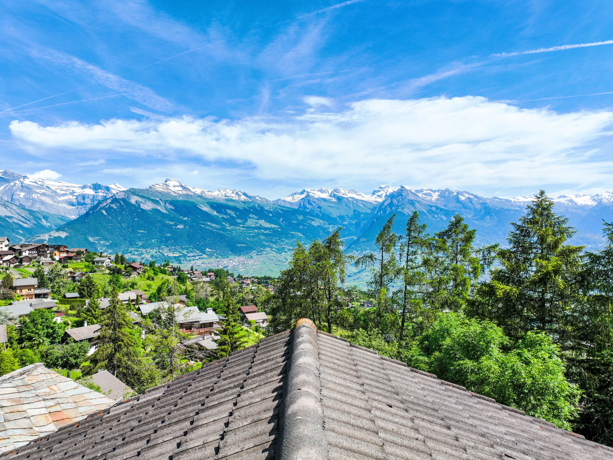 "Anusach", 3-room chalet 80 m2 on 2 levels. Partly renovated in 2022, comfortable and wooden furniture furnishings: small entrance hall. Living/dining room with Scandinavian wood stove and cable TV. Exit to the terrace, north facing position and west facing position. Open kitchen (oven, dishwasher, 4 ceramic glass hob hotplates, toaster, kettle, microwave, electric coffee machine, raclette grill, fondue Set (cheese)). Shower/WC. Electric heating. On the lower ground floor: 1 room with 1 french bed (1 x 160 cm, length 200 cm). 1 room with 1 x 2 bunk beds (90 cm, length 190 cm). Bath/WC. Upper floor: (steep stair) open gallery with sloping ceilings with 2 beds (90 cm, length 190 cm). Terrace, north facing position. Very beautiful view of the mountains and the valley. Facilities: washing machine, hair dryer. Internet (WiFi, free). Garage (1 car), height 200 cm, width 225 cm. Please note: non-smokers only. 1 small pet/ dog allowed. Instead of an enclosed bedroom, some sleeping areas are located in an open-plan area (gallery, alcove, etc.).