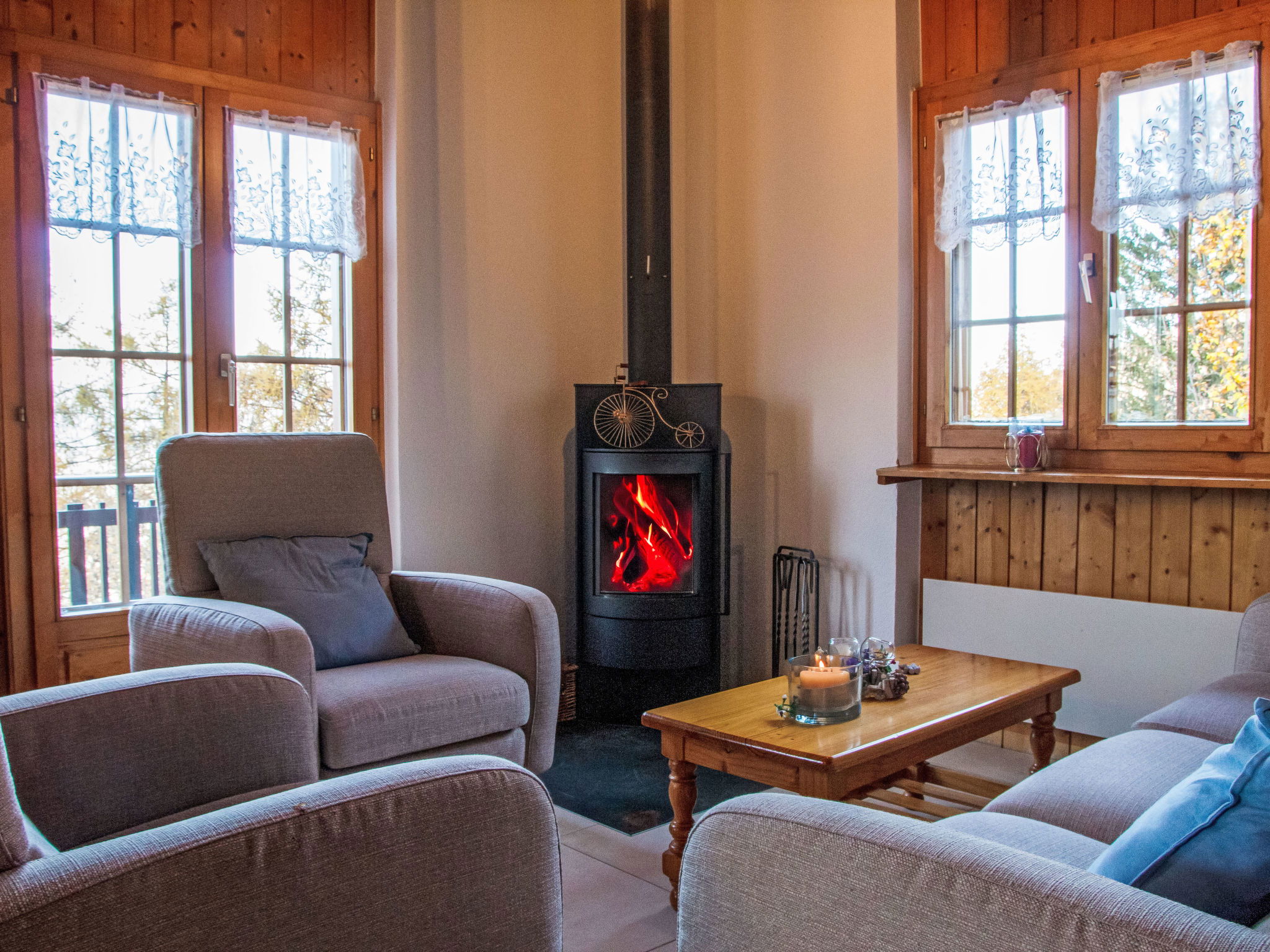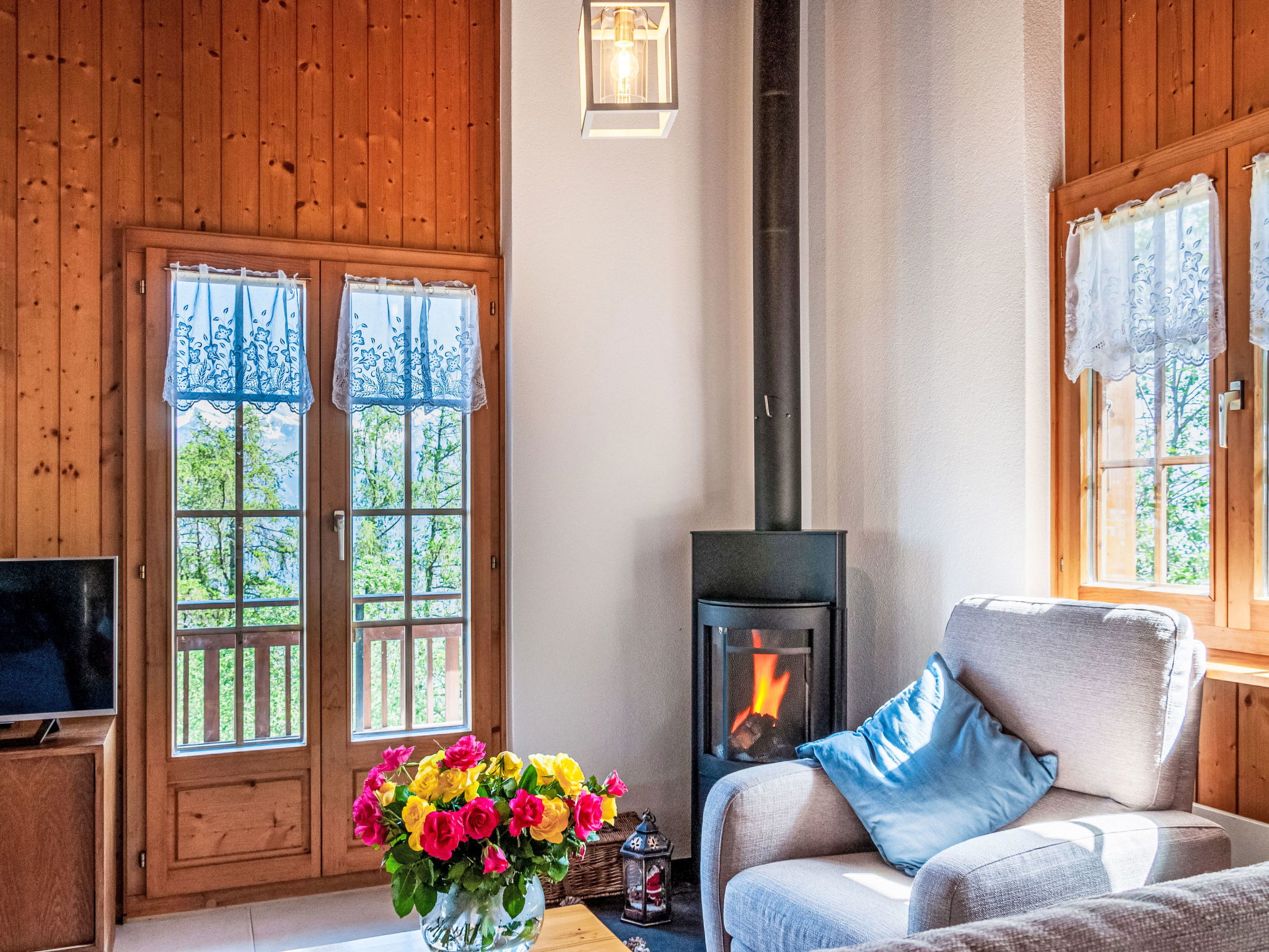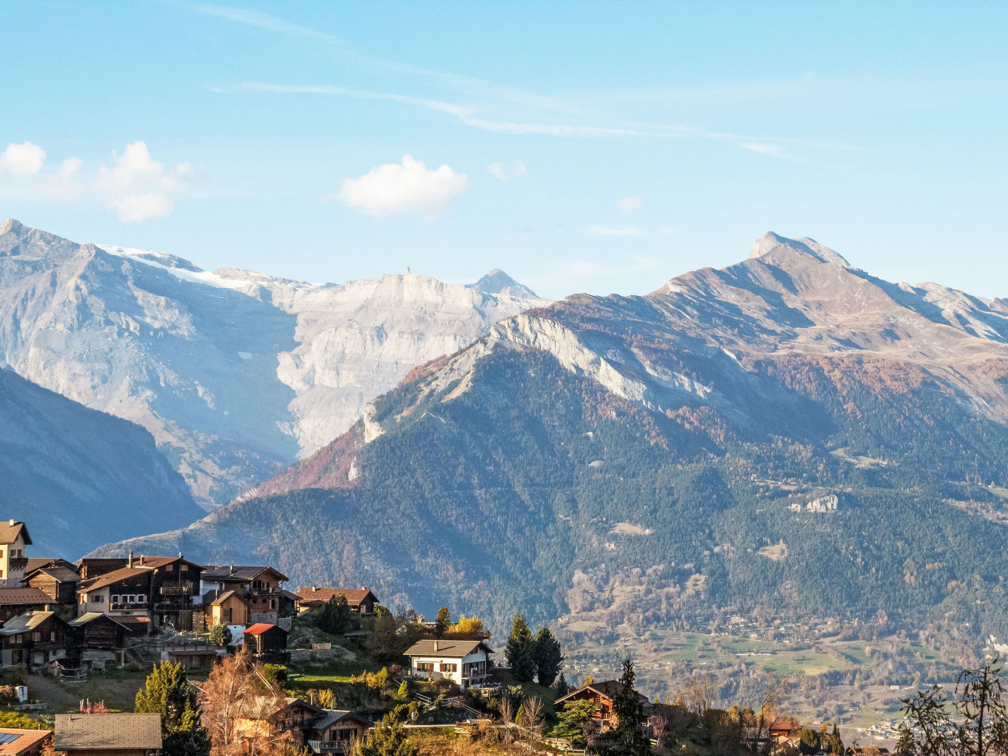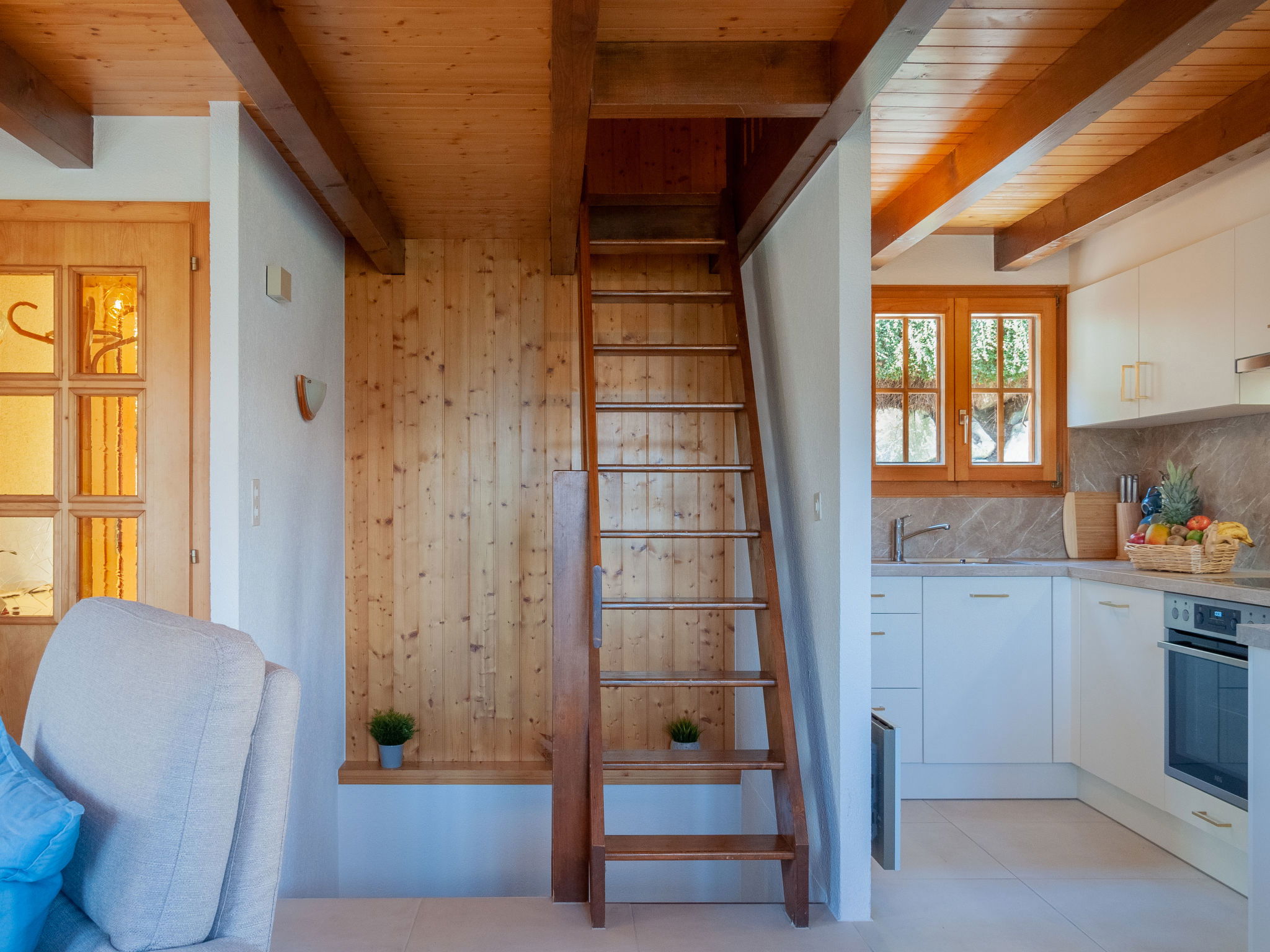 "Anusach", 3-room chalet 80 m2 on 2 levels. Partly renovated in 2022, comfortable and wooden furniture furnishings: small entrance hall. Living/dining room with Scandinavian wood stove and cable TV. Exit to the terrace, north facing position and west facing position. Open kitchen (oven, dishwasher, 4 ceramic glass hob hotplates, toaster, kettle, microwave, electric coffee machine, raclette grill, fondue Set (cheese)). Shower/WC. Electric heating. On the lower ground floor: 1 room with 1 french bed (1 x 160 cm, length 200 cm). 1 room with 1 x 2 bunk beds (90 cm, length 190 cm). Bath/WC. Upper floor: (steep stair) open gallery with sloping ceilings with 2 beds (90 cm, length 190 cm). Terrace, north facing position. Very beautiful view of the mountains and the valley. Facilities: washing machine, hair dryer. Internet (WiFi, free). Garage (1 car), height 200 cm, width 225 cm. Please note: non-smokers only. 1 small pet/ dog allowed. Instead of an enclosed bedroom, some sleeping areas are located in an open-plan area (gallery, alcove, etc.).