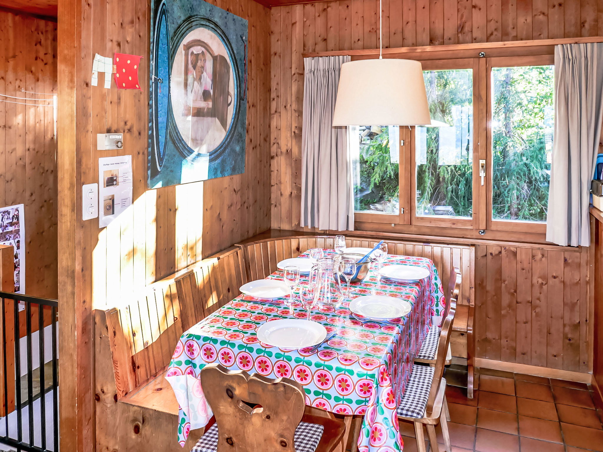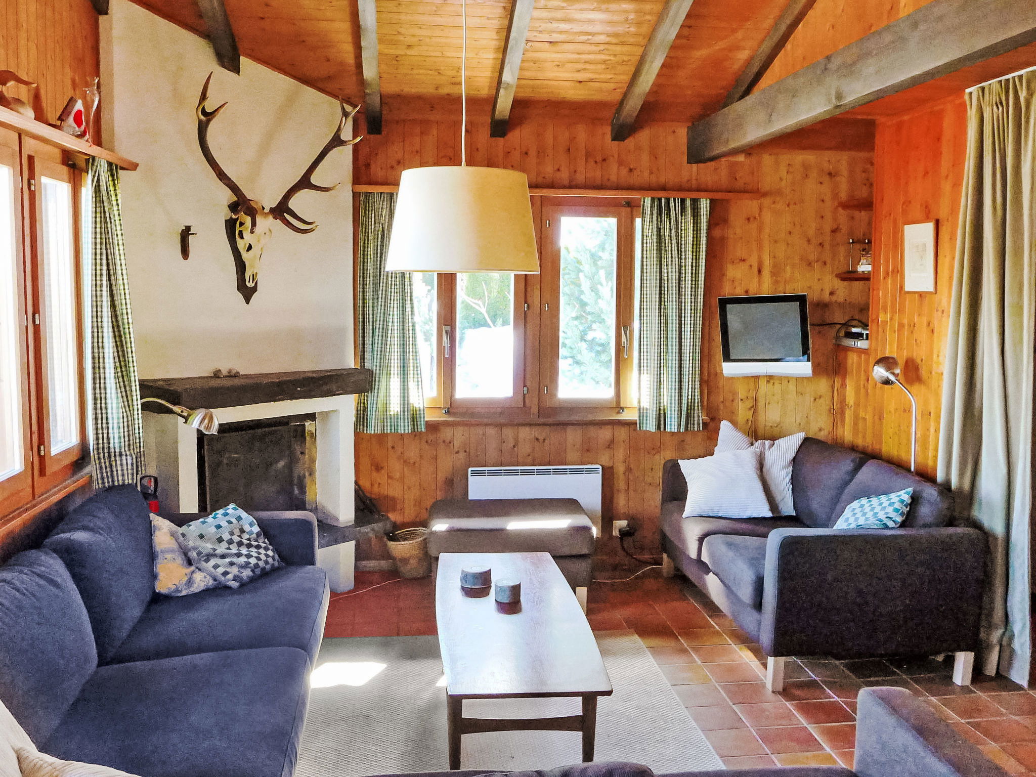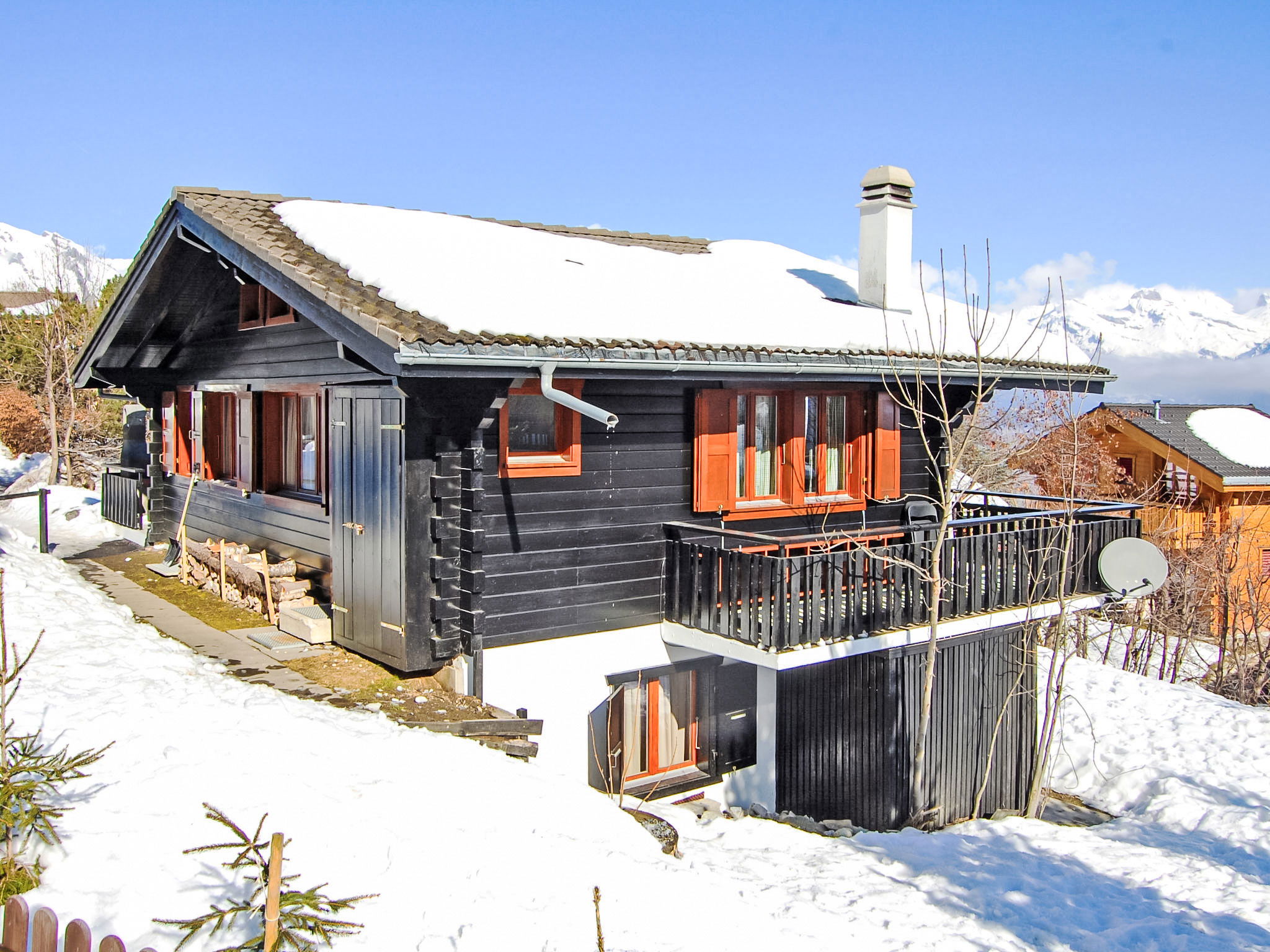 "Sven Heul", 5-room chalet 105 m2 on 2 levels. Partly renovated in 2015, comfortable furnishings: large living/dining room with open-hearth fireplace, cable TV, radio and DVD. Exit to the balcony, north-east facing position. Open kitchen (dishwasher, 4 induction hot plates, toaster, kettle, microwave, electric coffee machine, Capsules for coffee machine (Nespresso) extra, raclette grill, fondue Set (chinoise, cheese)). Exit to the terrace. Sep. WC. Electric heating. On the lower ground floor: 2 rooms, each room with 1 double bed (2 x 90 cm, length 200 cm). 1 room with 1 x 2 bunk beds (90 cm, length 190 cm). 1 room with 1 double bed (90 cm, length 190 cm), hand-basin. Bath/WC, shower, sep. WC. Terrace 24 m2, north-west facing position. Balcony furniture, barbecue. View of the valley. Facilities: washing machine, baby cot, hair dryer. Internet (WiFi, free). Parking (3 cars). Please note: non-smokers only. Maximum 1 pet/ dog allowed.