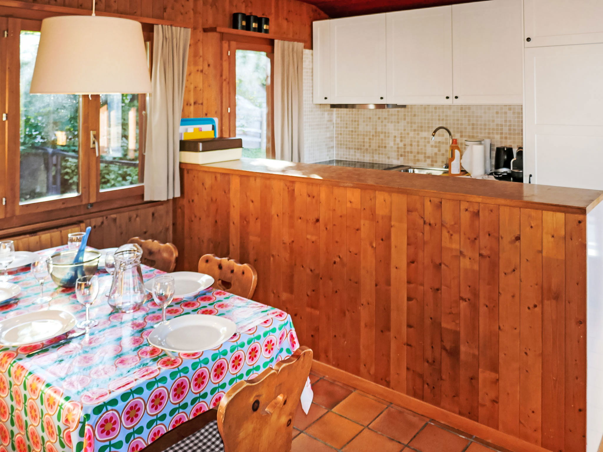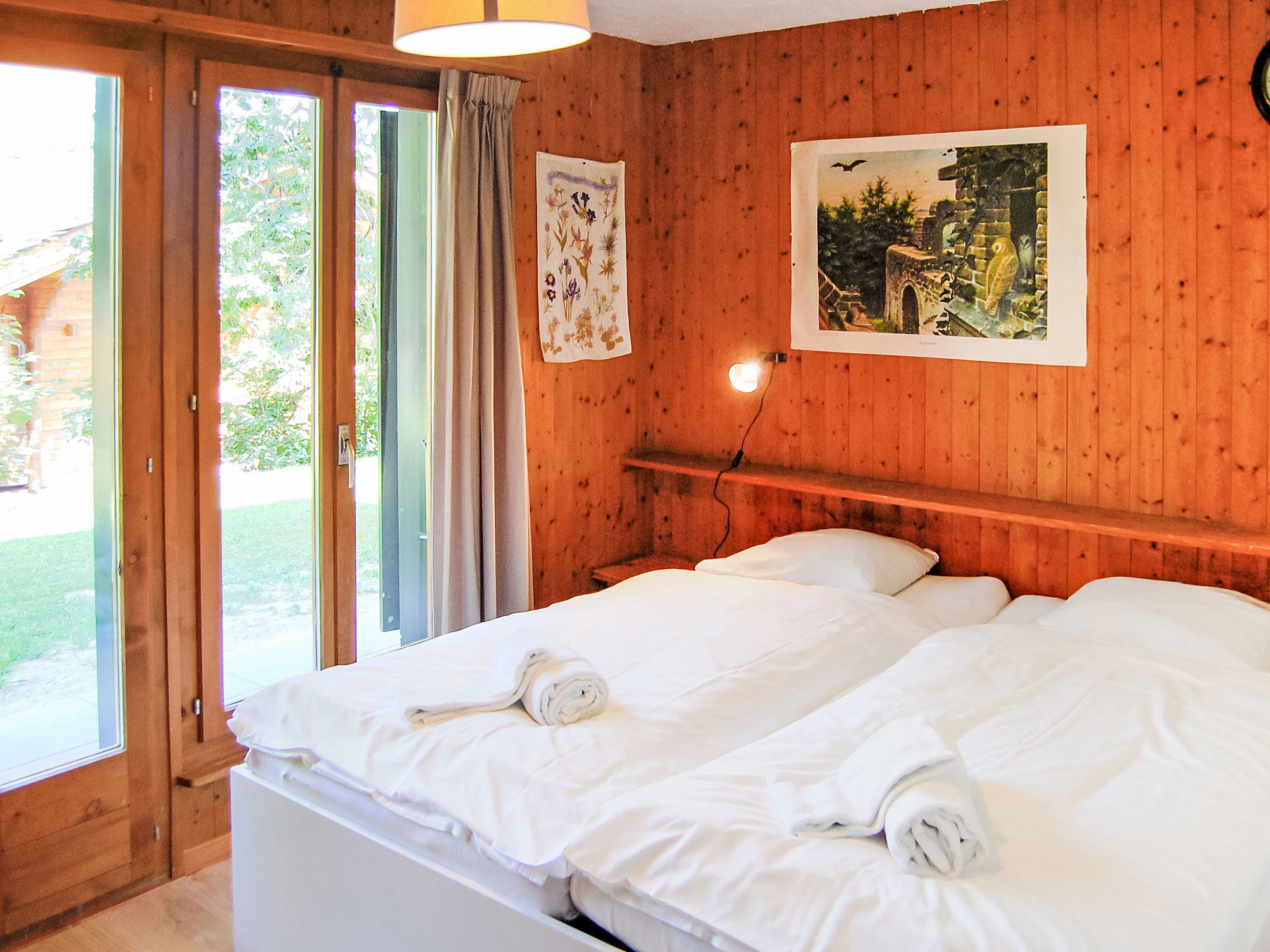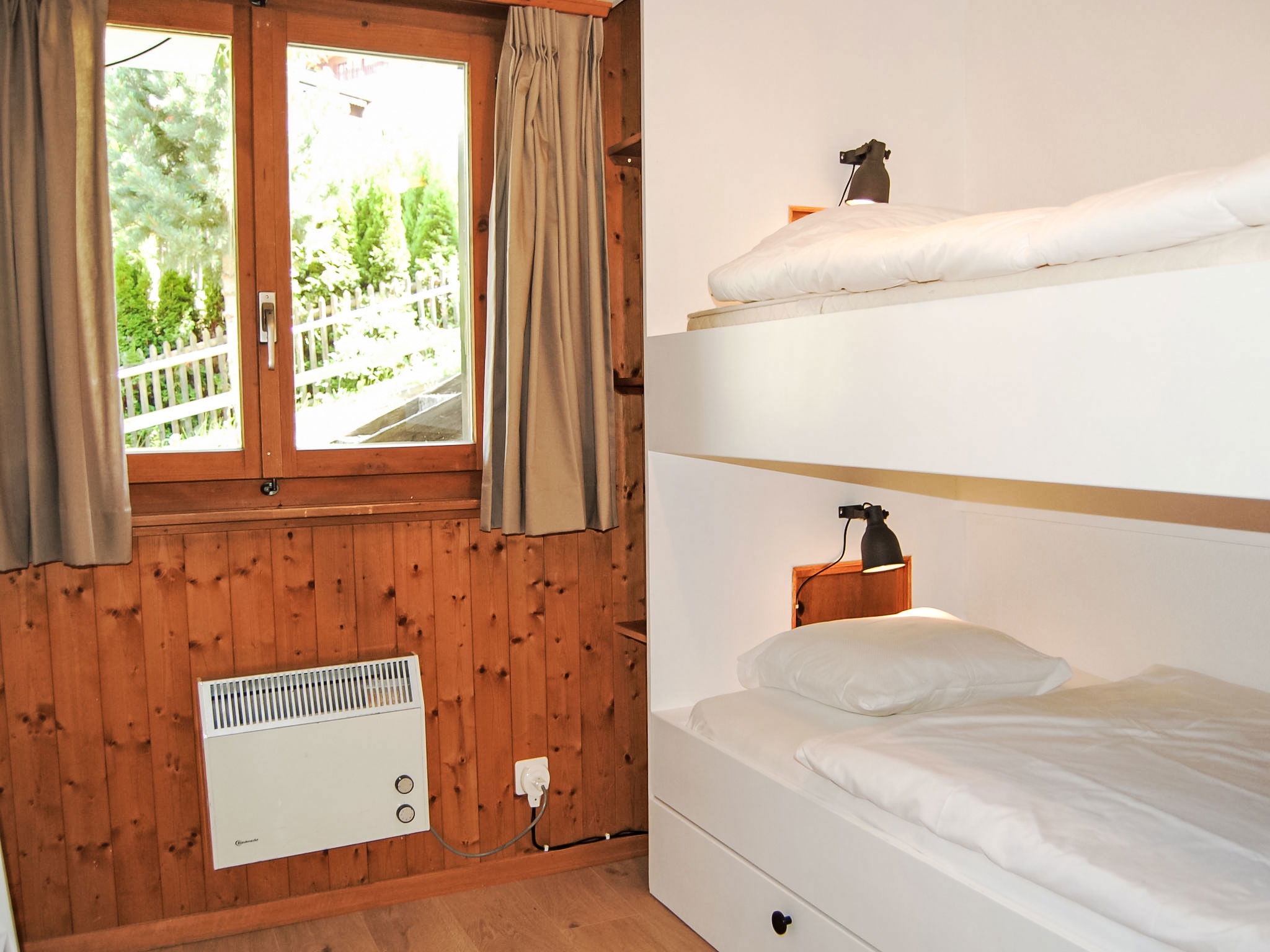 "Sven Heul", 5-room chalet 105 m2 on 2 levels. Partly renovated in 2015, comfortable furnishings: large living/dining room with open-hearth fireplace, cable TV, radio and DVD. Exit to the balcony, north-east facing position. Open kitchen (dishwasher, 4 induction hot plates, toaster, kettle, microwave, electric coffee machine, Capsules for coffee machine (Nespresso) extra, raclette grill, fondue Set (chinoise, cheese)). Exit to the terrace. Sep. WC. Electric heating. On the lower ground floor: 2 rooms, each room with 1 double bed (2 x 90 cm, length 200 cm). 1 room with 1 x 2 bunk beds (90 cm, length 190 cm). 1 room with 1 double bed (90 cm, length 190 cm), hand-basin. Bath/WC, shower, sep. WC. Terrace 24 m2, north-west facing position. Balcony furniture, barbecue. View of the valley. Facilities: washing machine, baby cot, hair dryer. Internet (WiFi, free). Parking (3 cars). Please note: non-smokers only. Maximum 1 pet/ dog allowed.