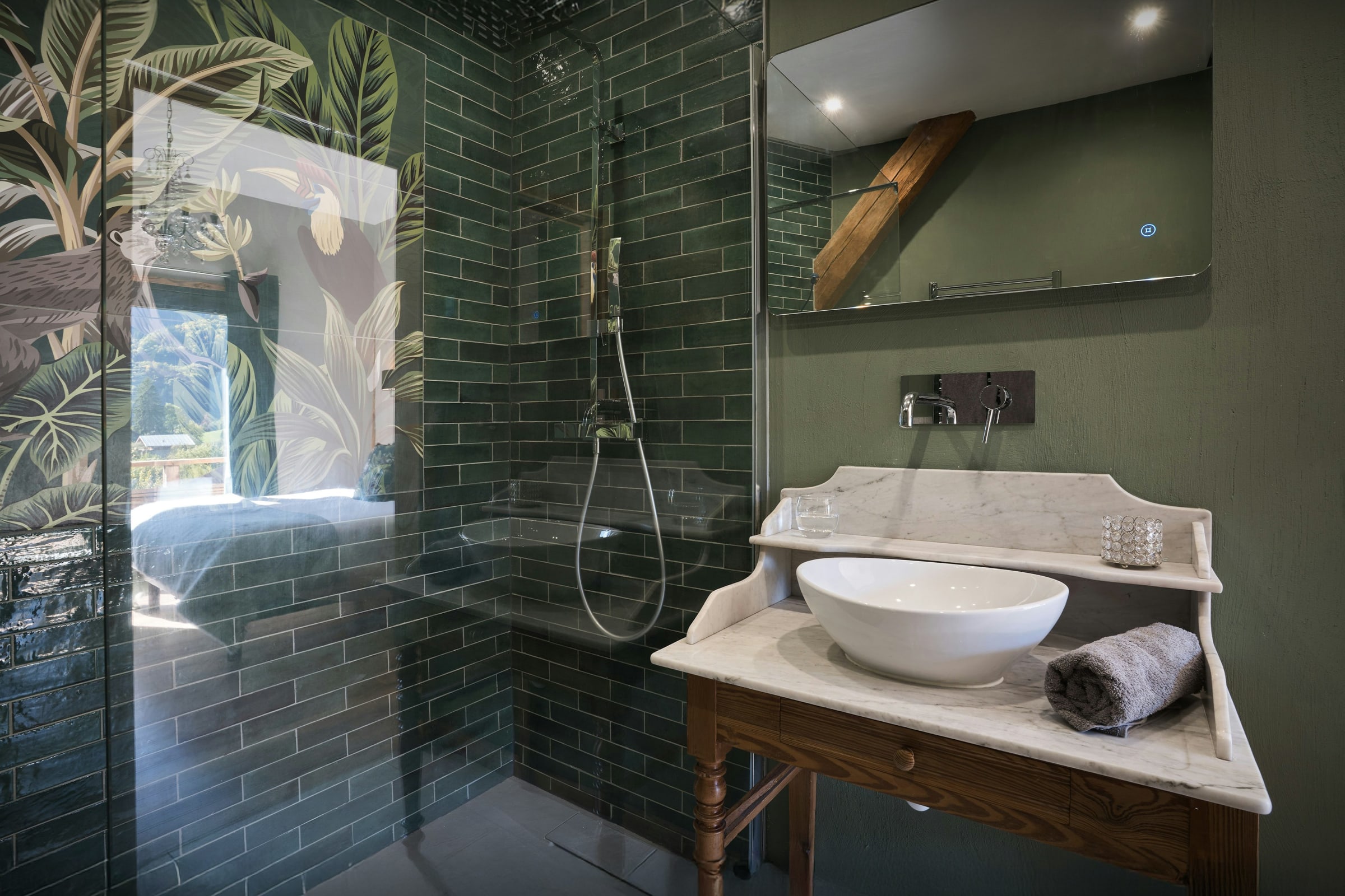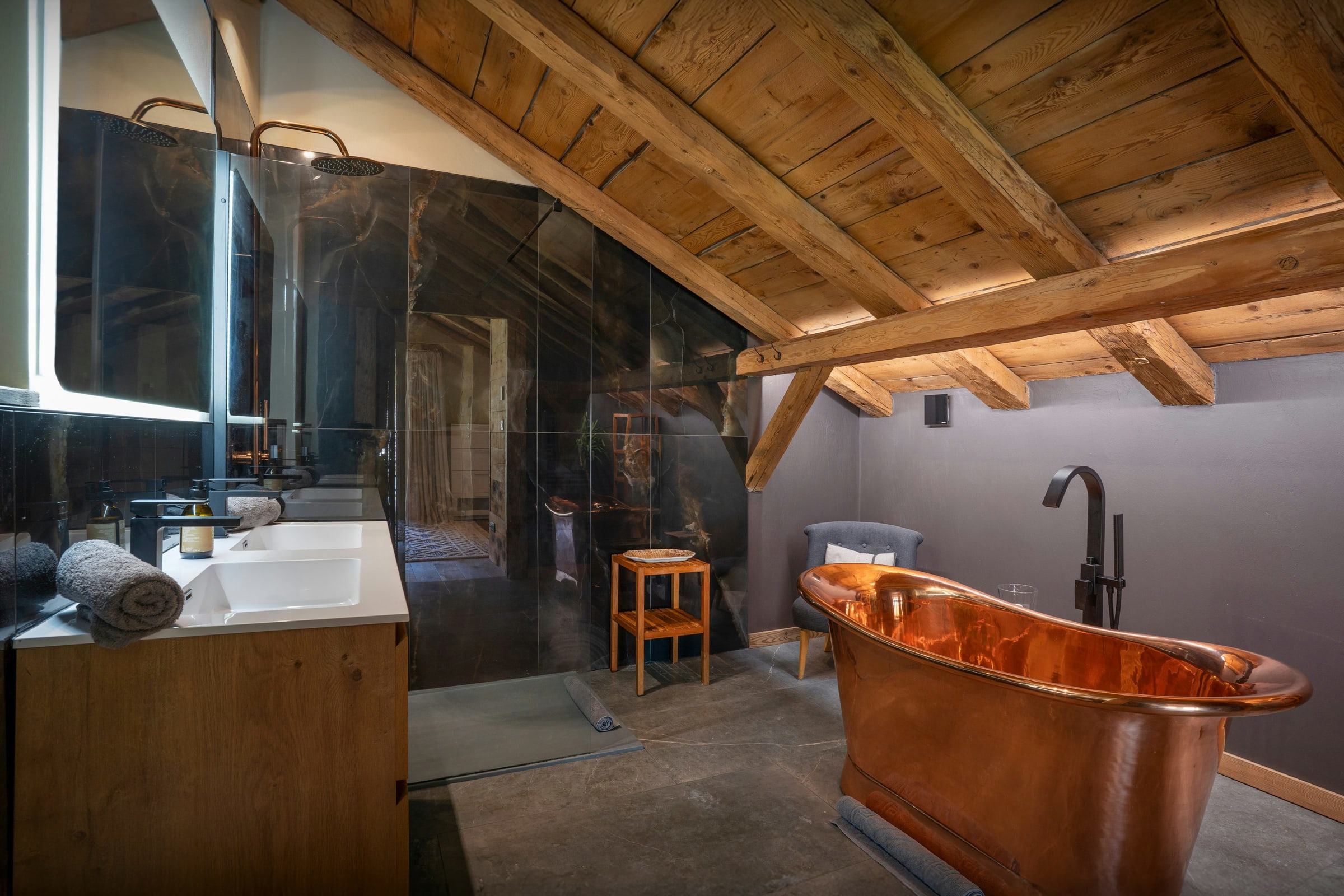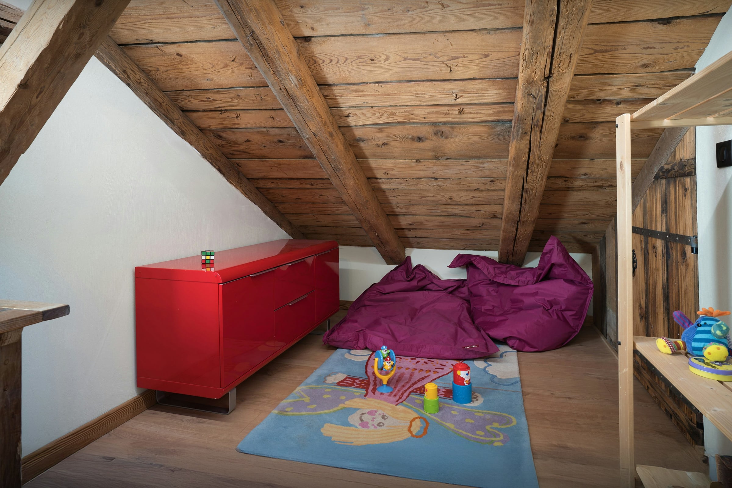 There are three more charming bedrooms under the eaves on the top floor. One of them, a bright double room, has a private balcony and an elegant bathroom with a walk-in shower, as well as two basins and an impressive copper freestanding bath. The children's room has a set of bunk beds, a desk and a play area.