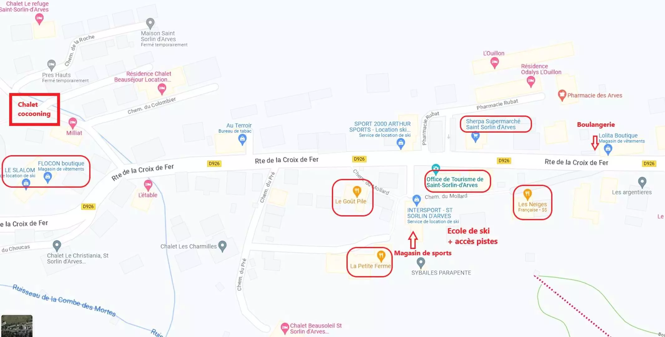 The chalet is located on the "Chemin de la Sapinière" in St Sorlin d'Arves, less than 300m from the access to the slopes, the ski school and the shops (everything is possible on foot).