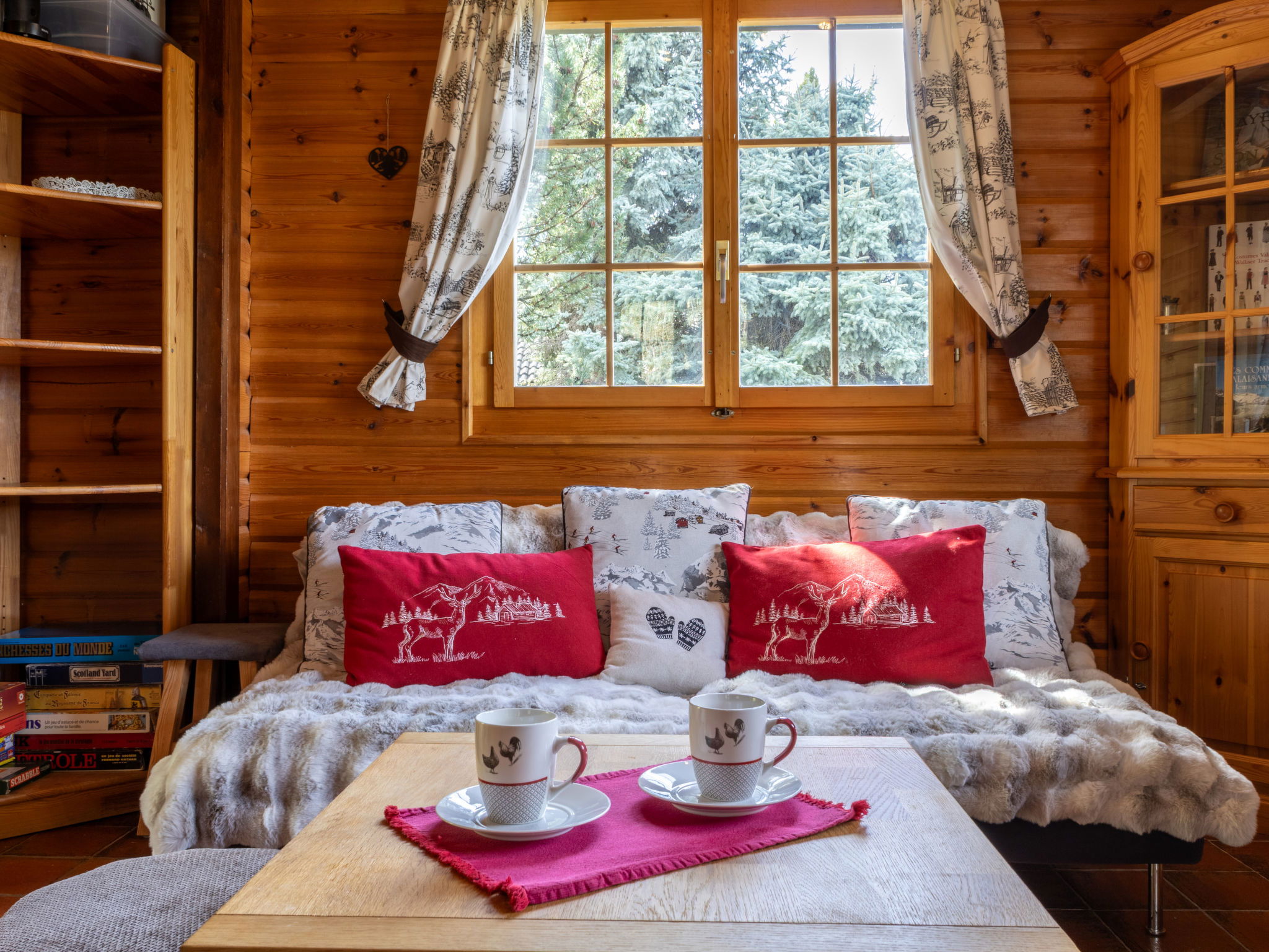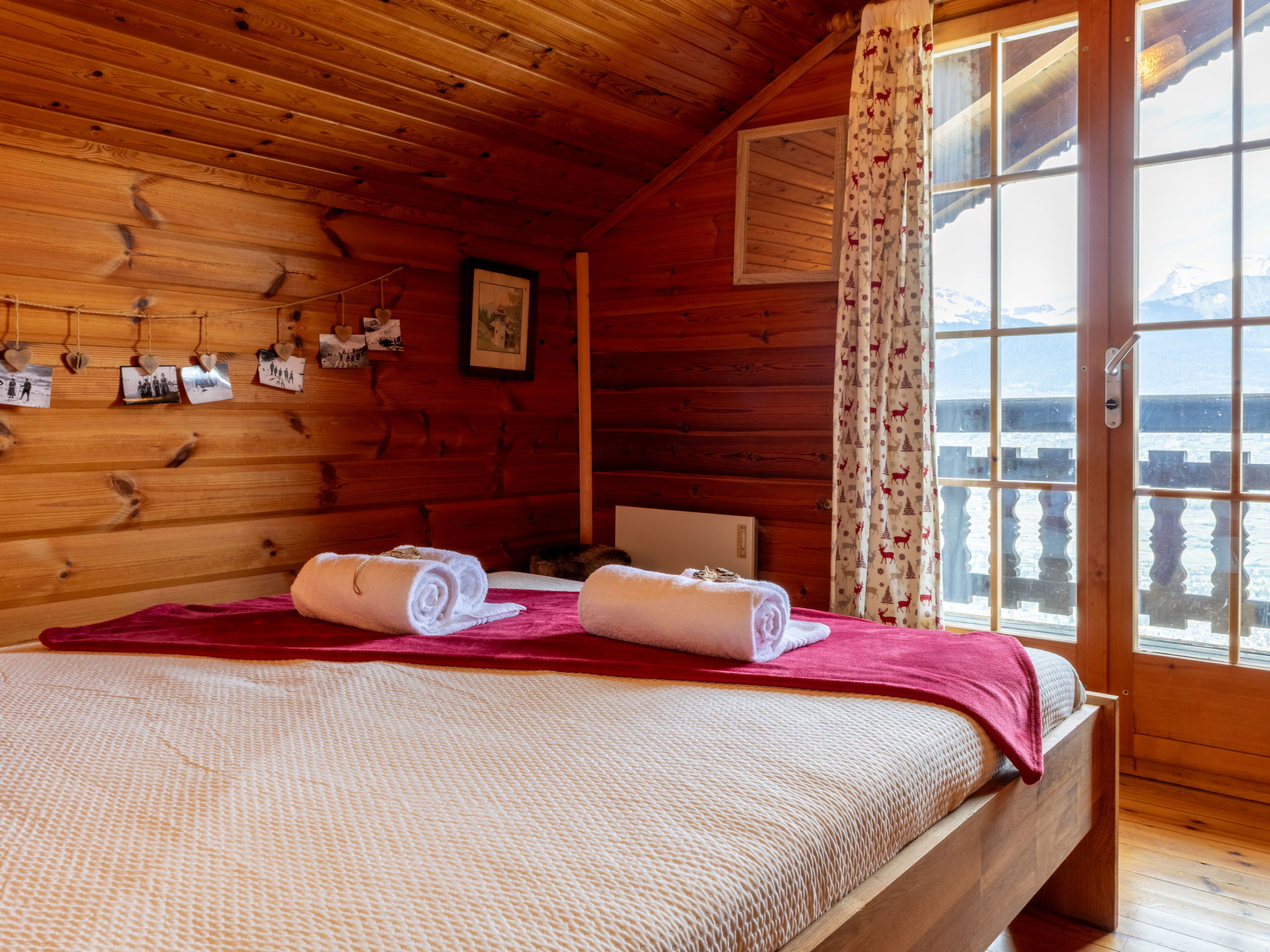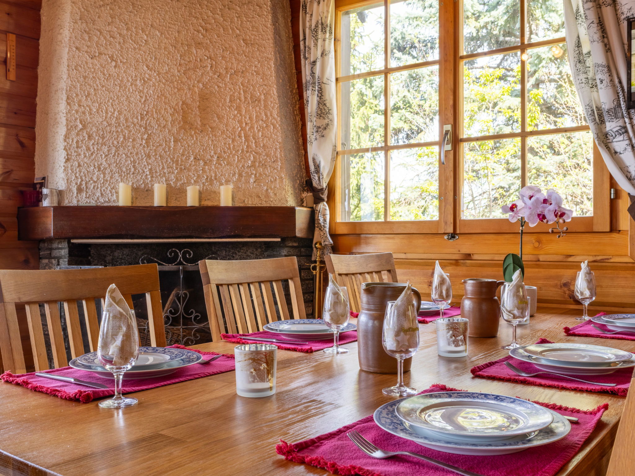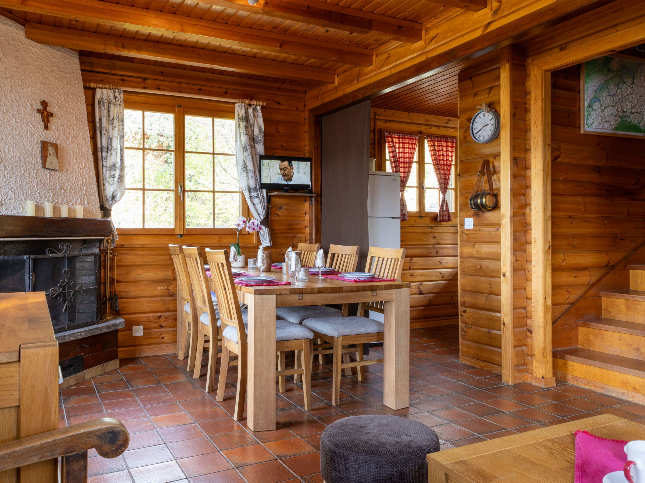 "Chalet Le Trèfle", 5-room chalet 120 m2 on 3 levels. Practical furnishings: living/dining room with open-hearth fireplace. Exit to the balcony, north facing position. Open kitchen (oven, dishwasher, 4 induction hot plates, electric coffee machine, Capsules for coffee machine (Dolce Gusto) extra, raclette grill, fondue Set (cheese)). Sep. WC. Heating. On the lower ground floor: 1 room with 2 beds. Shower, sep. WC. Upper floor: 2 rooms, each room with 2 french beds (140 cm, length 200 cm). Exit to the balcony, north facing position. 1 room with 1 bed (90 cm, length 200 cm). Exit to the balcony, south facing position. Bath/WC. Balcony, garden 400 m2. Balcony furniture. Very beautiful view of the mountains and the valley. Facilities: washing machine. Parking. Please note: non-smokers only. Maximum 1 pet/ dog allowed. Please note : no WIFI, no TV.