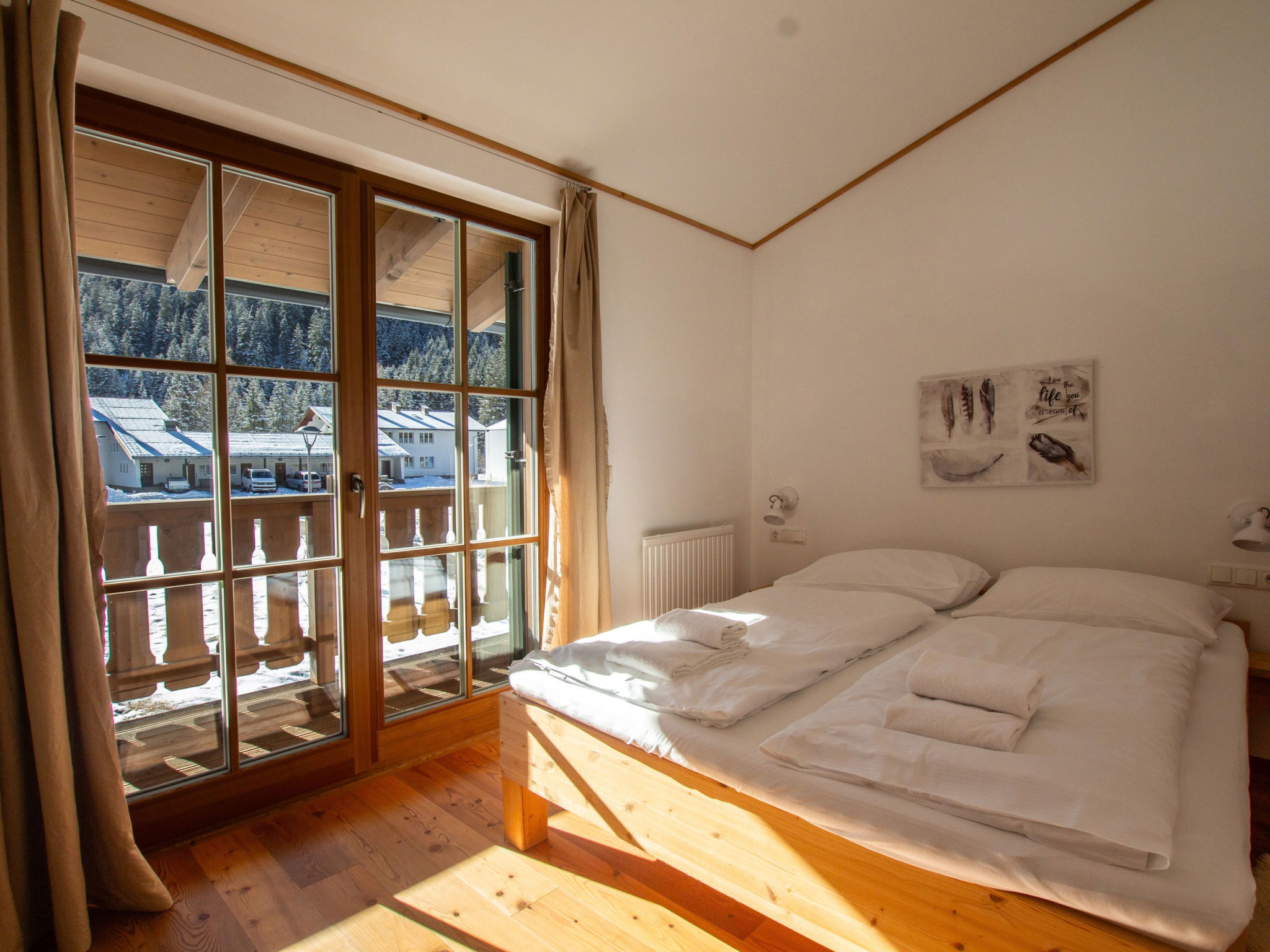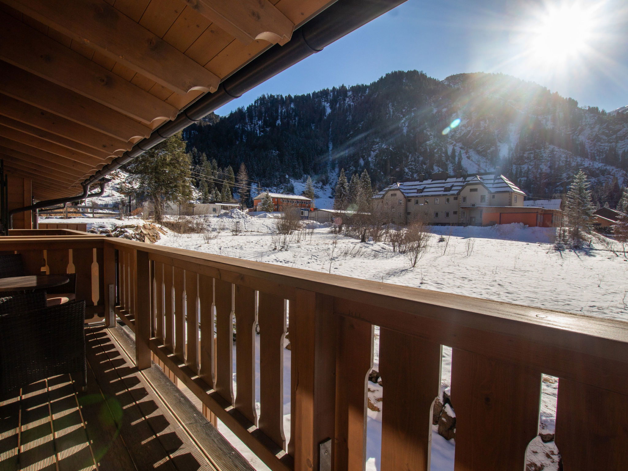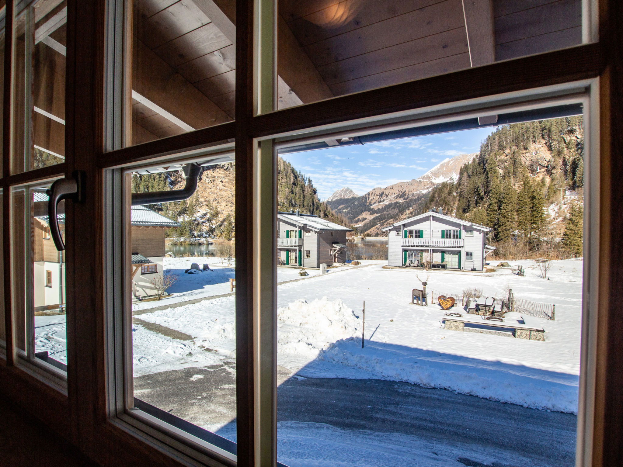 "Lodge kleiner Bär 191 im Tauerndorf Enzingerboden", 3-room chalet 66 m2. Object suitable for 6 adults. Living room with 1 sofabed, 1 pull-out bed, open-hearth fireplace and TV. 1 room with 1 double bed. 1 room with 1 double bed. Open kitchen (4 hot plates, oven, dishwasher, kettle, electric coffee machine). 2 showers/WC, 2 sep. WC's. Balcony, terrace 20 m2. Barbecue. View of the lake and the mountains. Facilities: hair dryer. Internet (WiFi, free). Please note: non-smokers only. Maximum 1 pet/ dog allowed. 50624-000671-2024