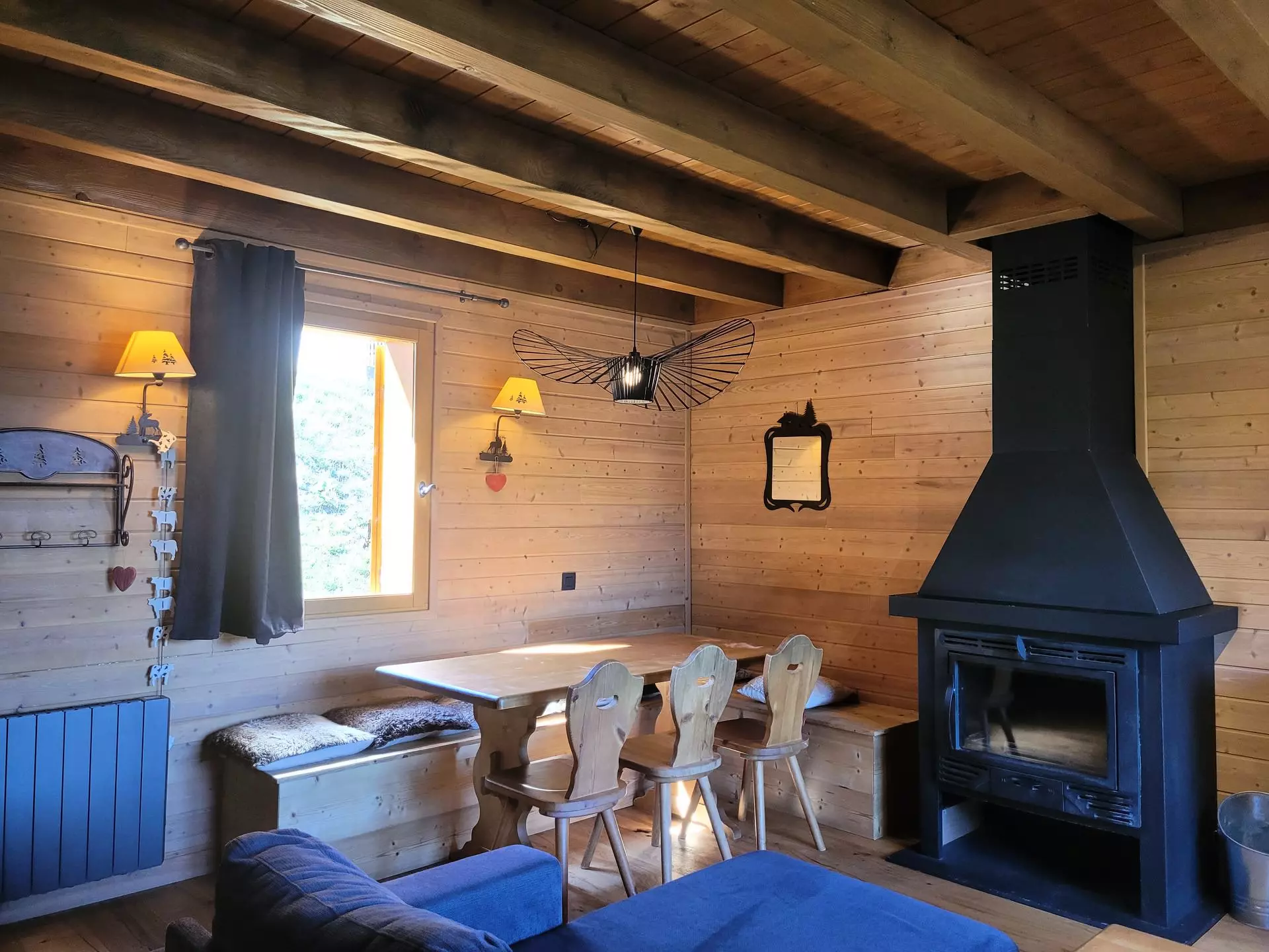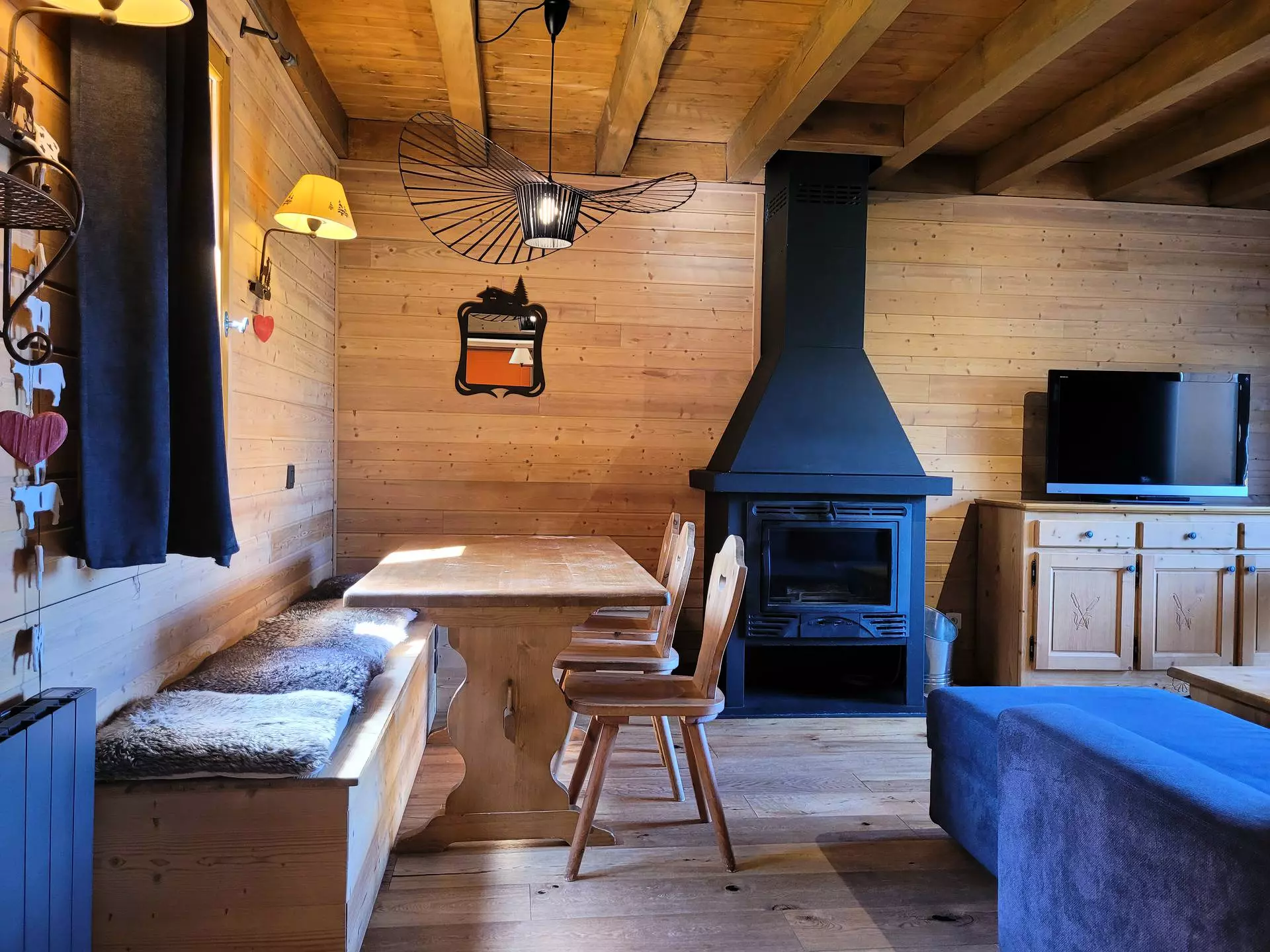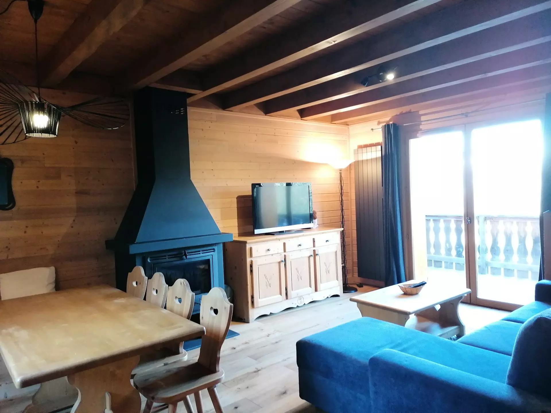 * Living room with 2-person sofa bed, blankets, HD TV, fireplace insert, beautiful wooden furniture, terrace access.