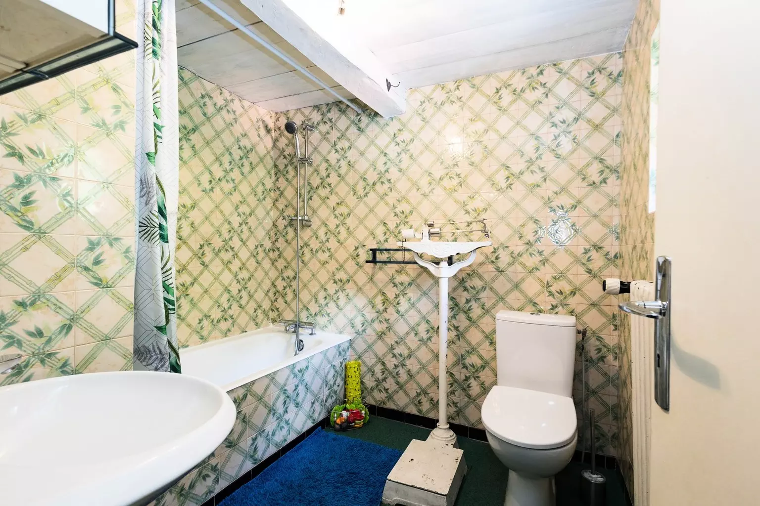 Bathroom (Level +1): sink, bathtub, hairdryer and toilet.