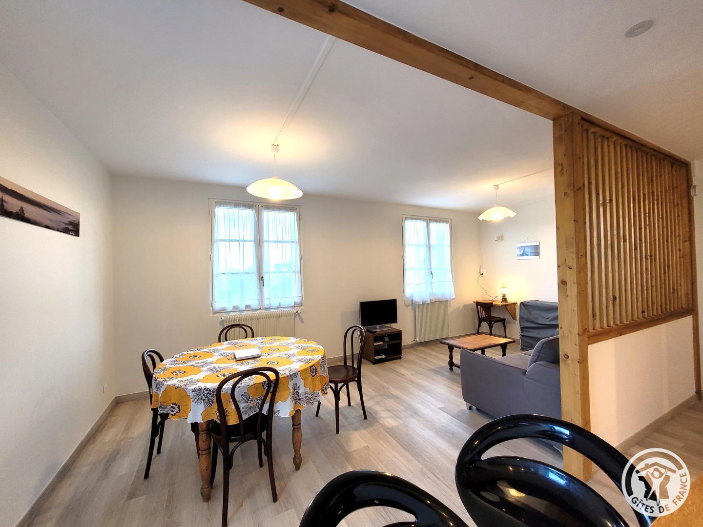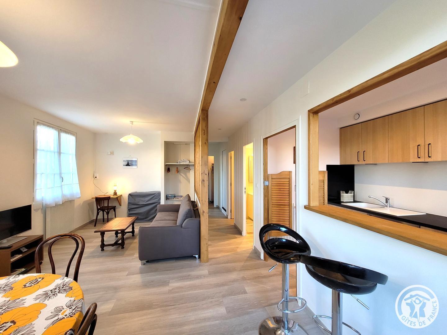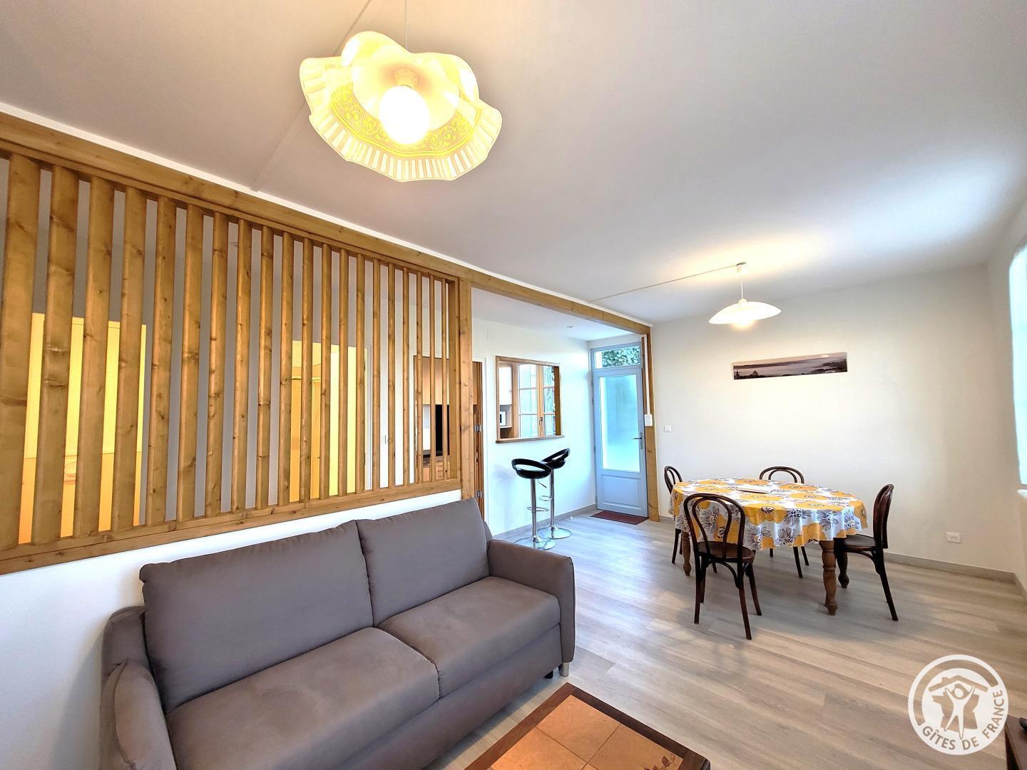 A living room with fitted and equipped kitchen, dining room area and lounge area with sofa bed that can accommodate 2 people, a bedroom with 140x190 bed, a shower room and a separate toilet.