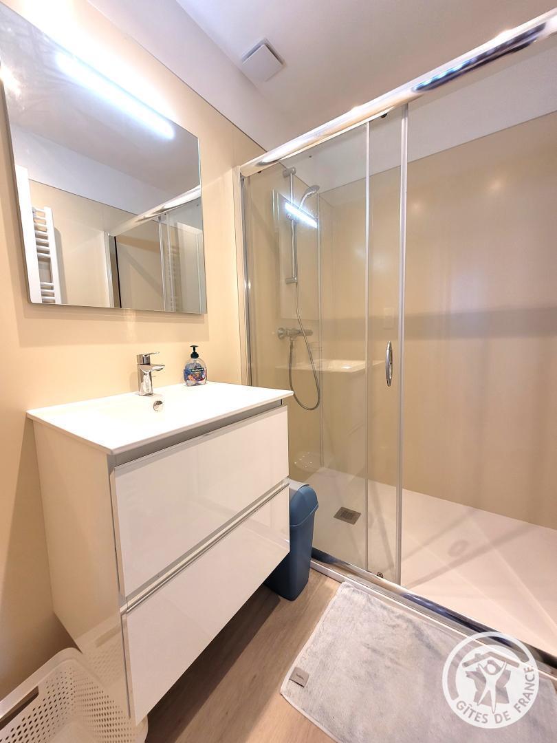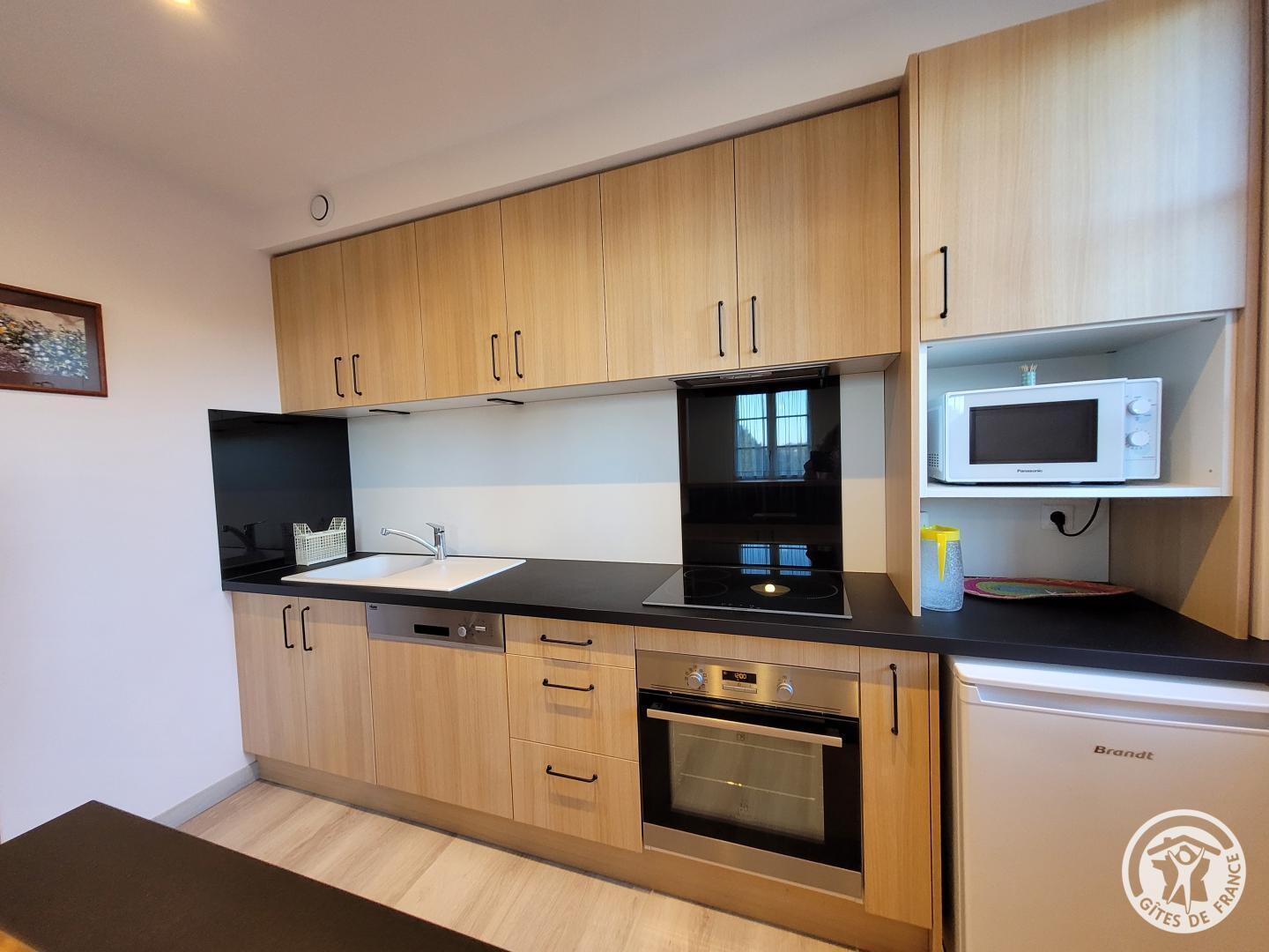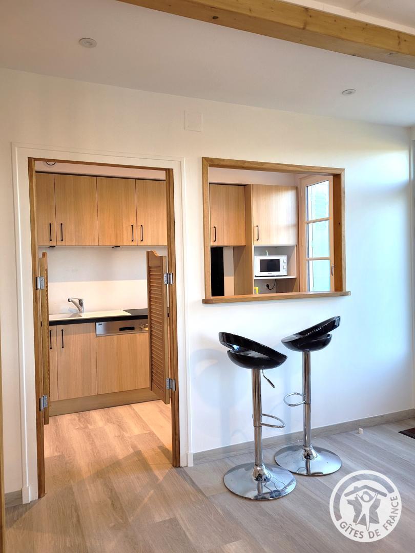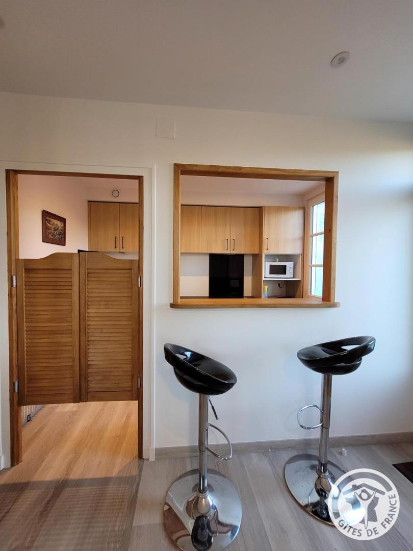 A living room with fitted and equipped kitchen, dining room area and lounge area with sofa bed that can accommodate 2 people, a bedroom with 140x190 bed, a shower room and a separate toilet.