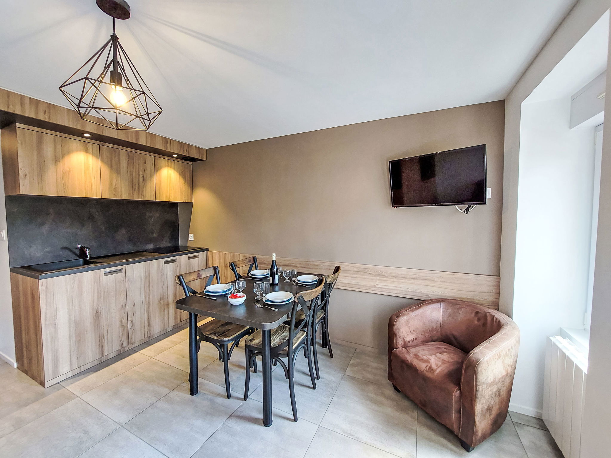 "T3-Résidence La Carquois", 3-room terraced house 45 m2 on 2 levels. Fully renovated, beautiful furnishings: living room with TV. Exit to the terrace. Kitchenette (dishwasher, 3 induction hot plates, toaster, kettle, freezer, electric coffee machine, combination microwave). Shower/WC. Upper floor: 1 room with sloping ceilings with 1 french bed (160 cm, length 200 cm). 1 room with sloping ceilings with 2 beds (90 cm, length 190 cm). Electric heating. Terrace 15 m2. Terrace furniture. Facilities: children's high chair, baby cot (extra). Internet (WiFi, free). Please note: maximum 1 pet/ dog allowed. Smoke alarm. Offer by a commercial proprietor according to Art. 155, IV, CGI