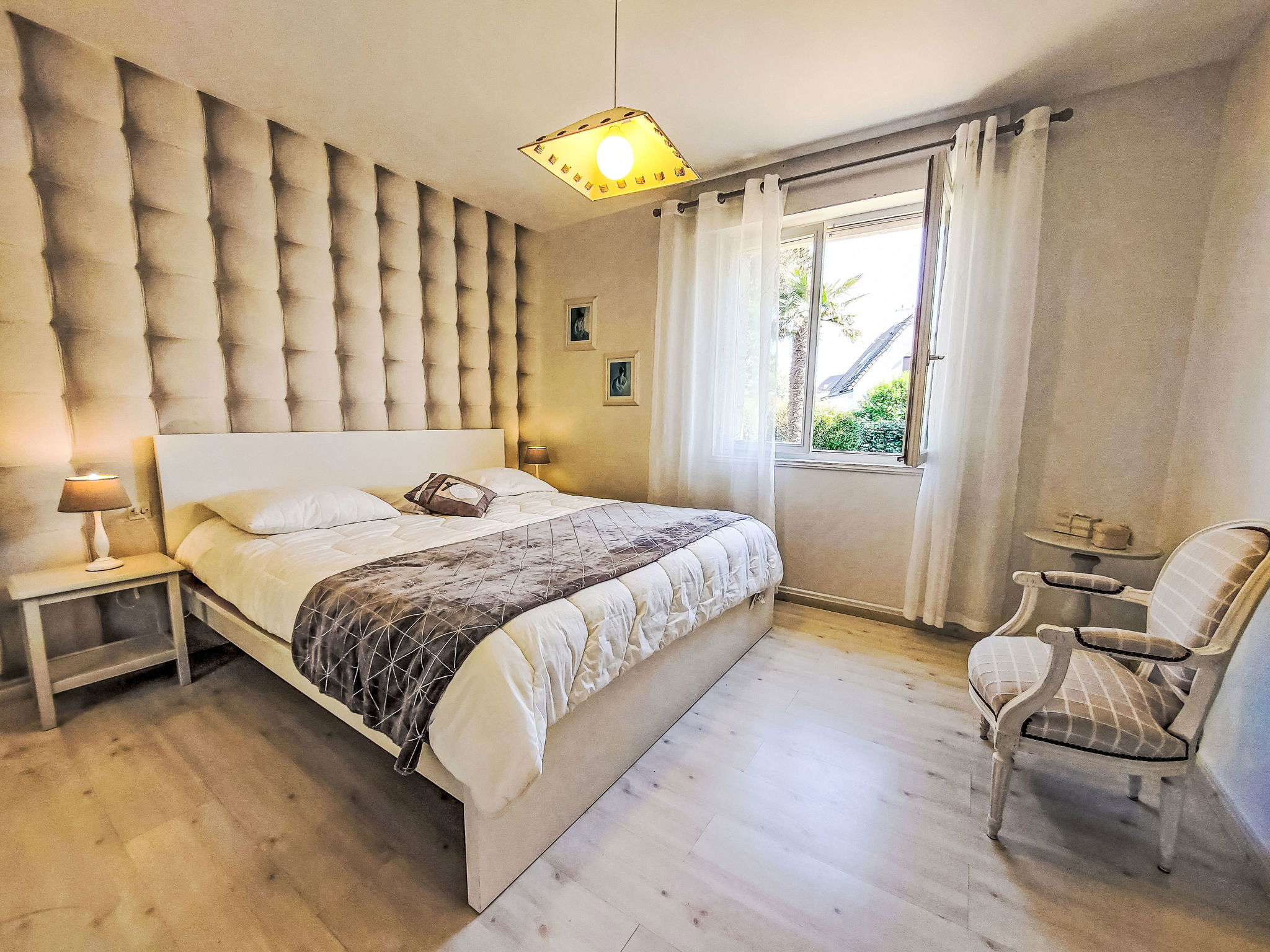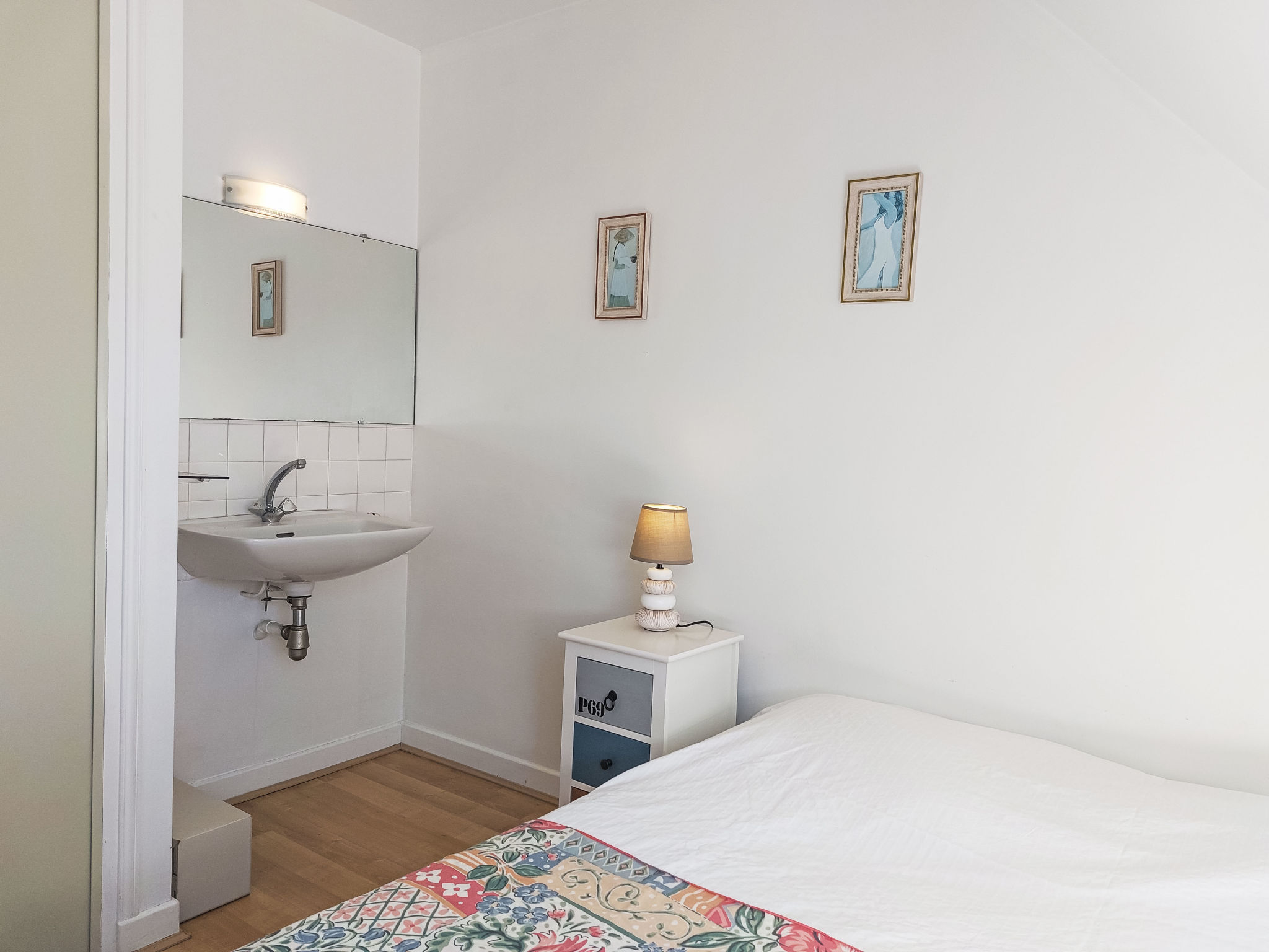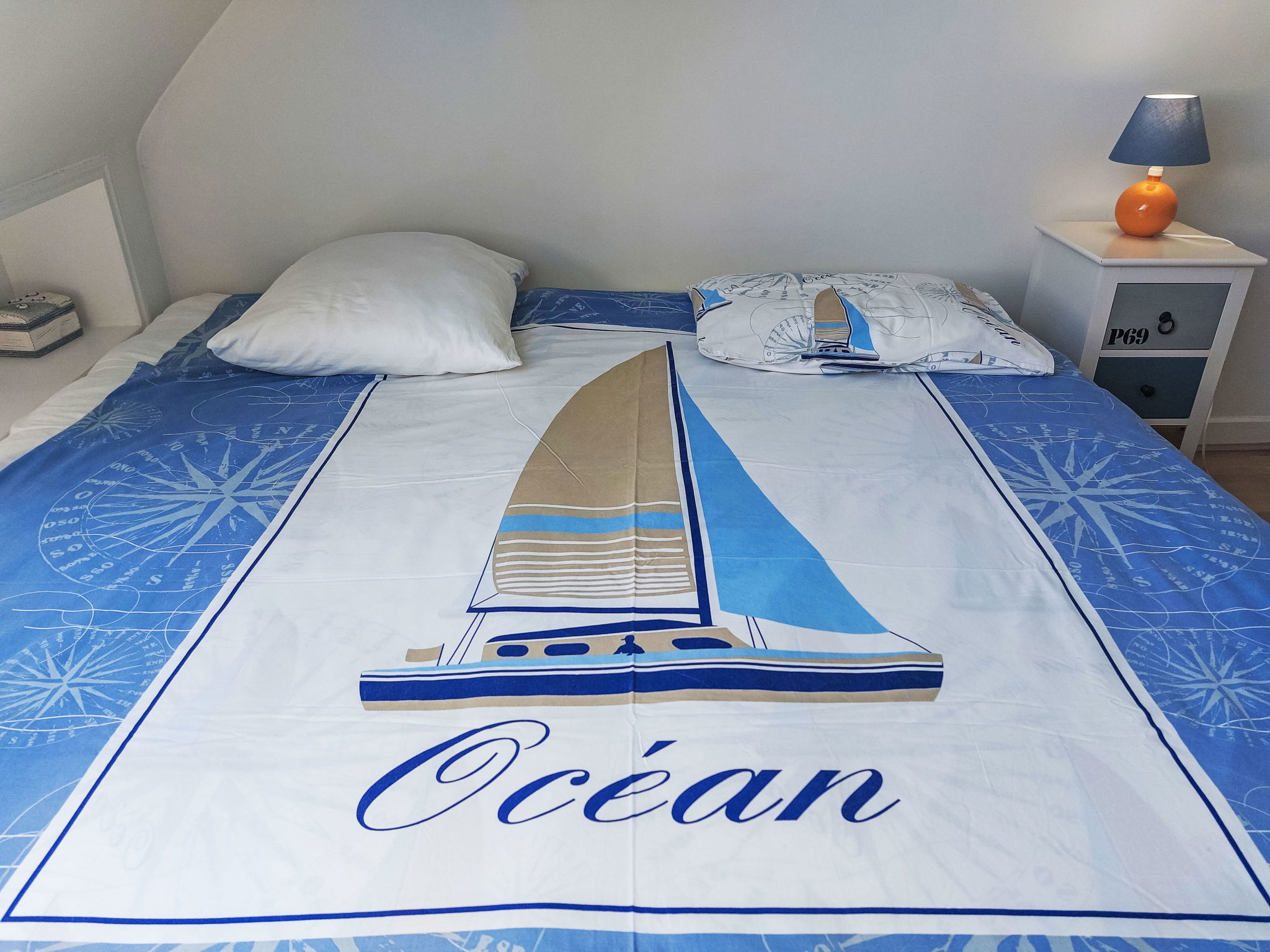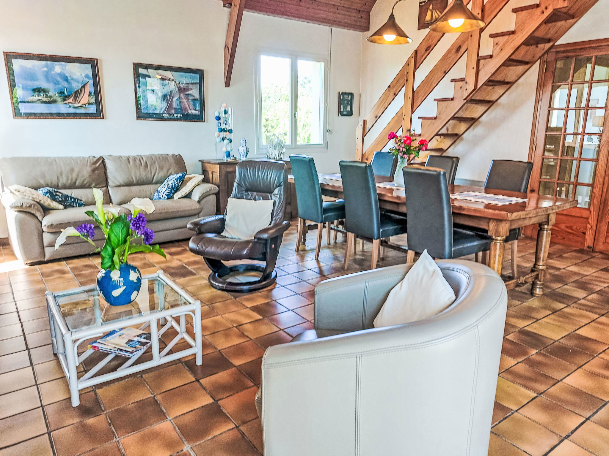 "Les Courlis", 4-room house 110 m2 on 3 levels. Beautiful and cosy furnishings: living/dining room with open-hearth fireplace (only for decoration), dining table, satellite TV and DVD. Exit to the terrace. 1 room with 1 french bed (180 cm, length 200 cm). Open kitchen (oven, dishwasher, 4 ceramic glass hob hotplates, toaster, kettle, microwave, freezer, electric coffee machine). Bathroom, sep. WC, double hand-basin. On the lower ground floor: shower. Upper floor: 2 rooms with sloping ceilings, each room with 2 beds (90 cm, length 190 cm). Electric heating. Terrace. Terrace furniture, barbecue (portable), deck chairs (4). Facilities: washing machine, dryer, iron, children's high chair, baby cot. Internet (WiFi, free). Please note: non-smoking house. Maximum 1 pet/ dog allowed. Smoke alarm.
