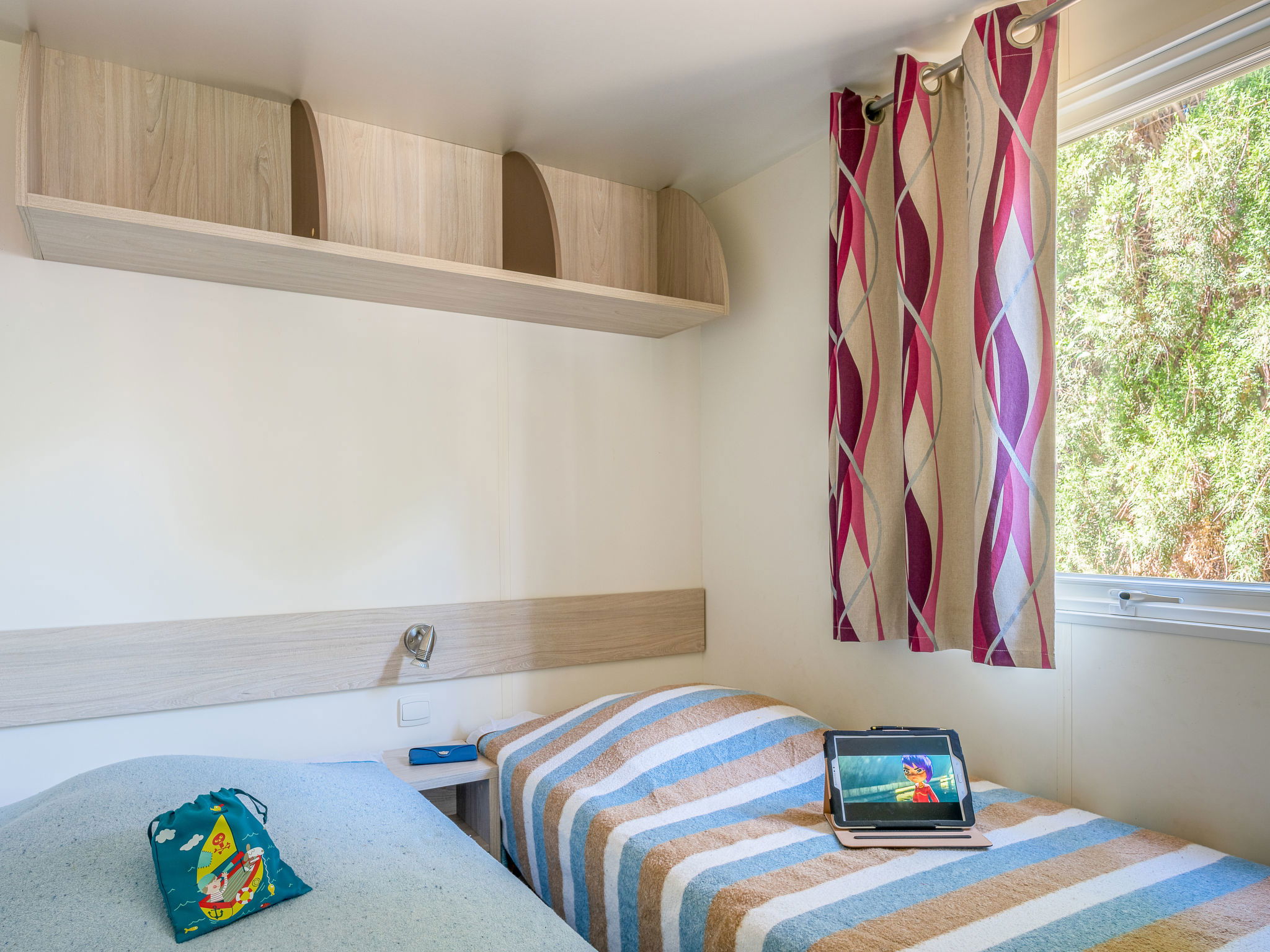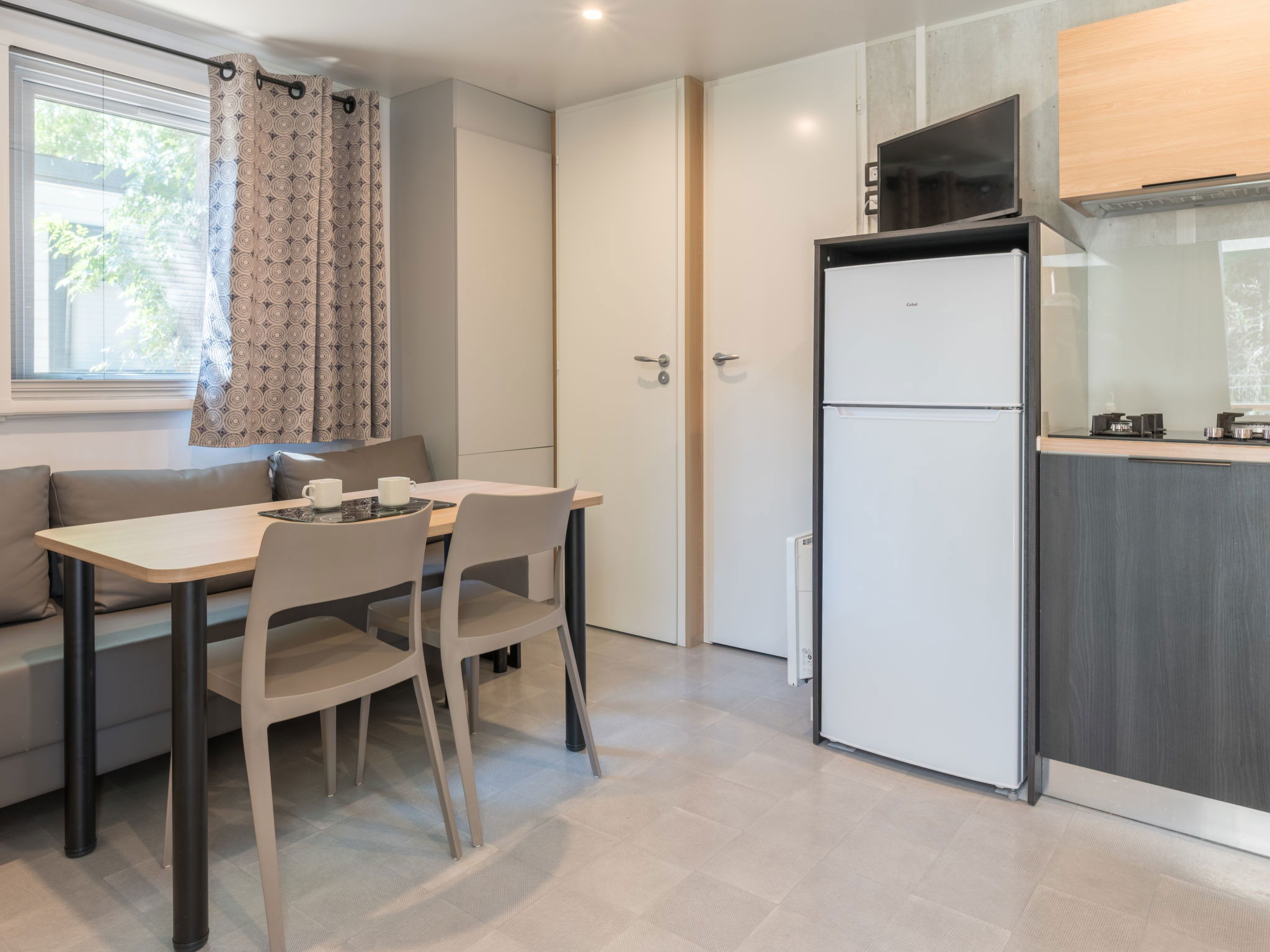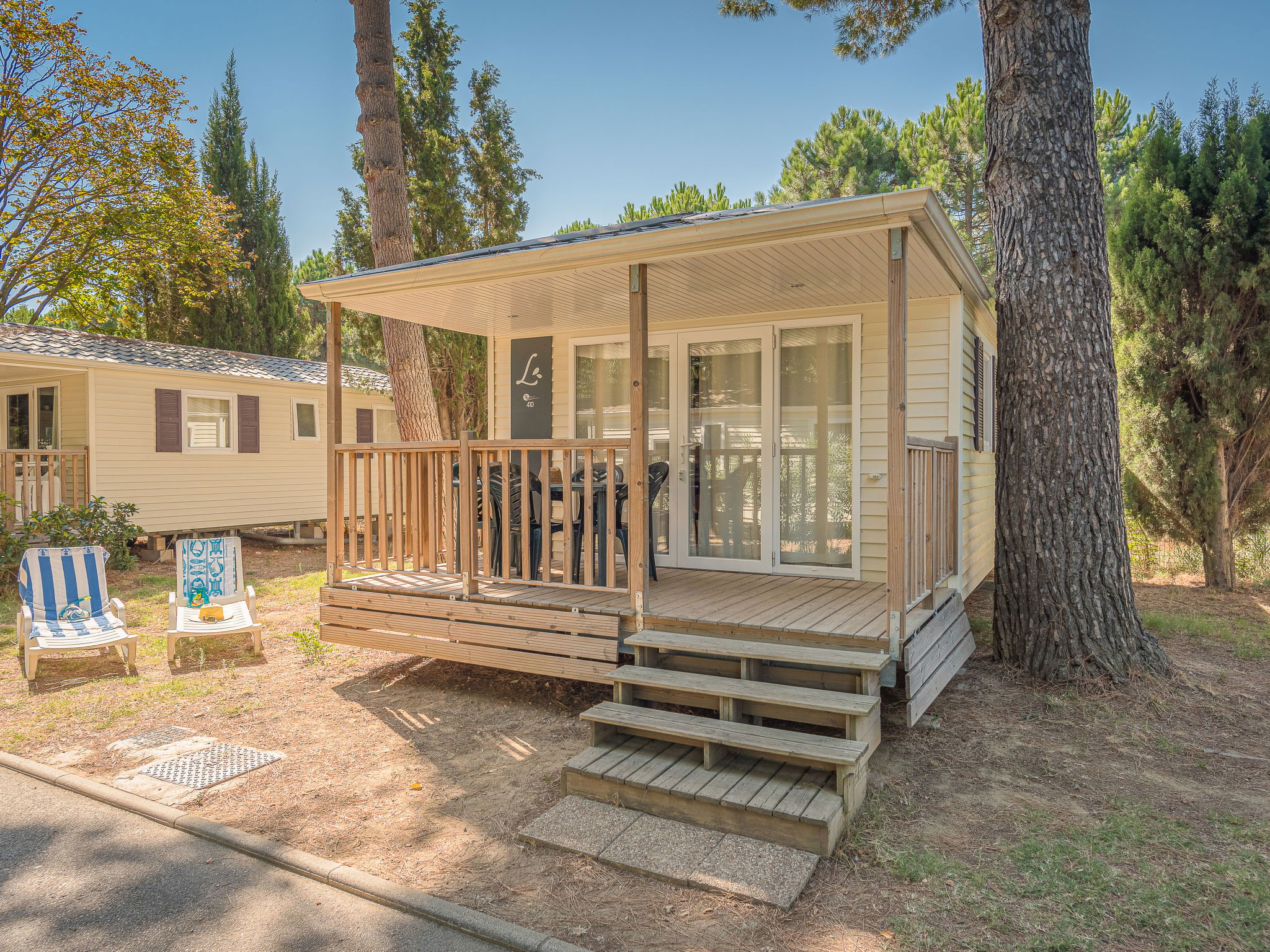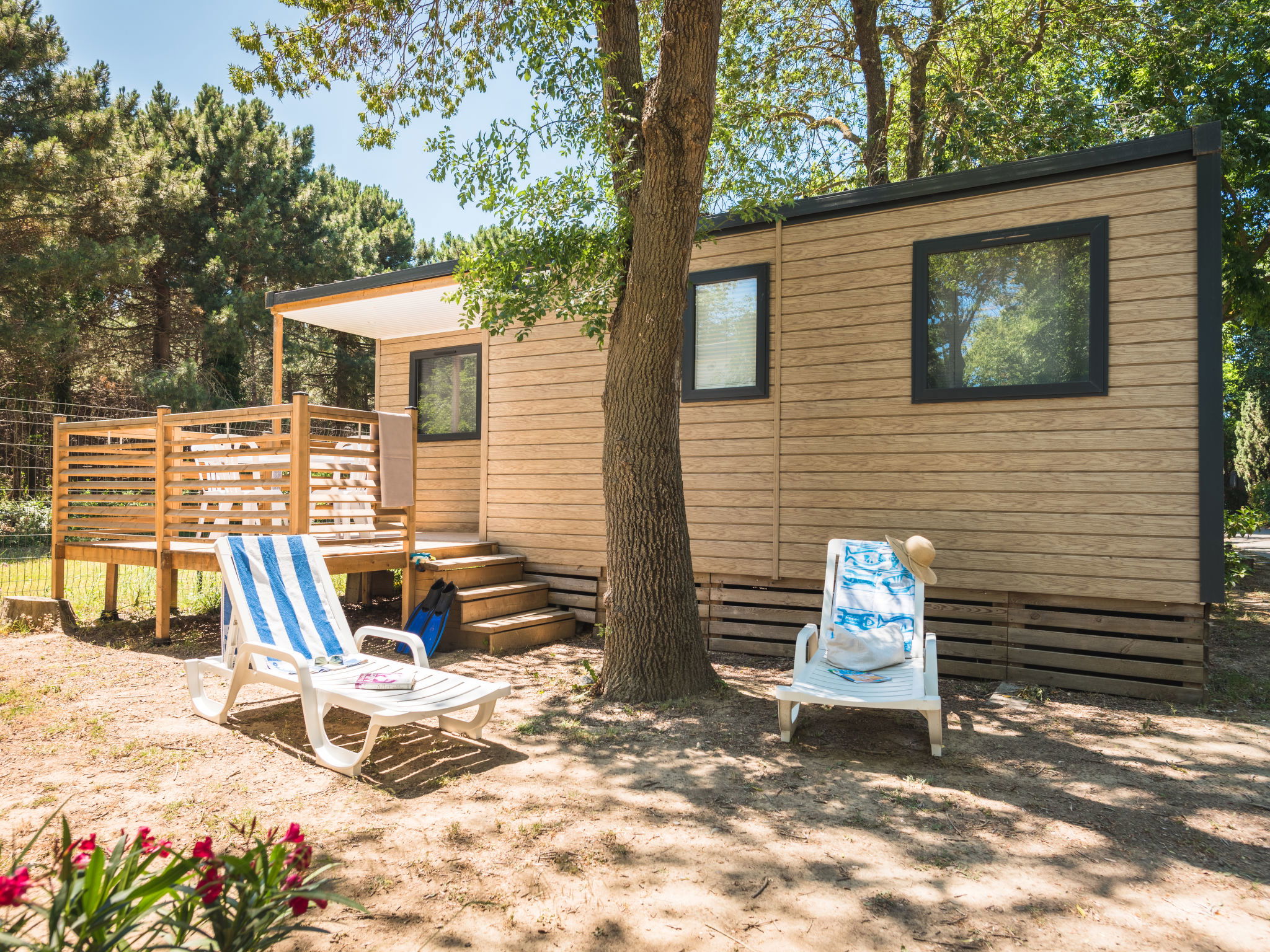 "Le Mediterranée", 3-room mobile home 35 m2. Comfortable furnishings: living/dining room with dining table and TV (flat screen). Exit to the terrace. 1 room with 1 french bed (140 cm, length 190 cm). 1 room with 2 beds (80 cm, length 190 cm). Open kitchen (4 gas rings, microwave, freezer, electric coffee machine). Shower, sep. WC. Air-conditioning, forced-air heating. Terrace partly roofed. Terrace furniture, deck chairs (2). Facilities: children's high chair, baby cot for up to 2 year olds (extra). Internet (WiFi, extra). Please note: maximum 1 pet/ dog allowed. Smoke alarm.